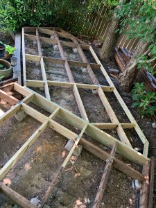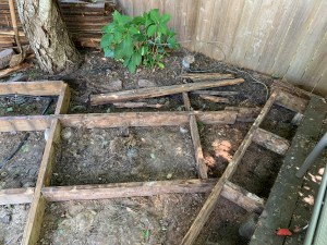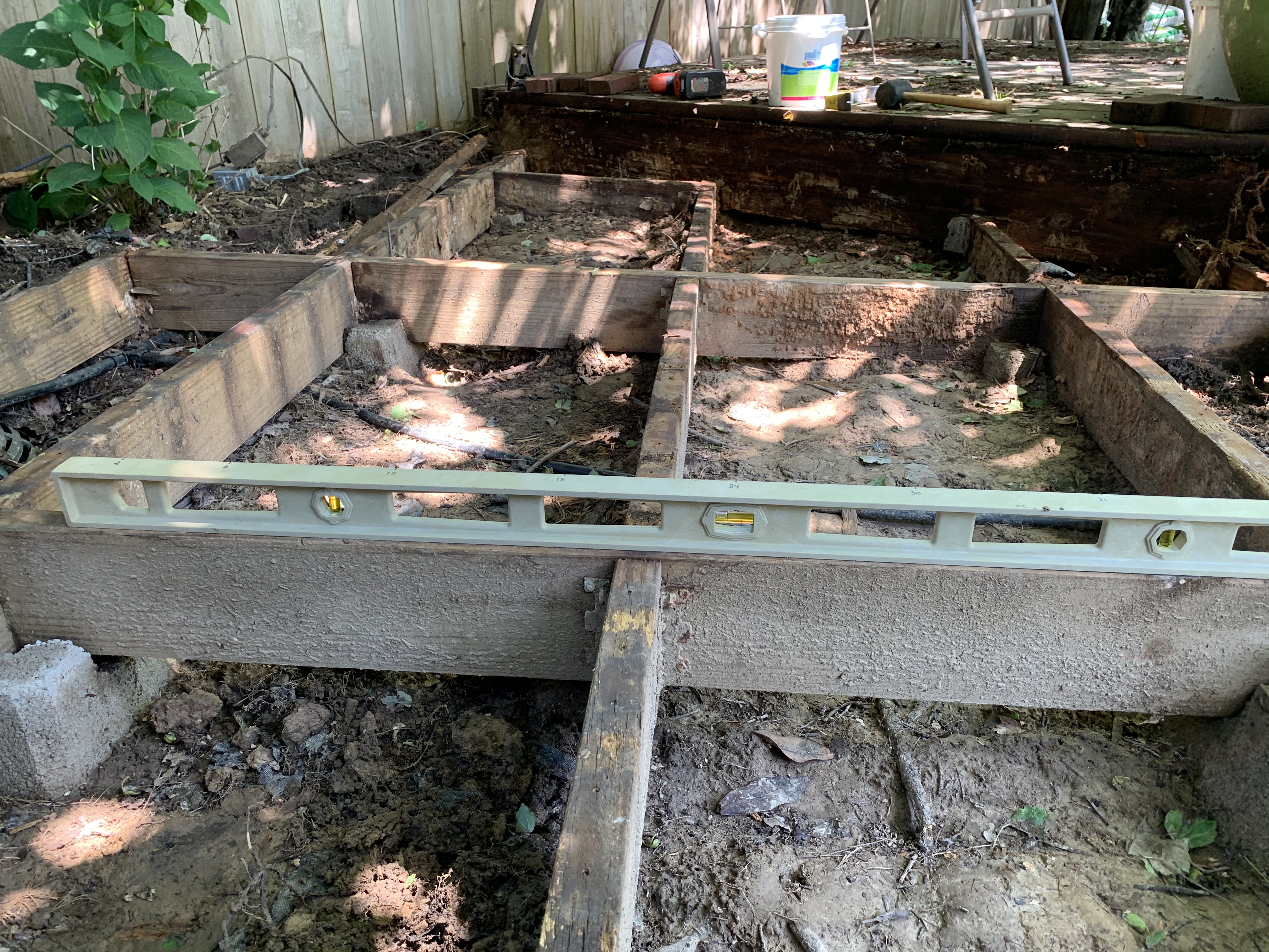 Knowing I would be replacing the parts of the frame that had rotted, I decided the first order of business was to get the still sound-part of the frame back level. After digging out the pavers that had raised up the deck, I found that reinstalling the frame into the slots on the concrete supports was not going to be as easy as it seemed as the blocks had been knocked out of plumb, probably from root growth underneath.