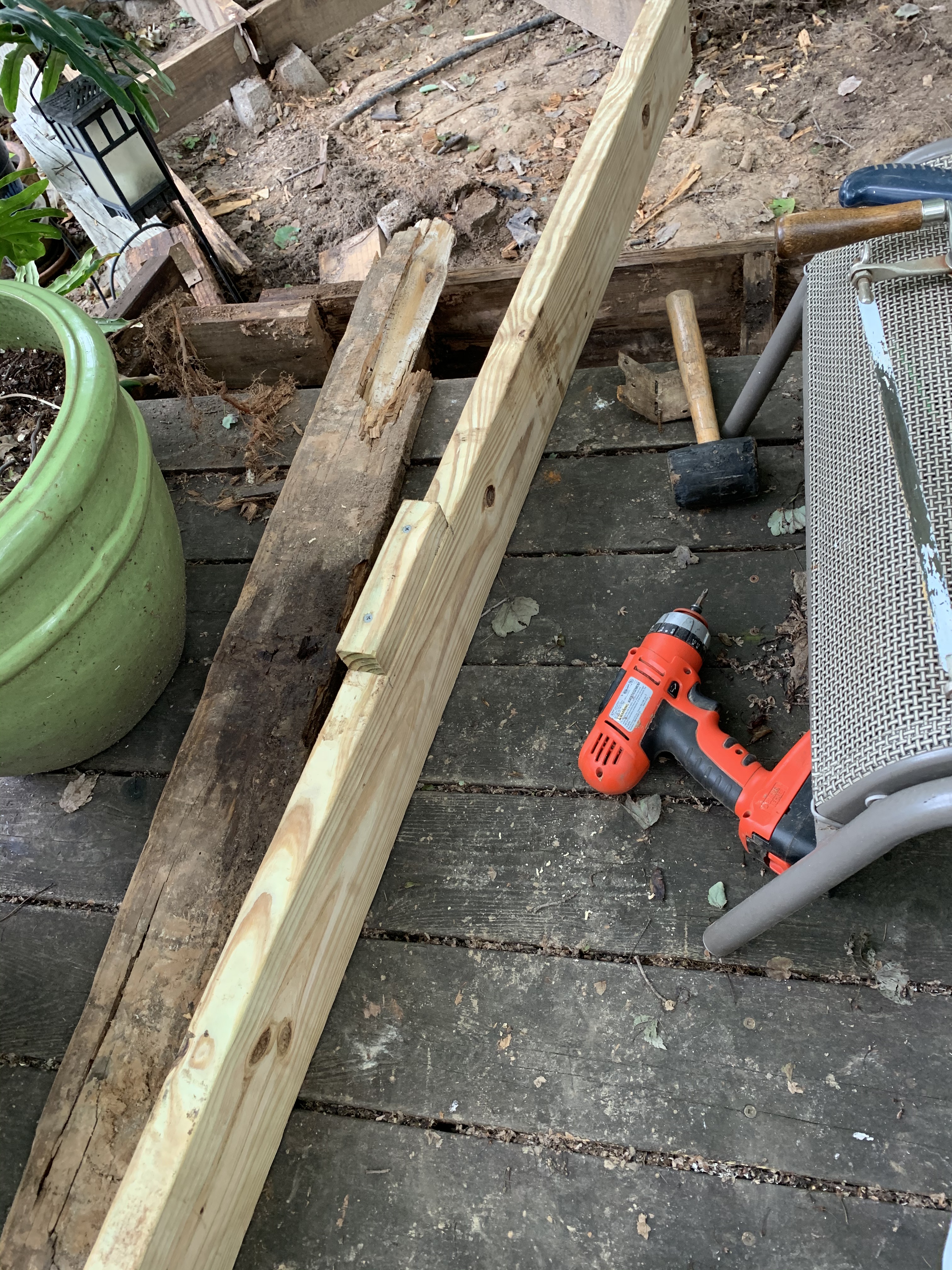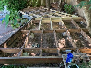 Giving up on that idea, I decided to go ahead and remove the rotted portions of the frame and begin new construction from the other end where the upper and lower decks connected. As I pulled apart some of the frame attached to the upper deck, I found that more of it had rotted than I originally detected. It took a while, but I finally felt I had removed all the rotted portions.