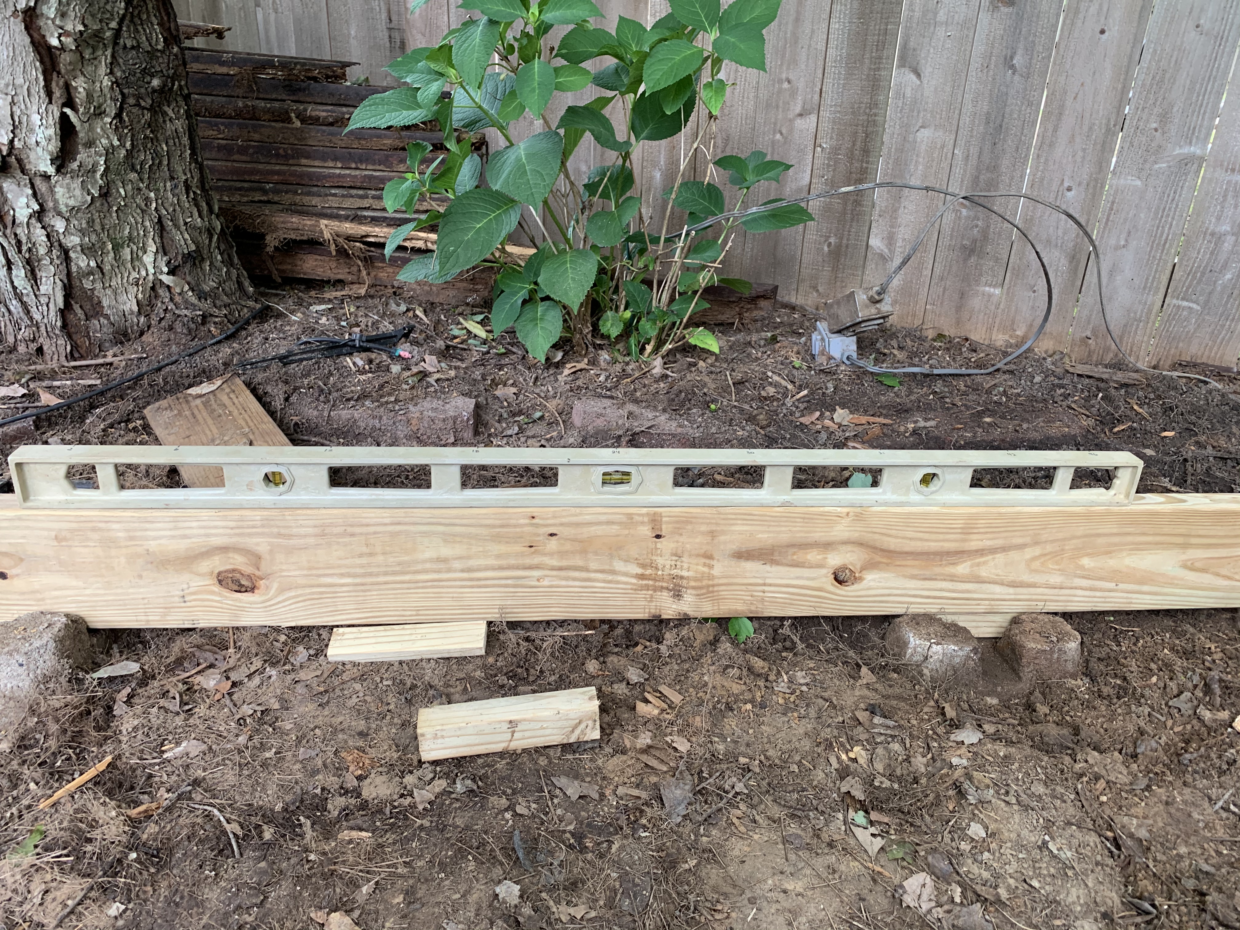 I figured out that raising the 2 X 6 joist by about 1.5 inches would give it plenty of ground clearance and since this was the actual thickness of a nominal 2 X 4 (1.5” X 3.5”), cutting shims of the same size would be easy. I cut about a 6.5” length of 2 X 4 which I then cut two 1.5” thick shims from it and screwed one to the joist where it would rest on the concrete block. Adding a shim to the other concrete block gave me a perfectly level first joist.