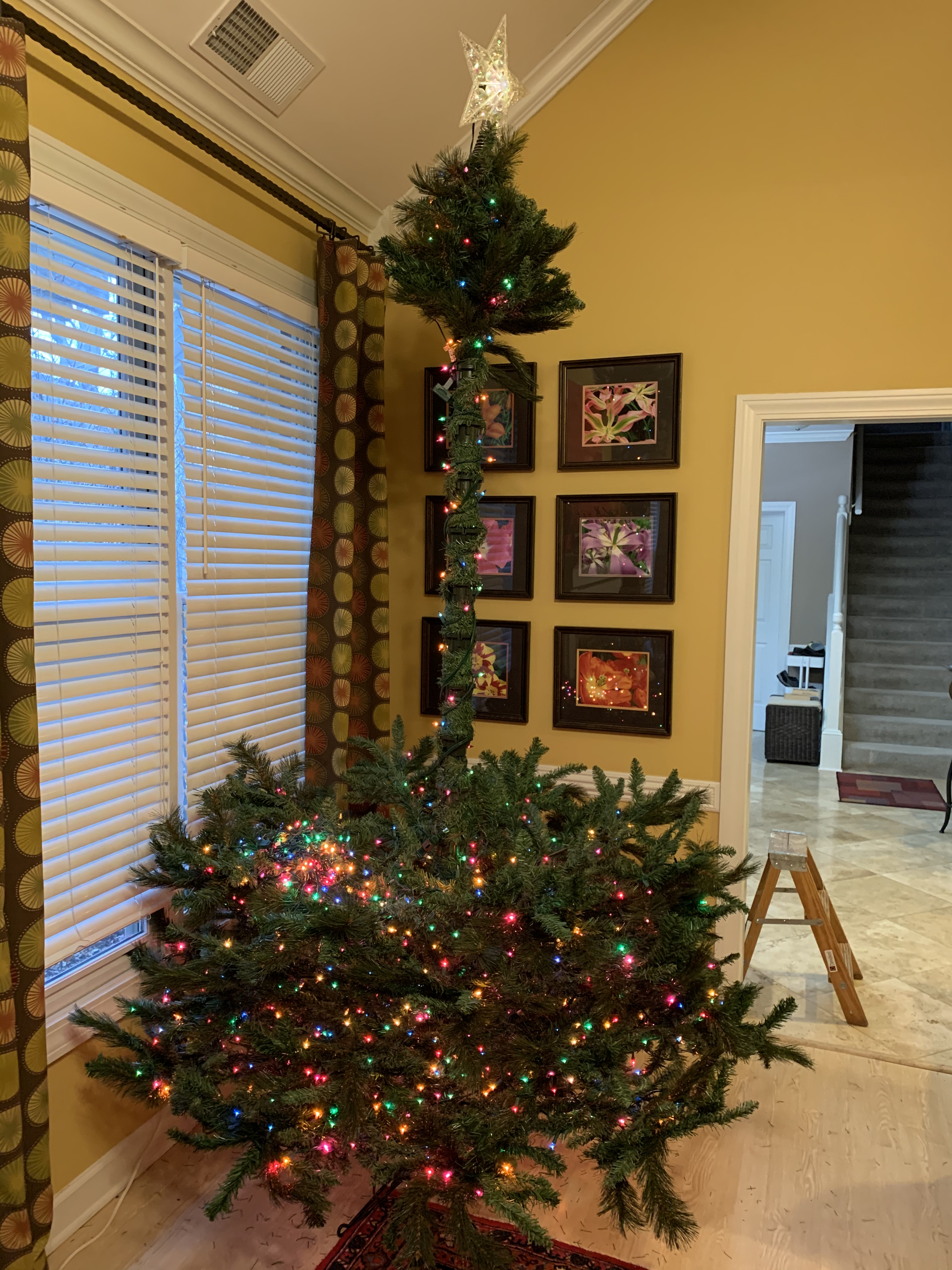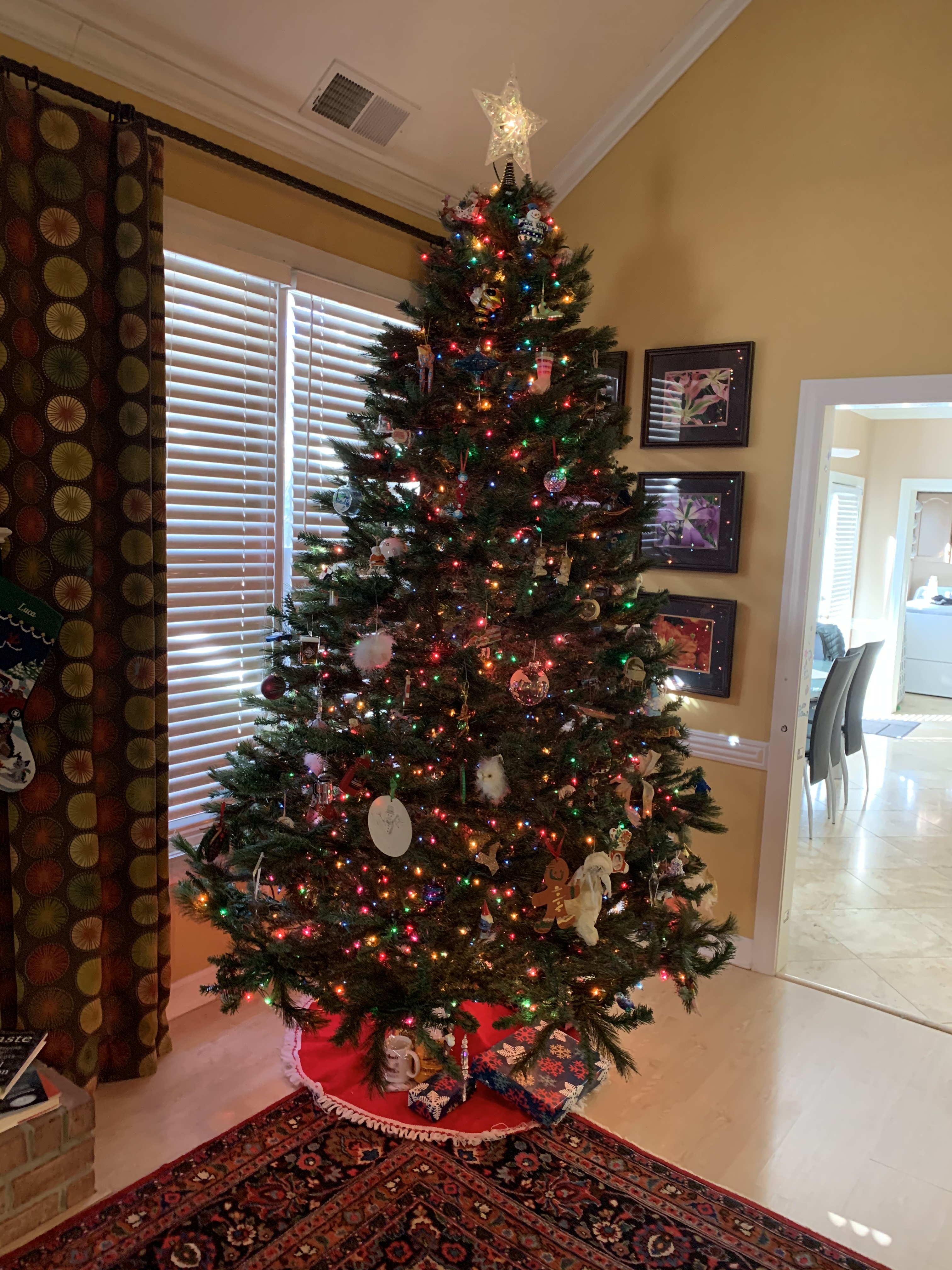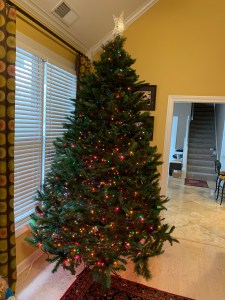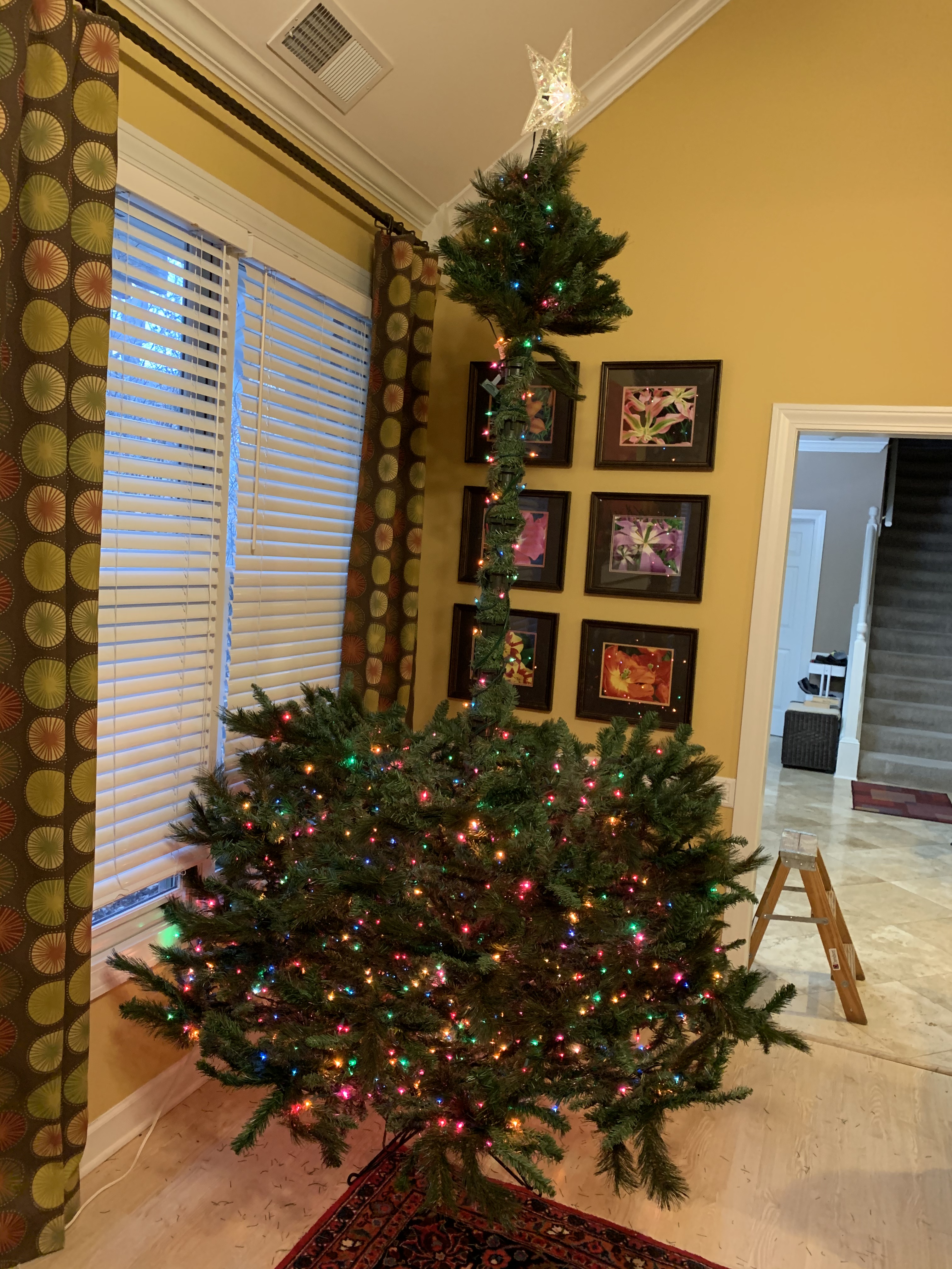 So, this year I didn’t even consider looking for a new tree but rather just picked two days over which I planned to assemble our now 18-year-old tree. As I got started on the Tuesday afternoon after Thanksgiving, I remembered what a task it was to put together. But I powered through it and before the day was out, had about half of it assembled. When my wife walked in and saw my progress, she just thought it looked like a colorful ostrich (I must say I never thought that).