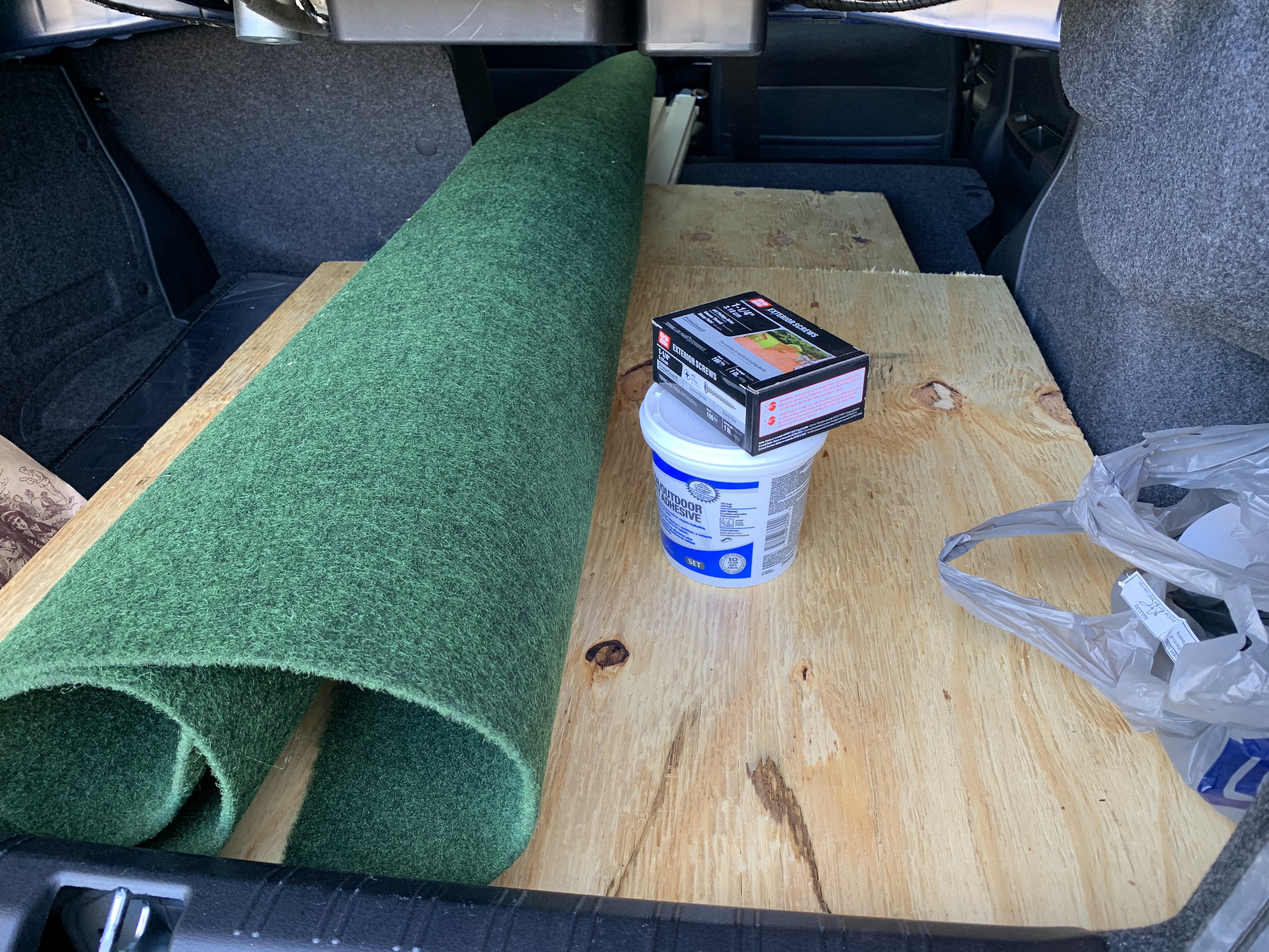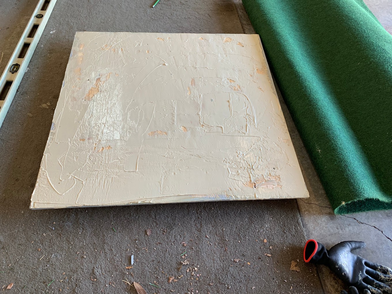 With the tabletop finished, the last step involved gluing the carpet to the top of the plywood. I purchased indoor/outdoor carpet glue and spread it with a trowel. I tried to lay down the carpet so I would only have two edges to trim but once the carpet hit the glue, it was almost impossible to move it slightly to achieve a perfect alignment.