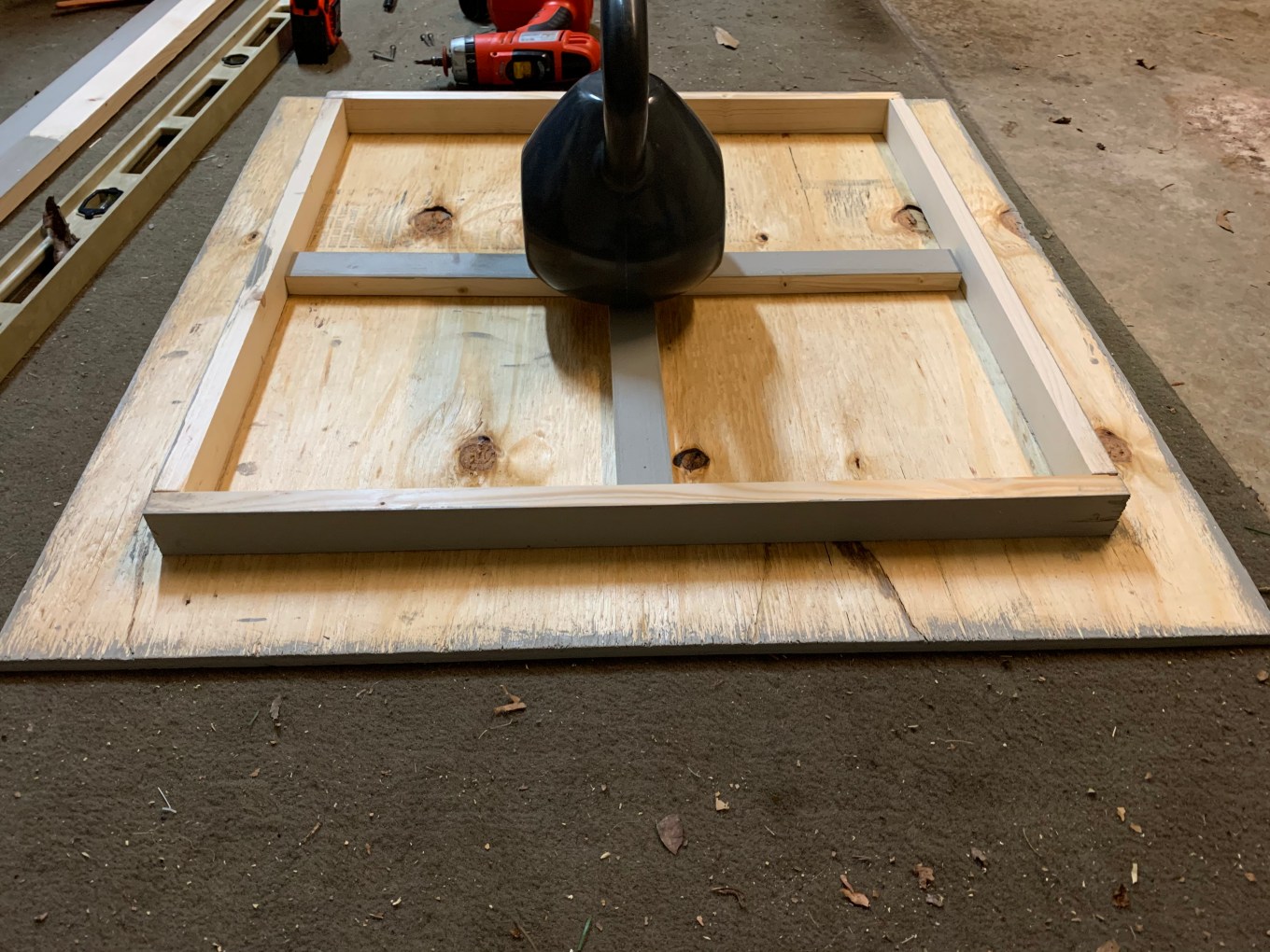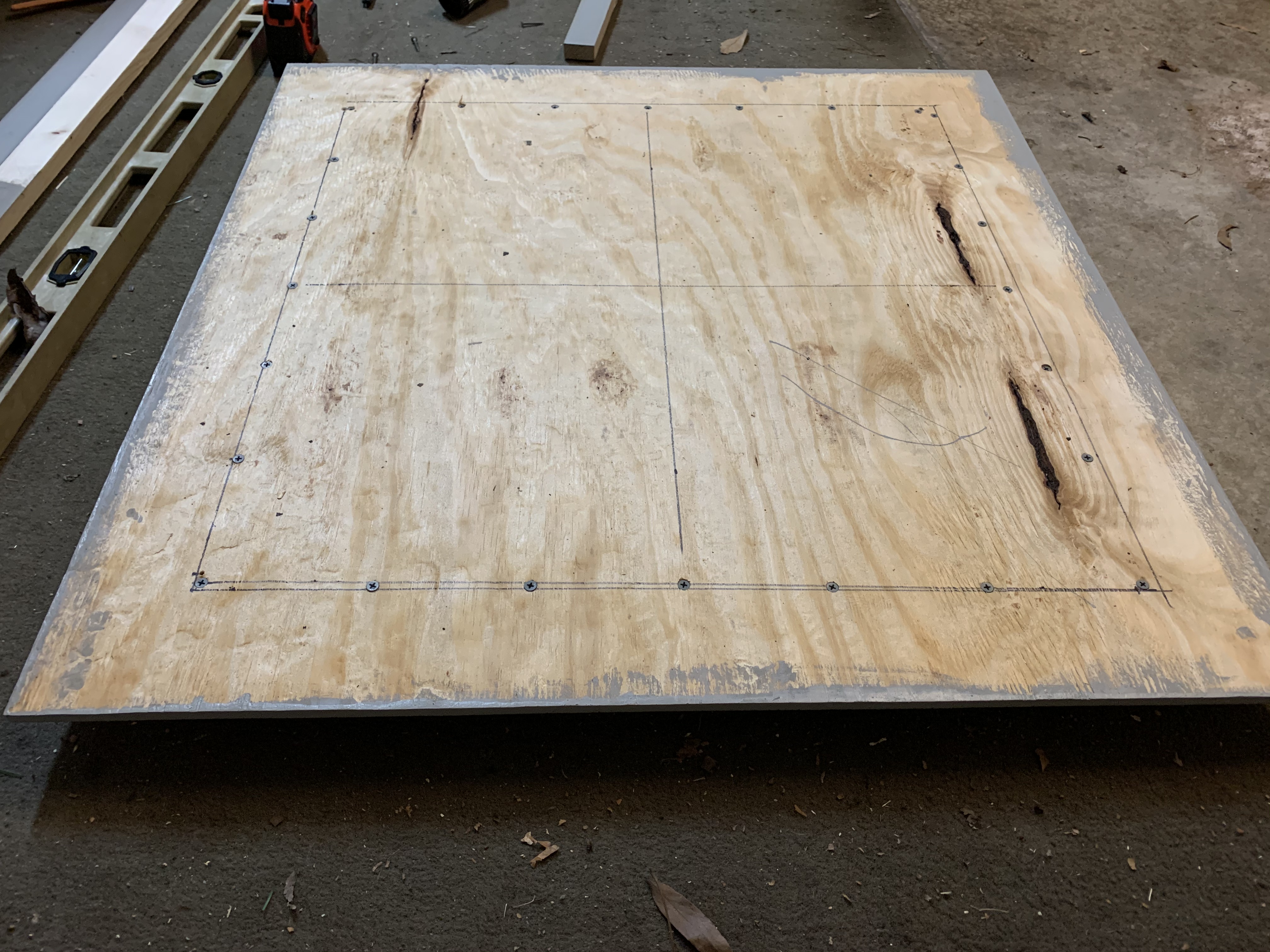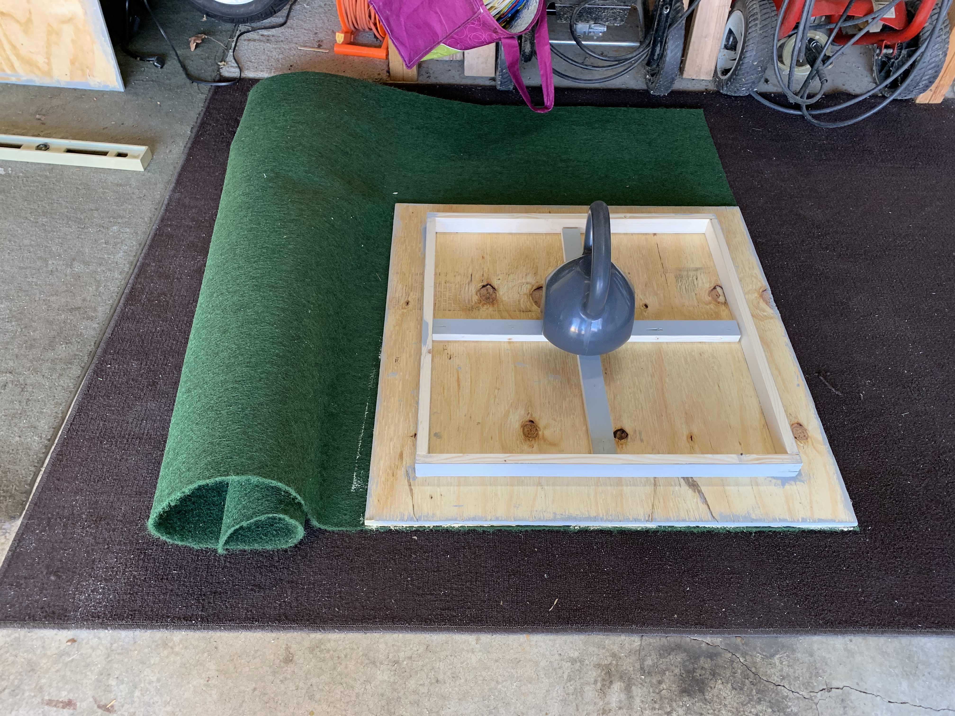 I marked out a 24-inch square on the bottom of the plywood and then glued the side frames in place prior to screwing them down. I took this approach because I wanted the screw heads to be on the top eventually hidden by the grass carpet and I didn’t think I could screw in four pieces of wood below the plywood without one or more of them moving during the process. Since the plywood was a little warped just from sitting in the garage, I had to add a heavy weight to make good contact between the plywood and the strip wood pieces.