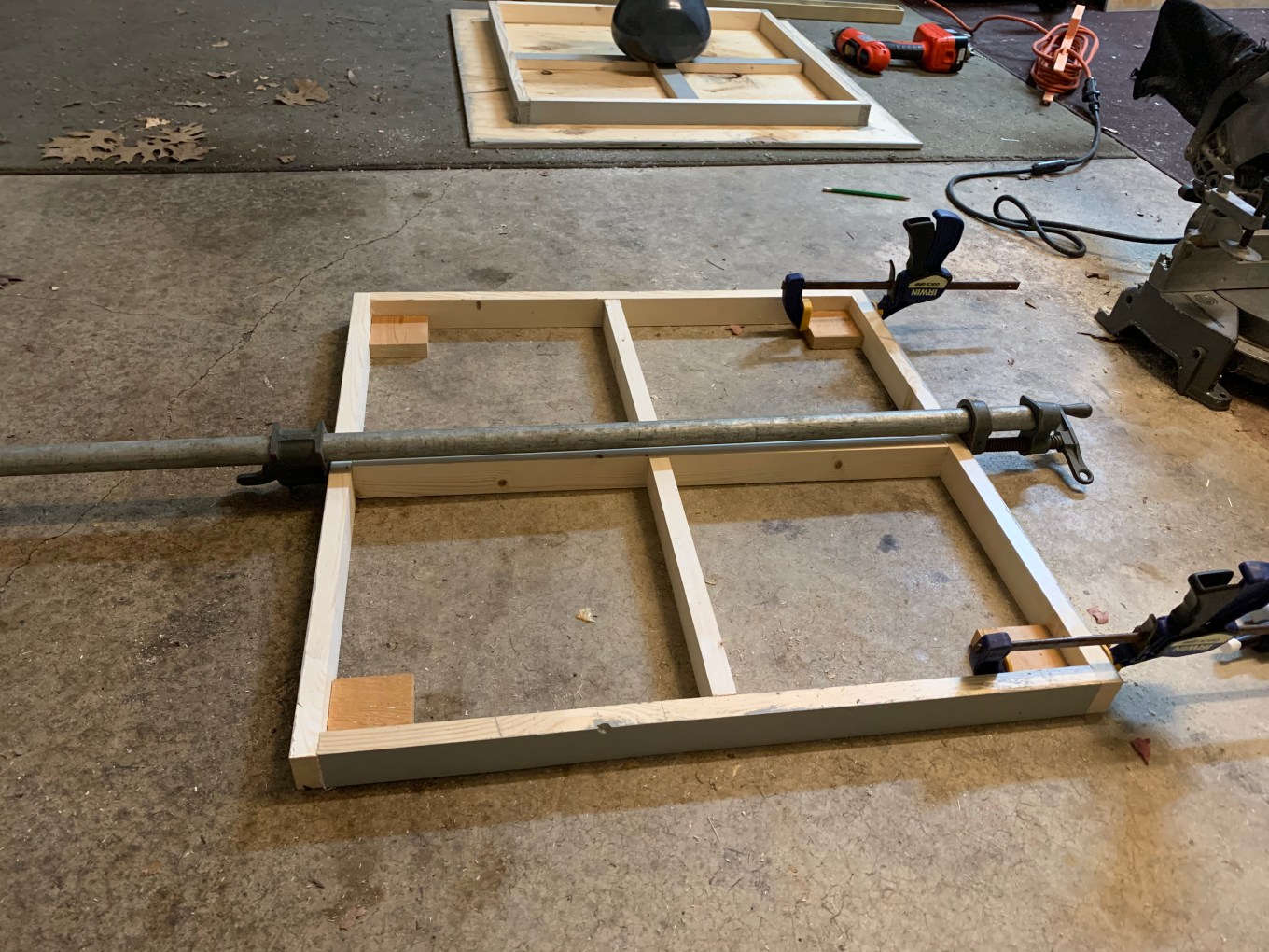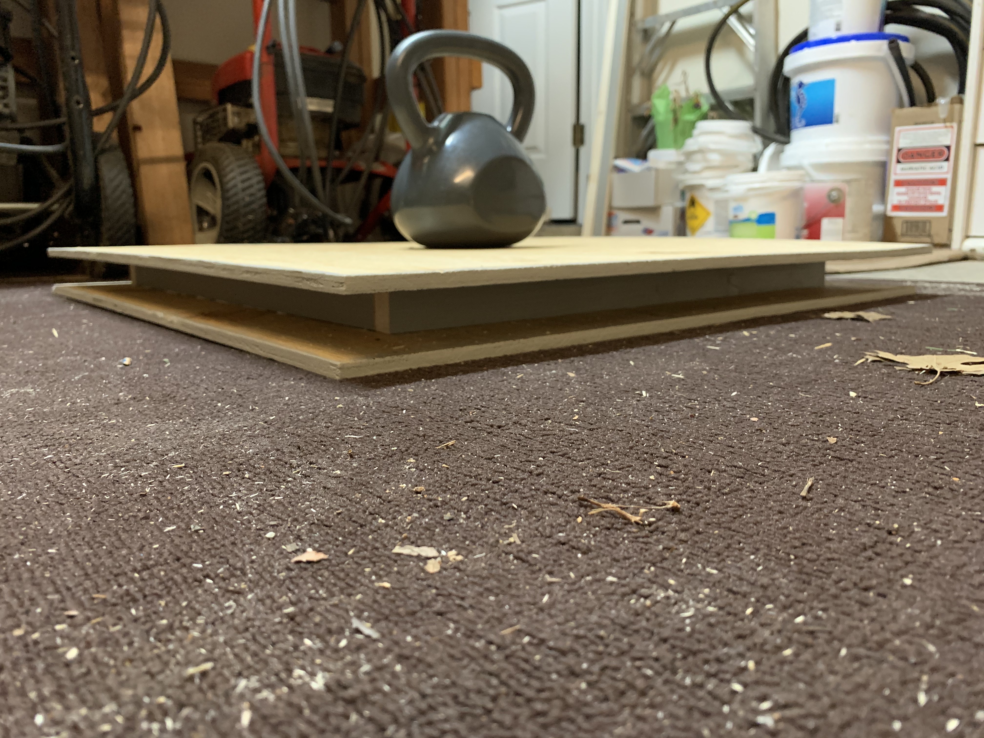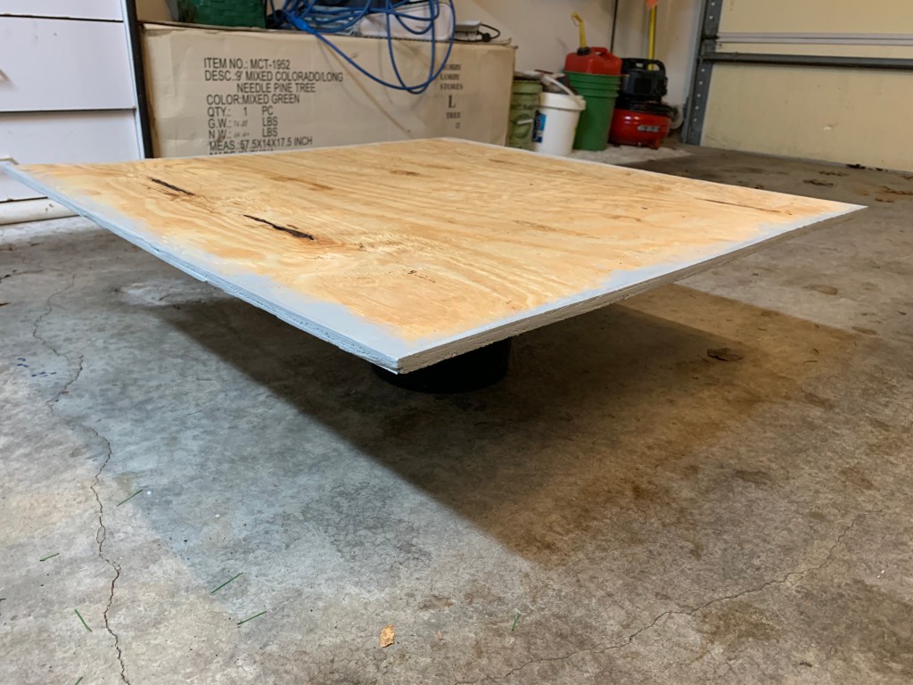 I marked out a 24-inch square on the bottom of the plywood and then glued the side frames in place prior to screwing them down. I took this approach because I wanted the screw heads to be on the top eventually hidden by the grass carpet and I didn’t think I could screw in four pieces of wood below the plywood without one or more of them moving during the process. Since the plywood was a little warped just from sitting in the garage, I had to add a heavy weight to make good contact between the plywood and the strip wood pieces.