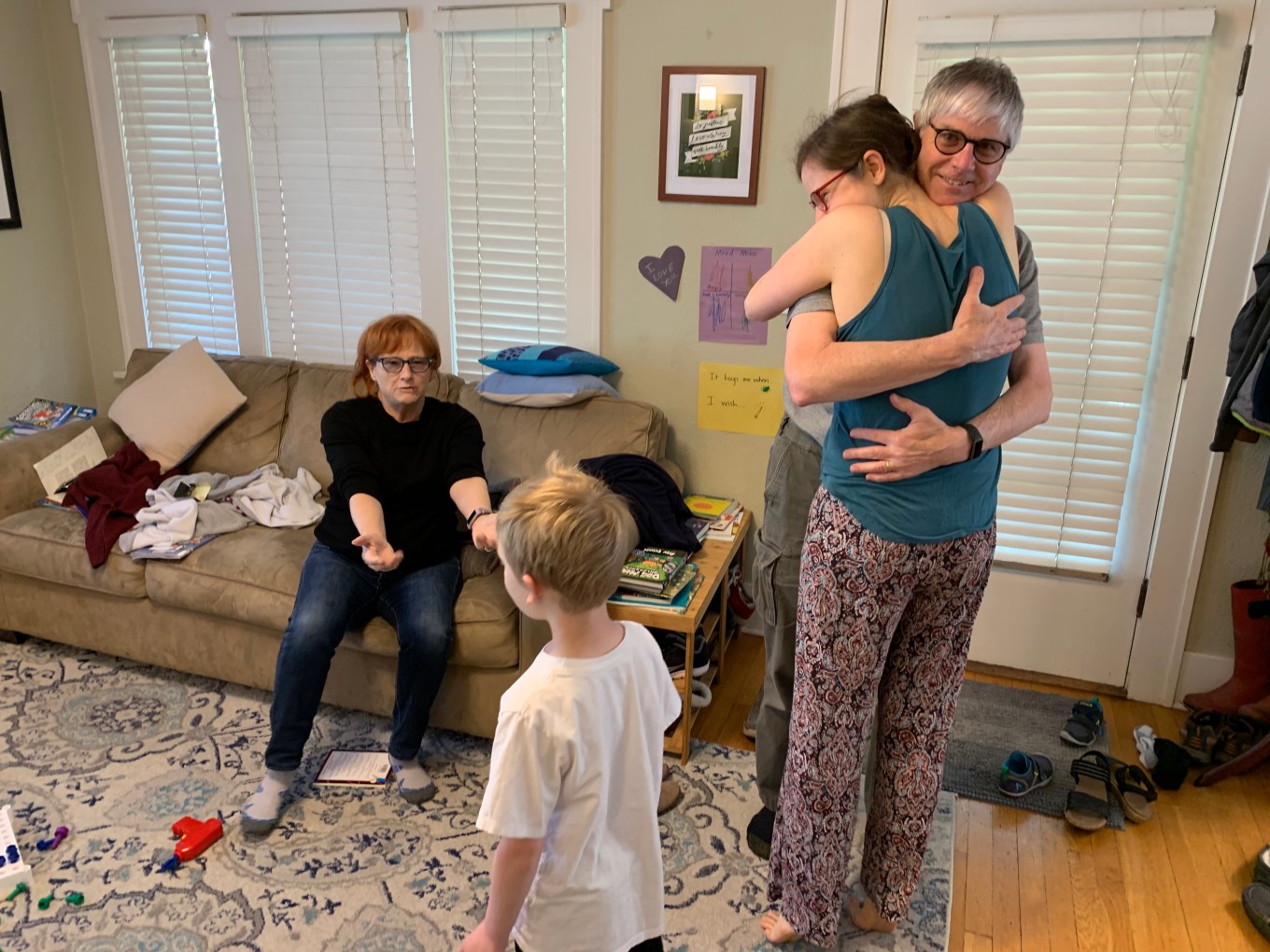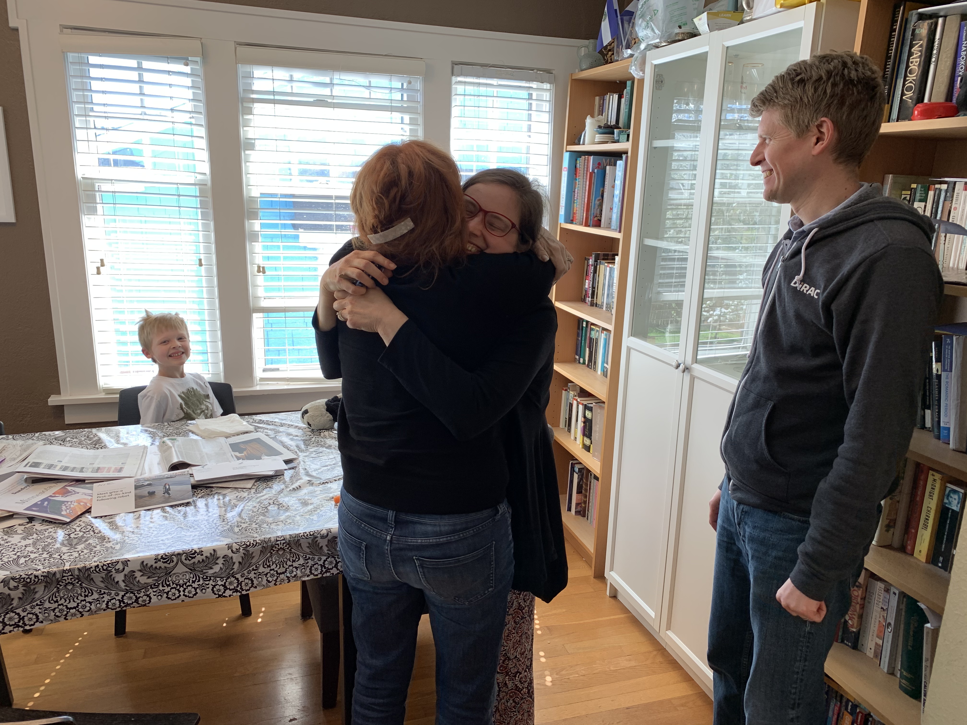 Once inside, as my mother always used to say, we got the hugging started.  It was such a wonderful feeling to experience a shared embrace from our daughter, son-in-law, and grandson for the first time in so many months.