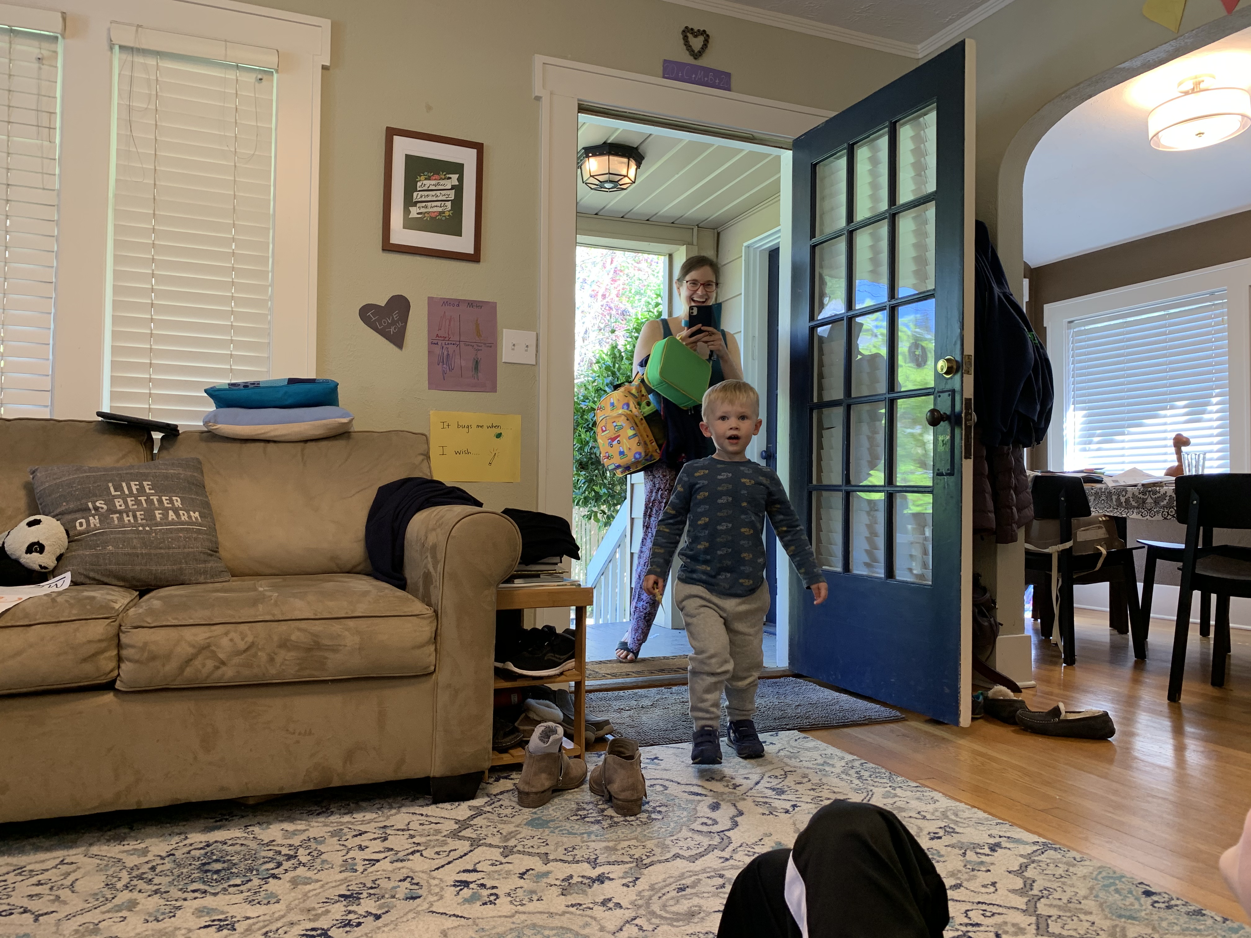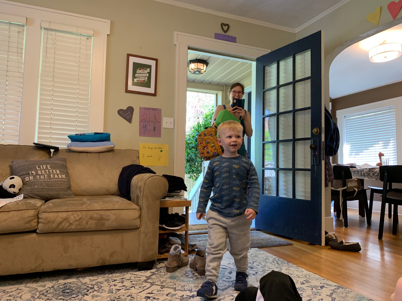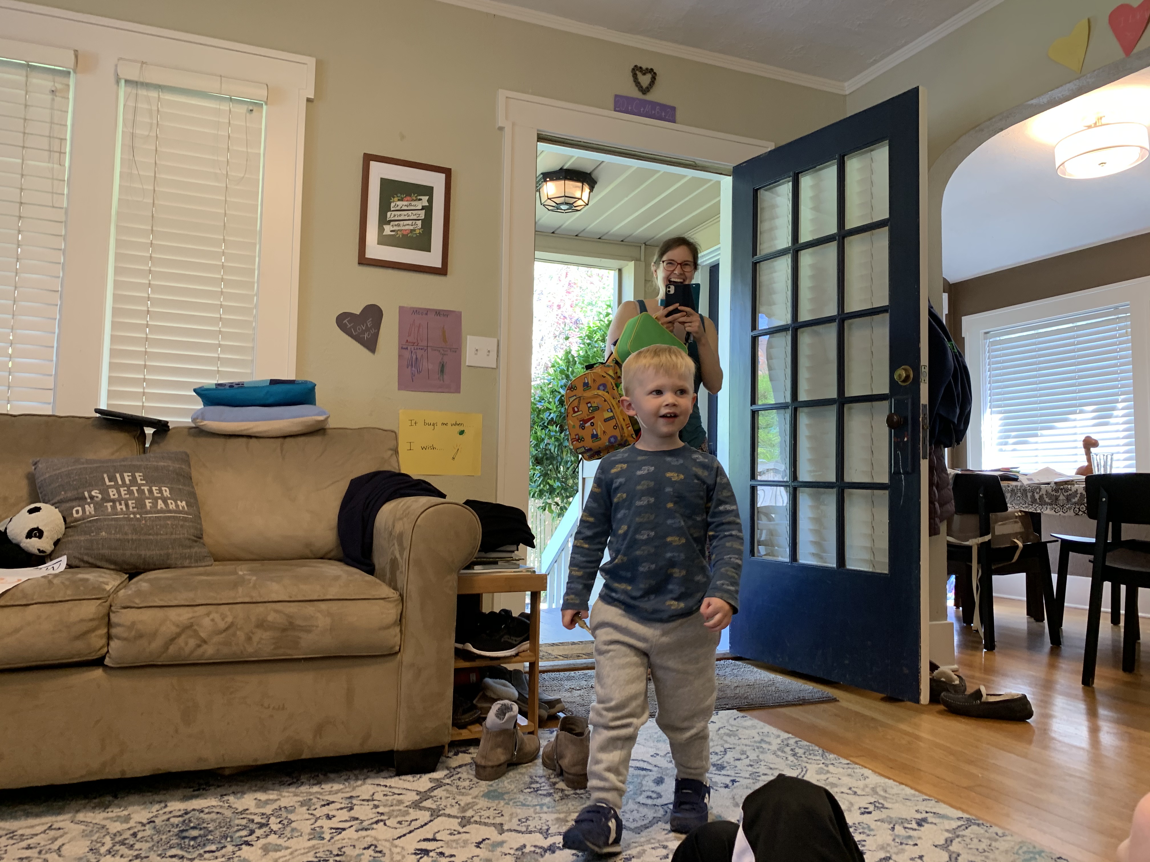 To greet our other grandson, my wife and I positioned ourselves in two chairs in the living room to surprise him as well.  I had my phone camera ready to capture the look on his face.