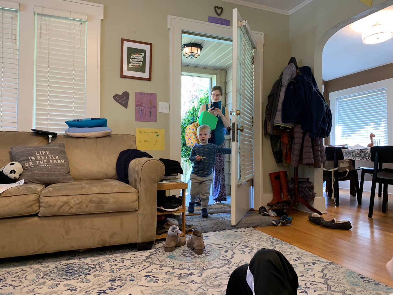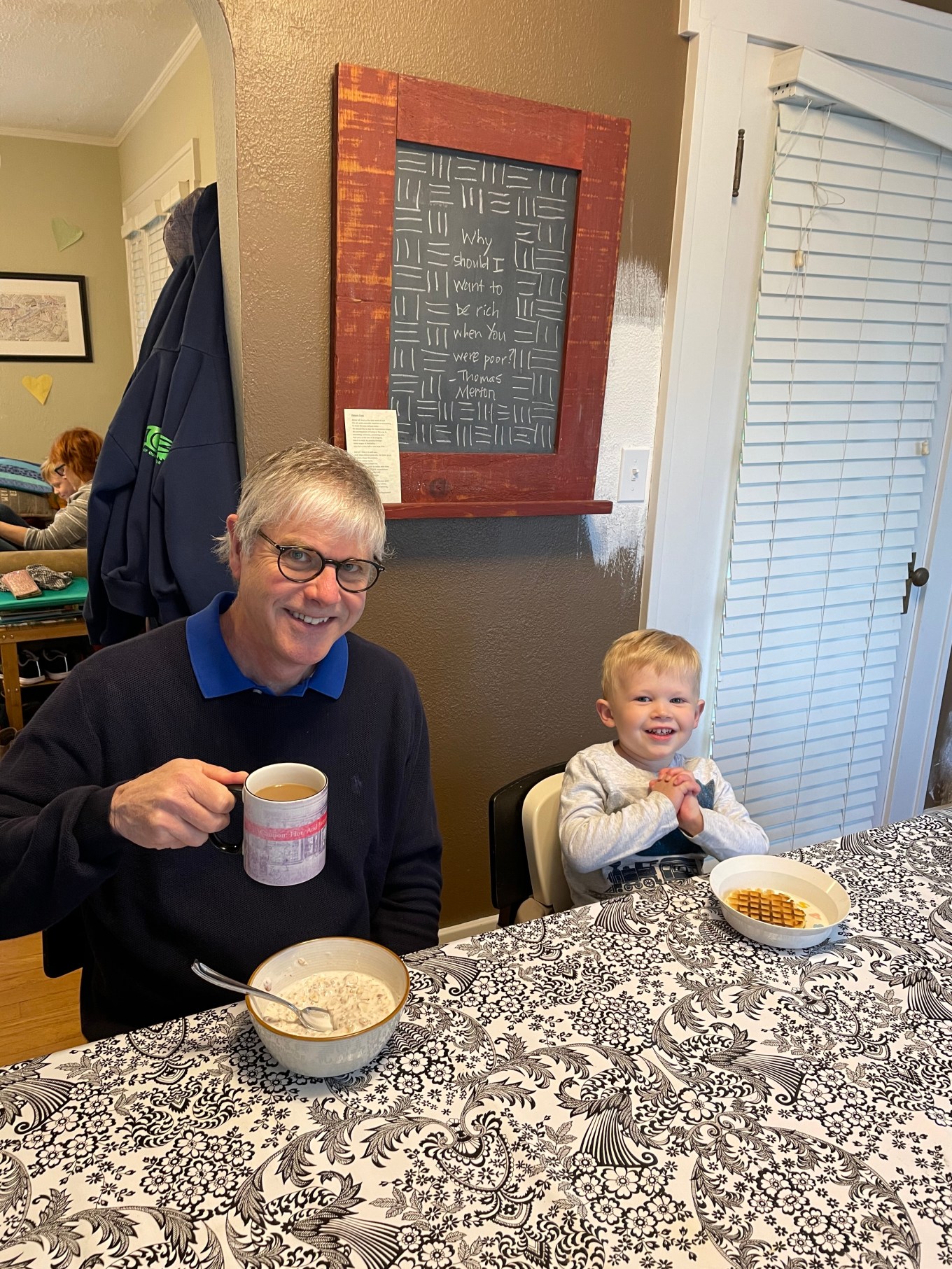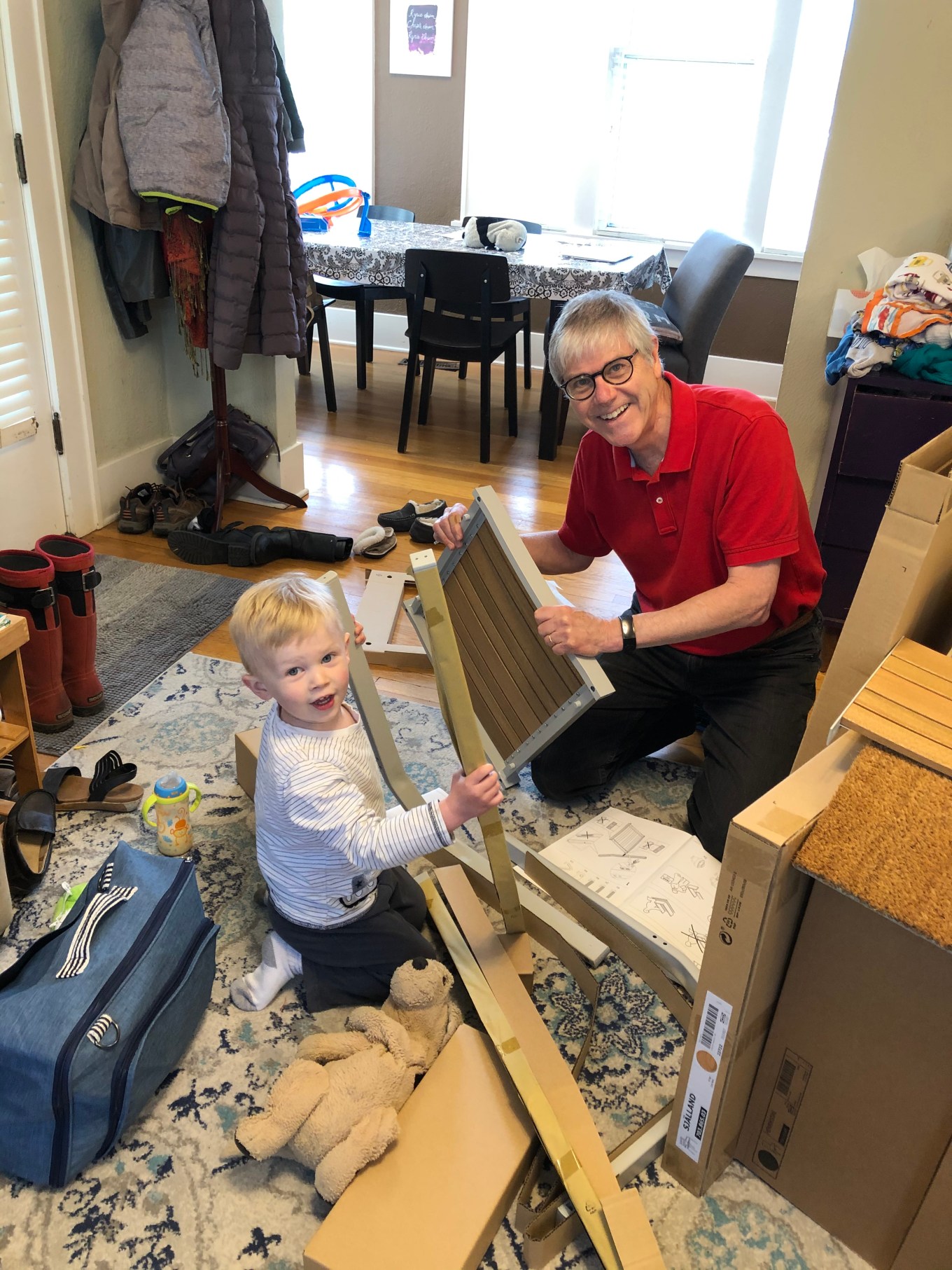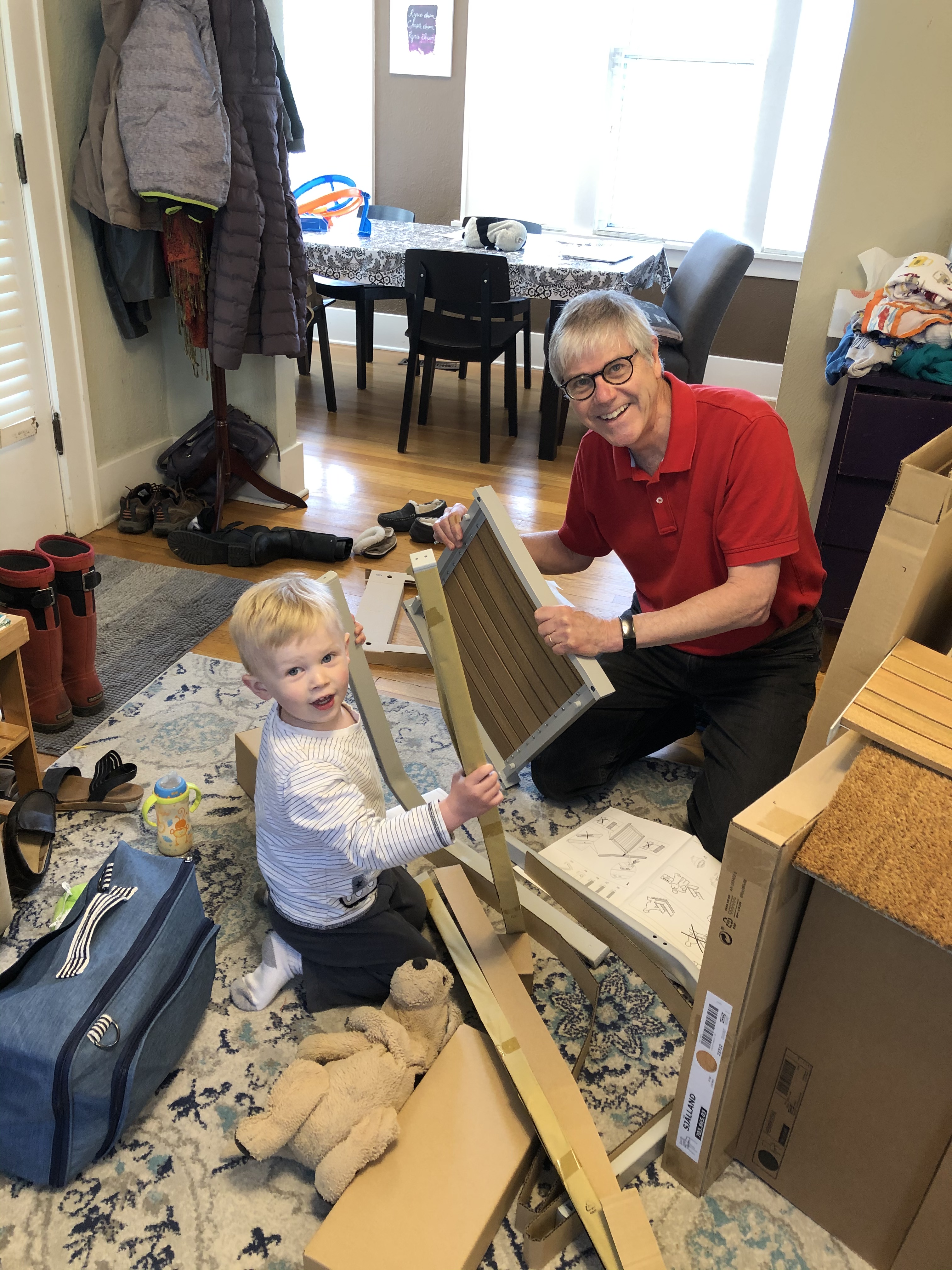 To greet our other grandson, my wife and I positioned ourselves in two chairs in the living room to surprise him as well.  I had my phone camera ready to capture the look on his face.