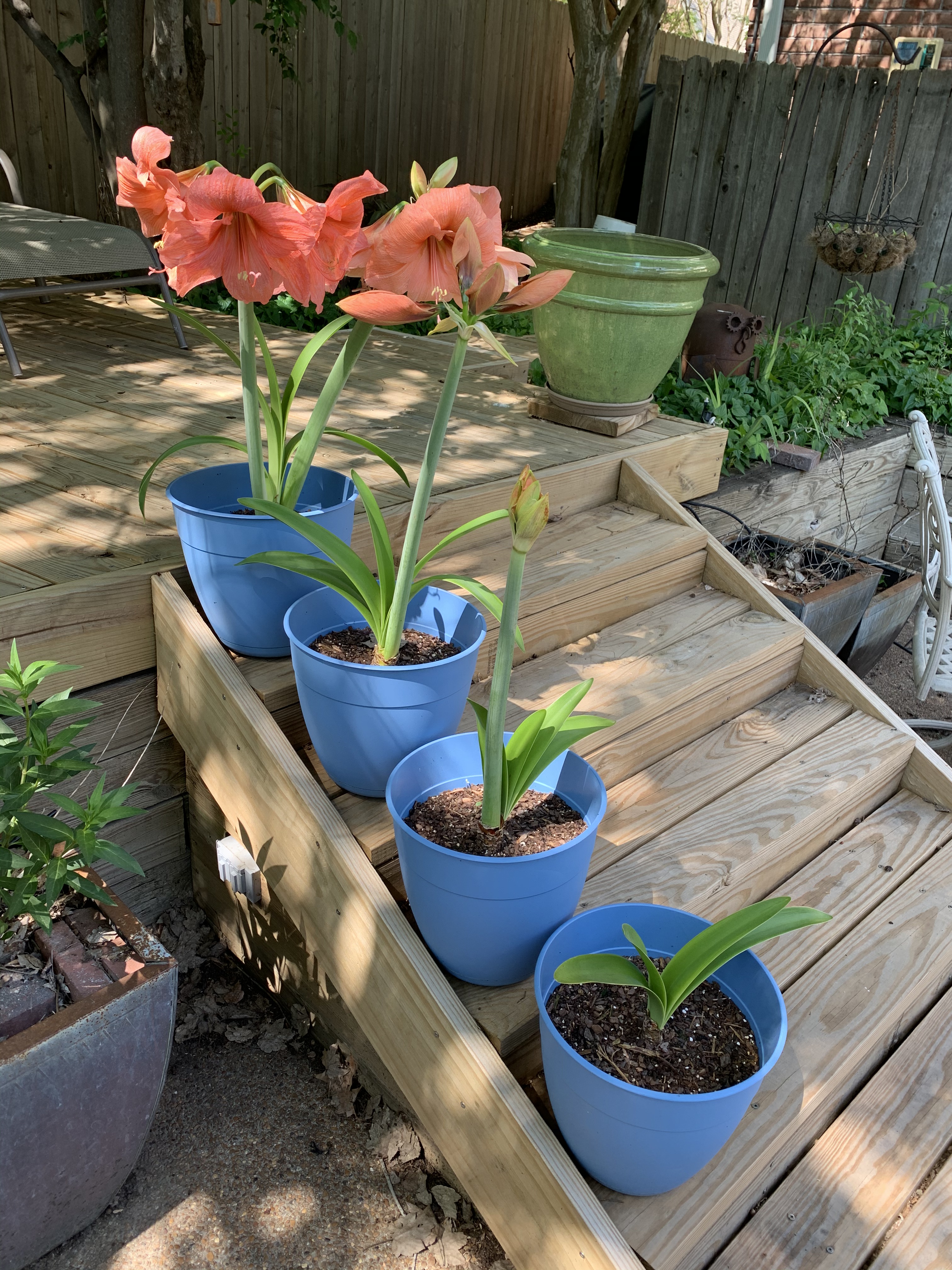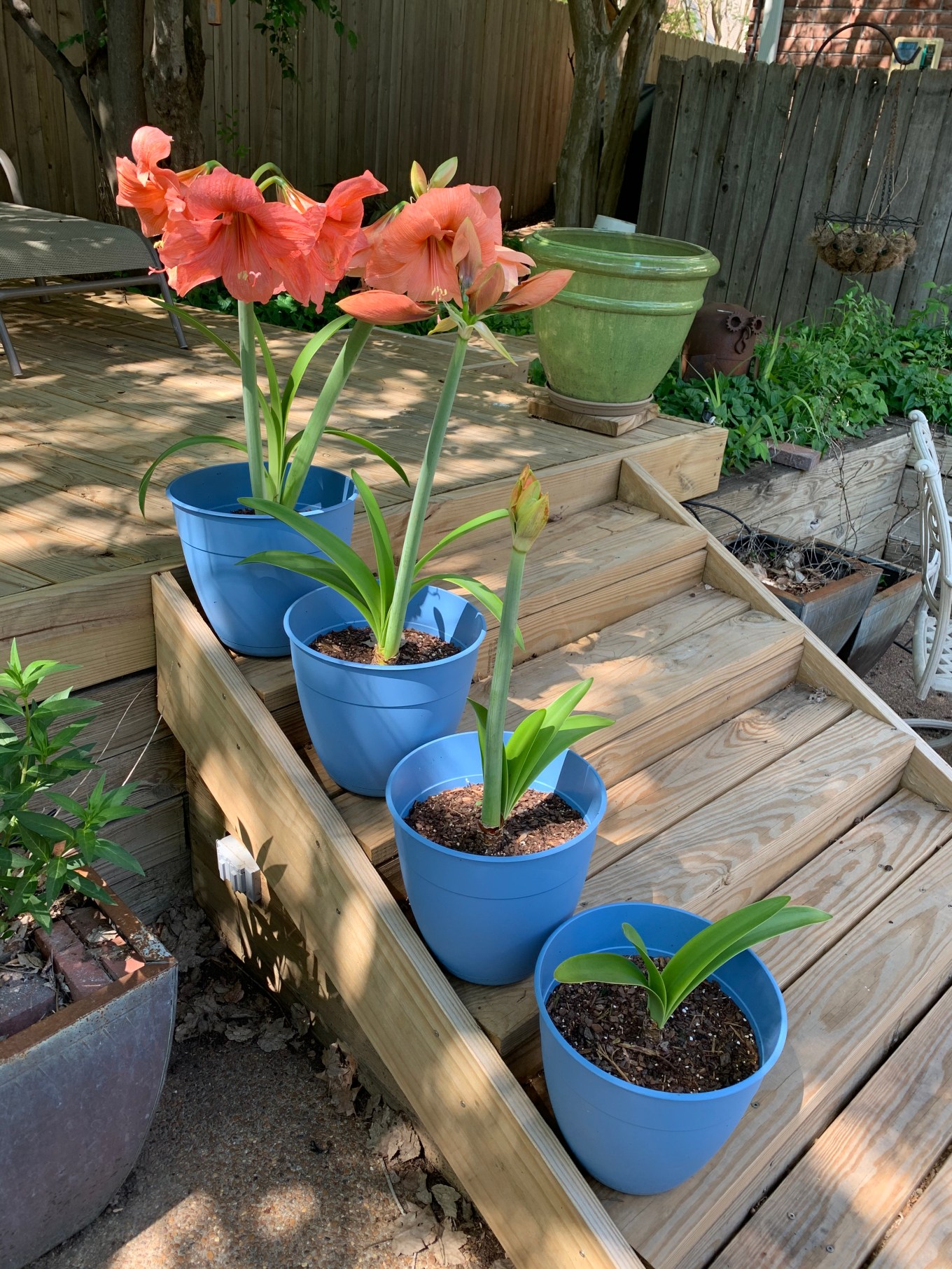 I read online that a good way to give the bulbs a kick start was to soak them in lukewarm water for several hours before planting them. I did this and then planted them in the new soil. I put them outside and then within just a few days, leaves began to grow on each bulb and within two weeks, three of the four bulbs had already put up flower stalks.