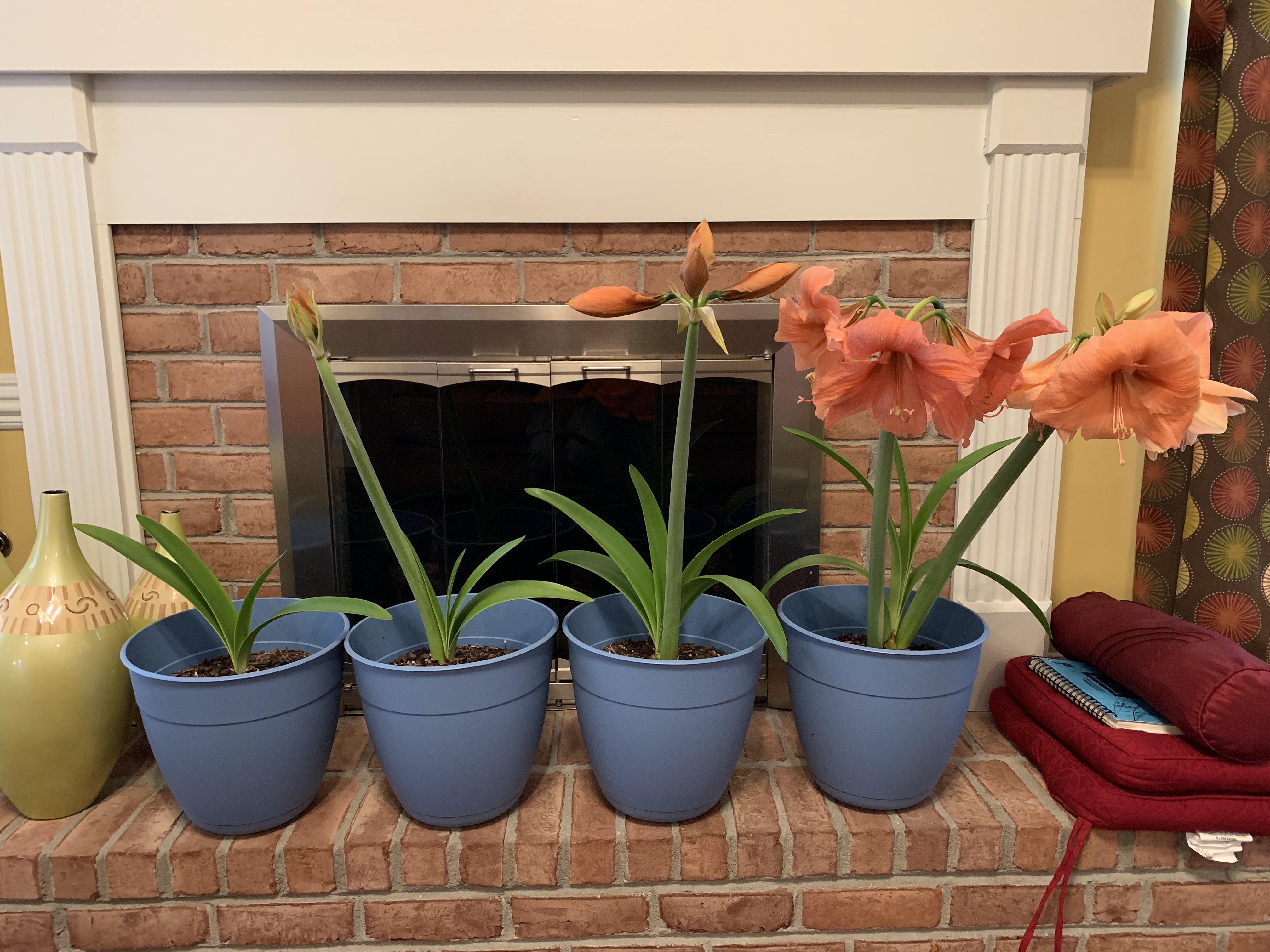 Being slightly different varieties, they each bloomed at different times which was nice as we had one in bloom sitting on the hearth until early in May.