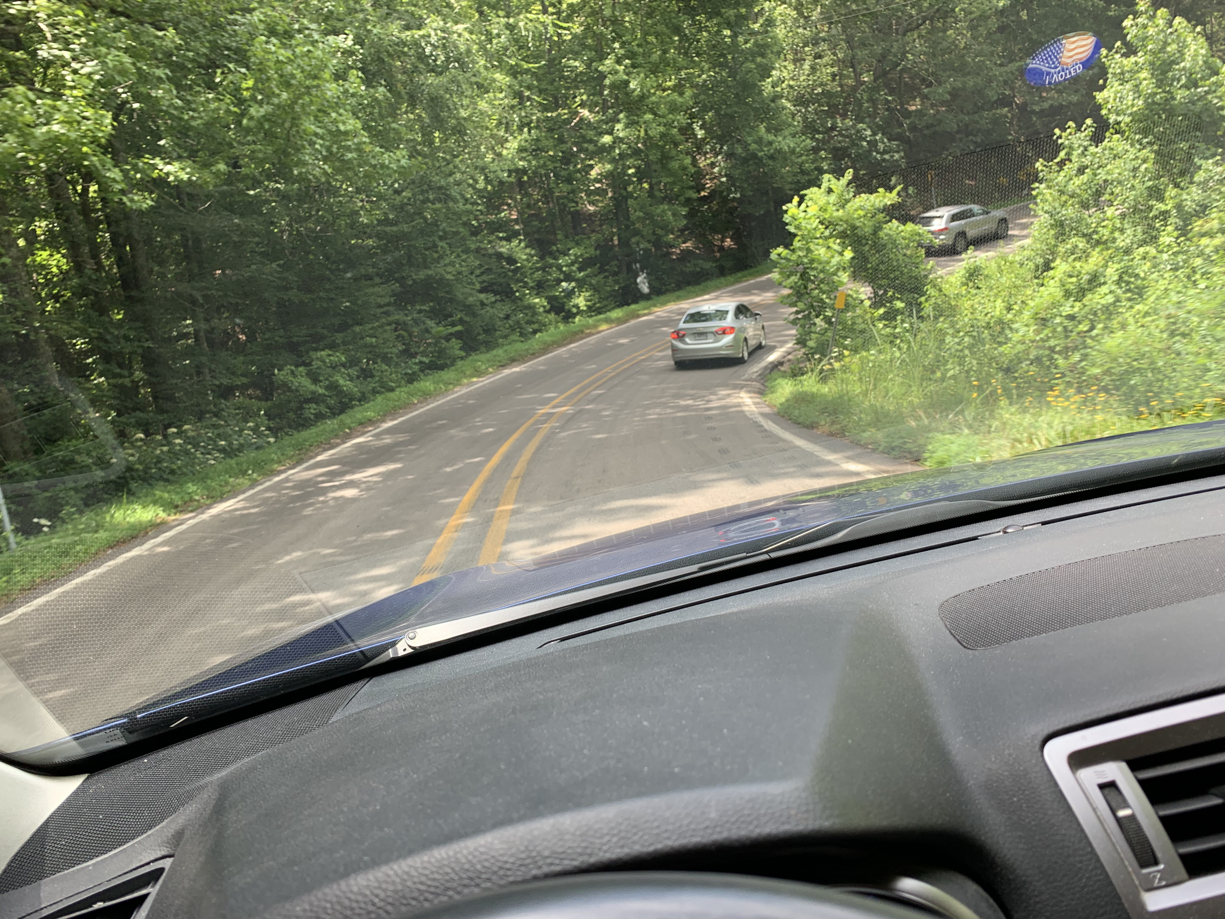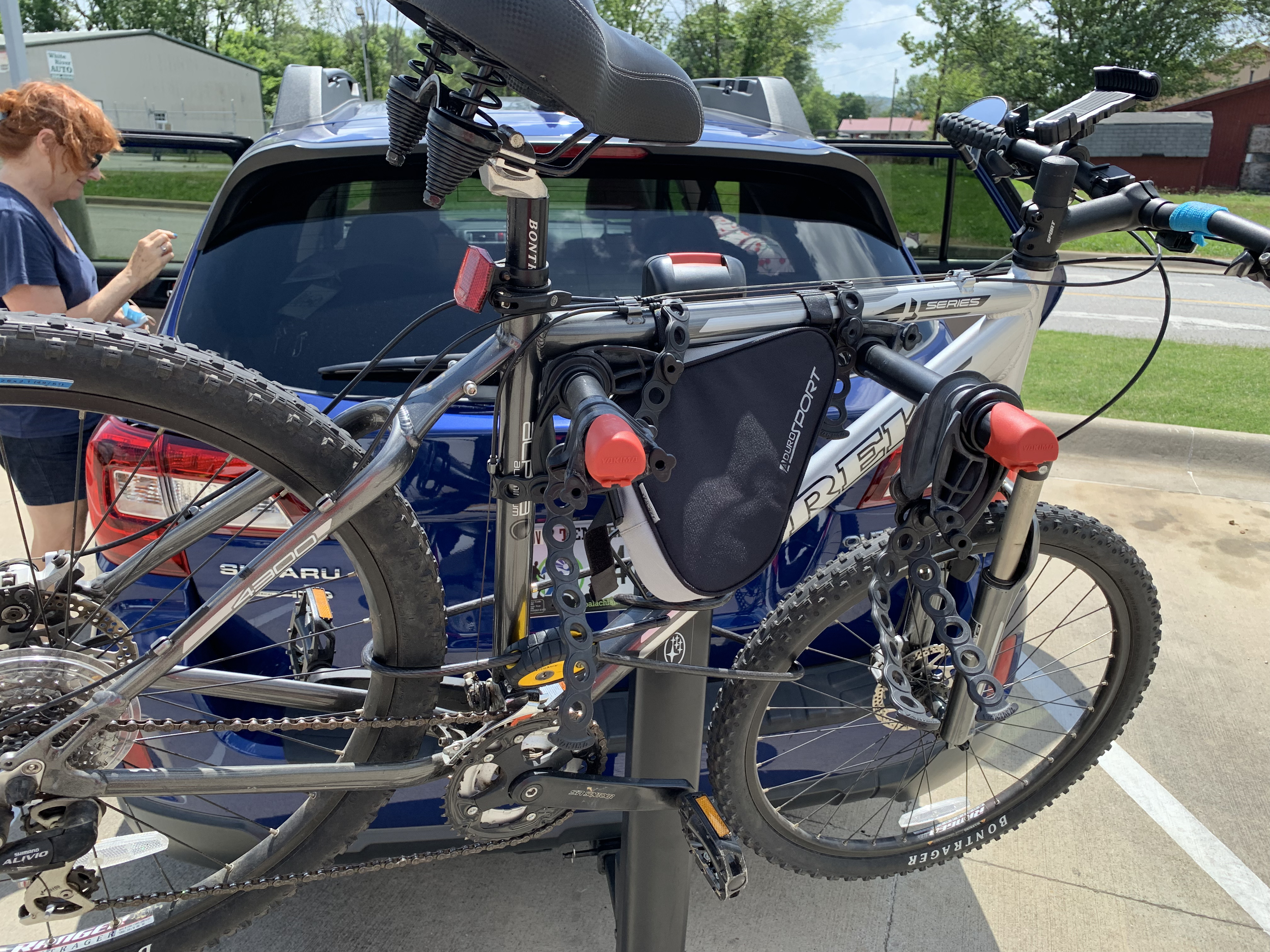 As it turned out, getting across, while slower than normal, still was not unbearable. But two other unexpected events did impact our trip. When we made our first bathroom stop, I noticed the bracket holding the rear bike frame had slid forward on the carrier bar. I tried pushing it back but to no avail. Figuring it wasn’t going to move anymore, we got back on the road. But knowing it had moved, I began to watch it in the rear-view mirror and could occasionally see the wind buffeting the rear bike tire that stuck out beyond the side of the car.