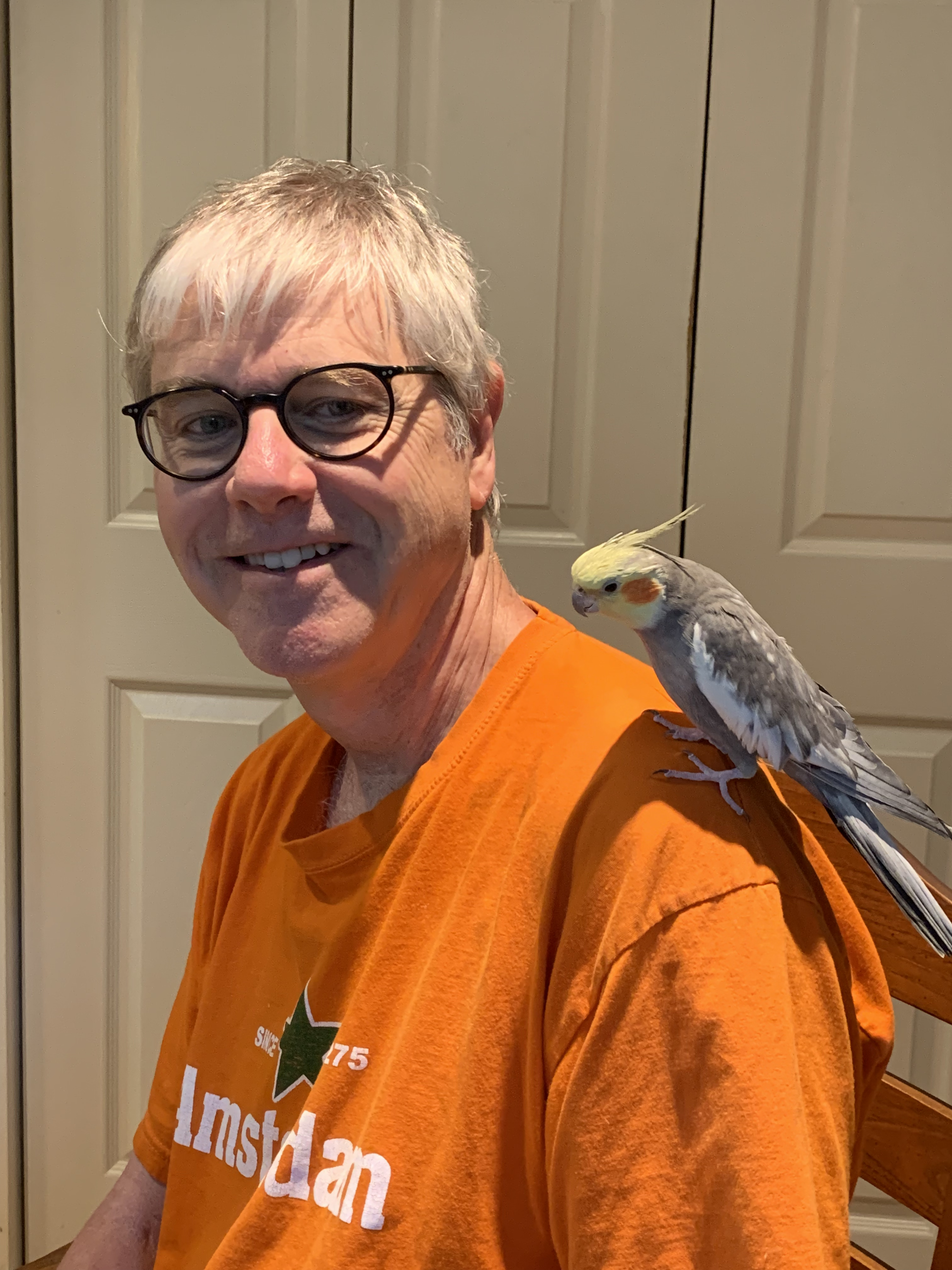 The next morning, we sat around the kitchen table birdwatching while the rain continued to come down. At one point, my sister let her cockatiel out of the cage and unexpectedly he took a liking to my shirt which matched the color of his cheek.