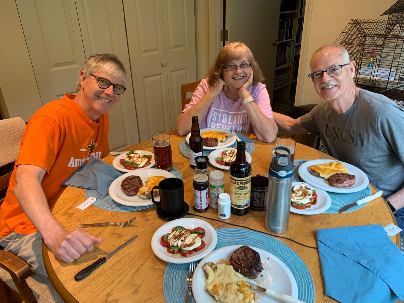 For dinner that night, I grilled out my famous steaks, a tradition, accompanied by delicious double-baked potatoes and caprese salad well engineered by my sister.