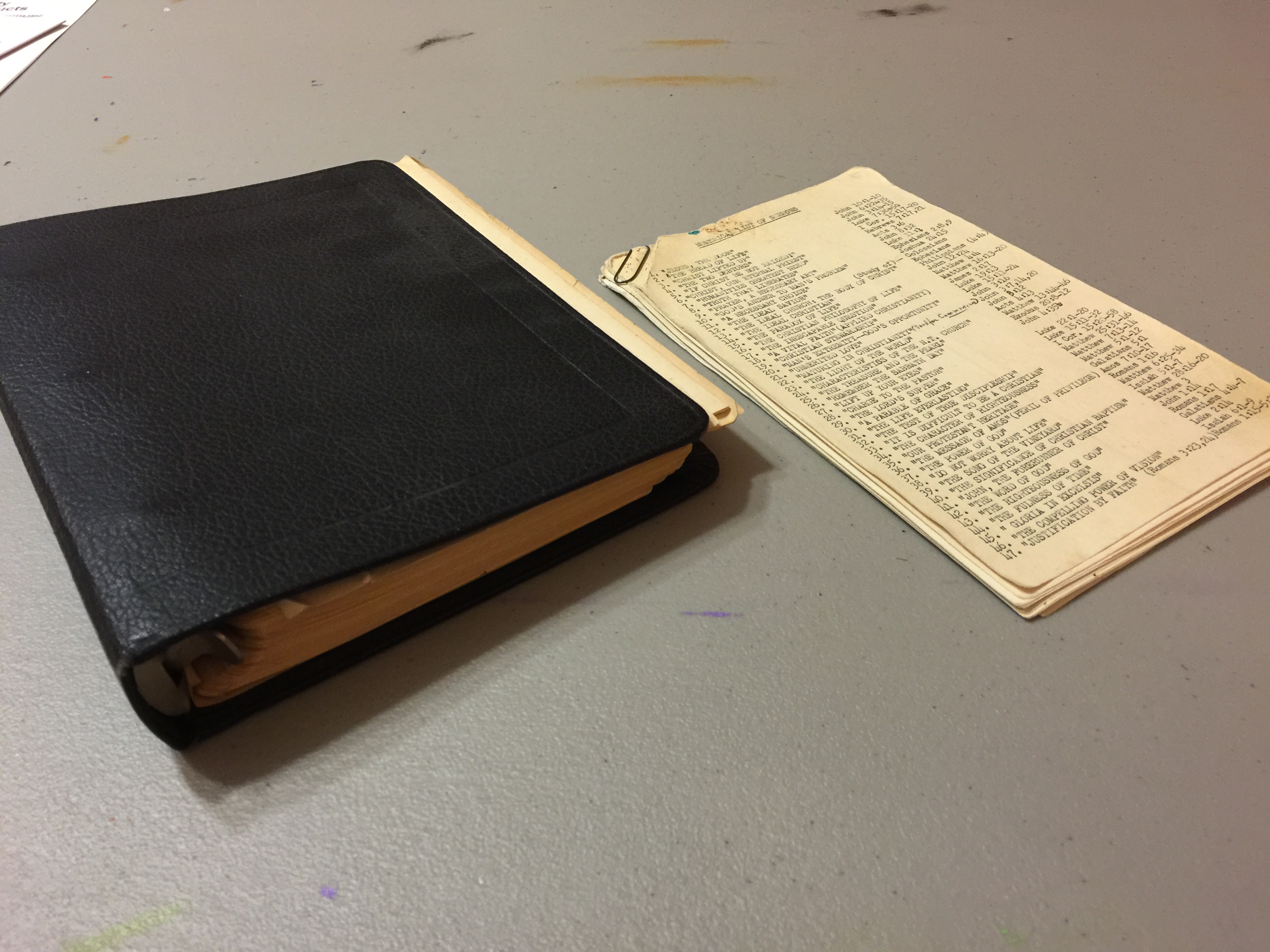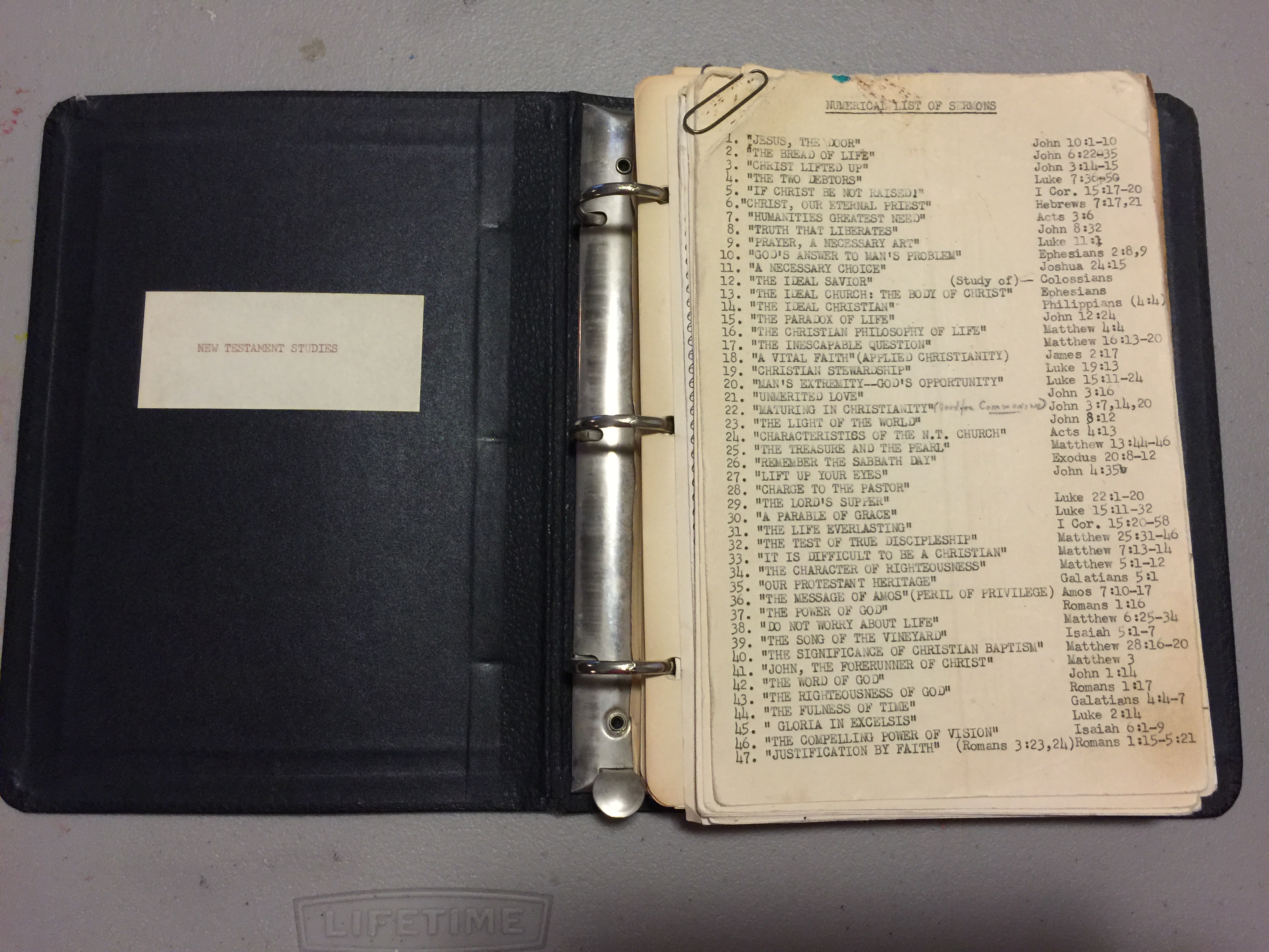 But then there is this other small three binder that includes what appear to be unnumbered sermons. I also got this book from my sister several years ago when I received the boxes of sermons. Loose inside was the typed numerical listing of dad’s sermons.