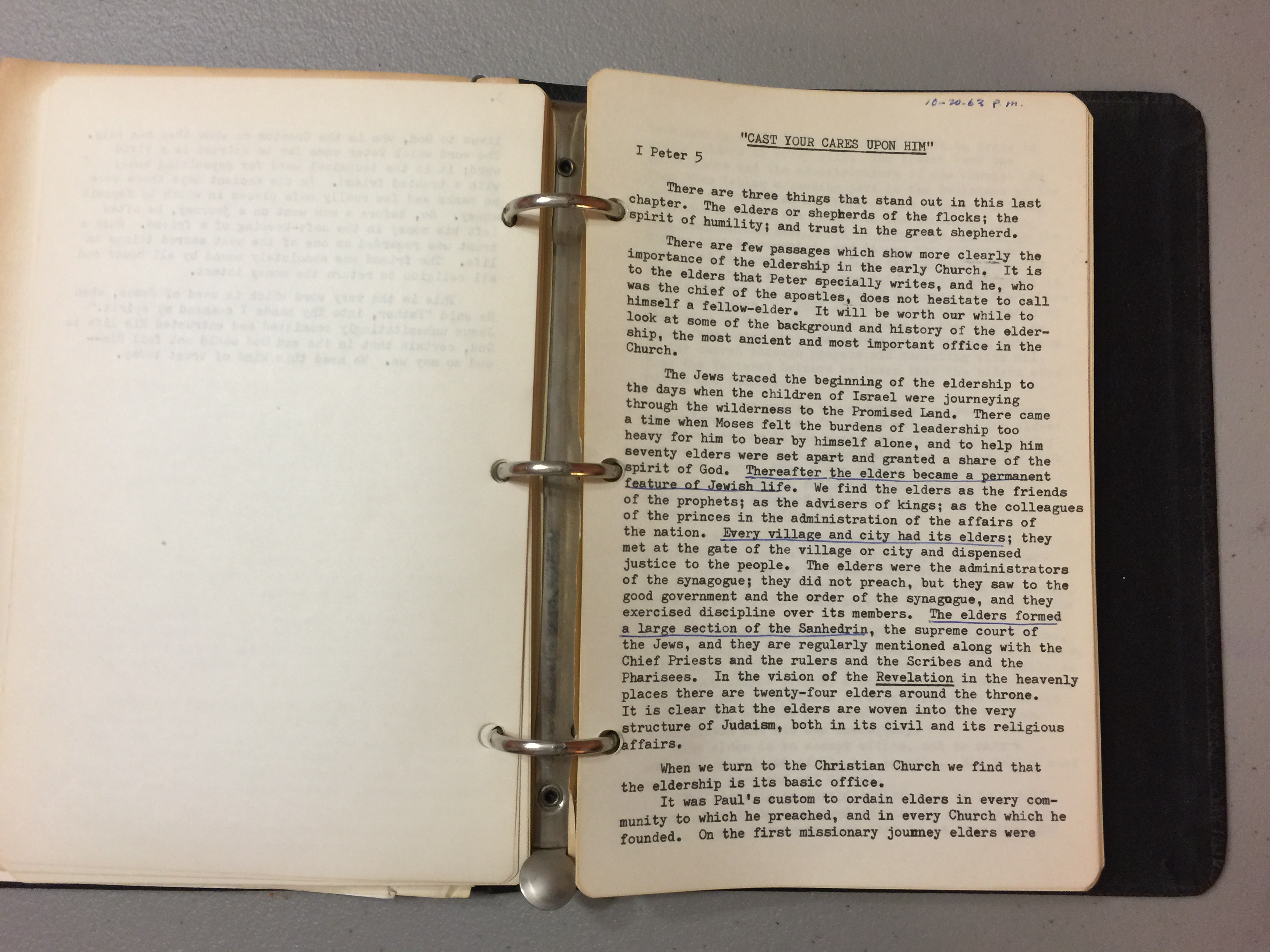 Thanks to Dad’s double entry bookkeeping, I could cross reference the handwritten date on one of these sermons with its corresponding date in his Pastoral Record. Under the Remarks section which always included the time of the service, Dad had additionally written in the word “Study.” Aha. Dad did not consider these as sermons but rather shorter Bible studies. But he still recorded them as a sermon in his Record of Sermons Delivered.