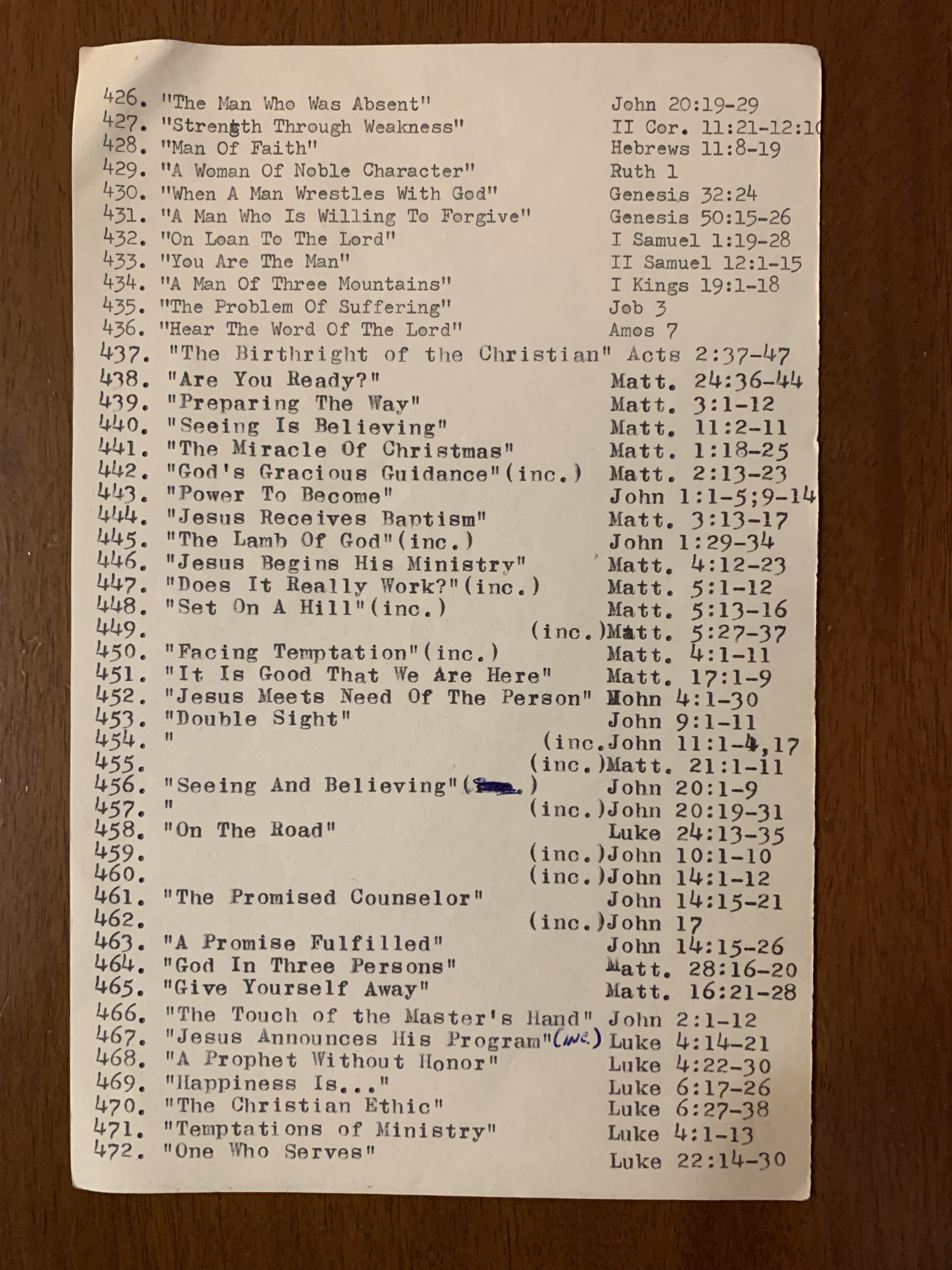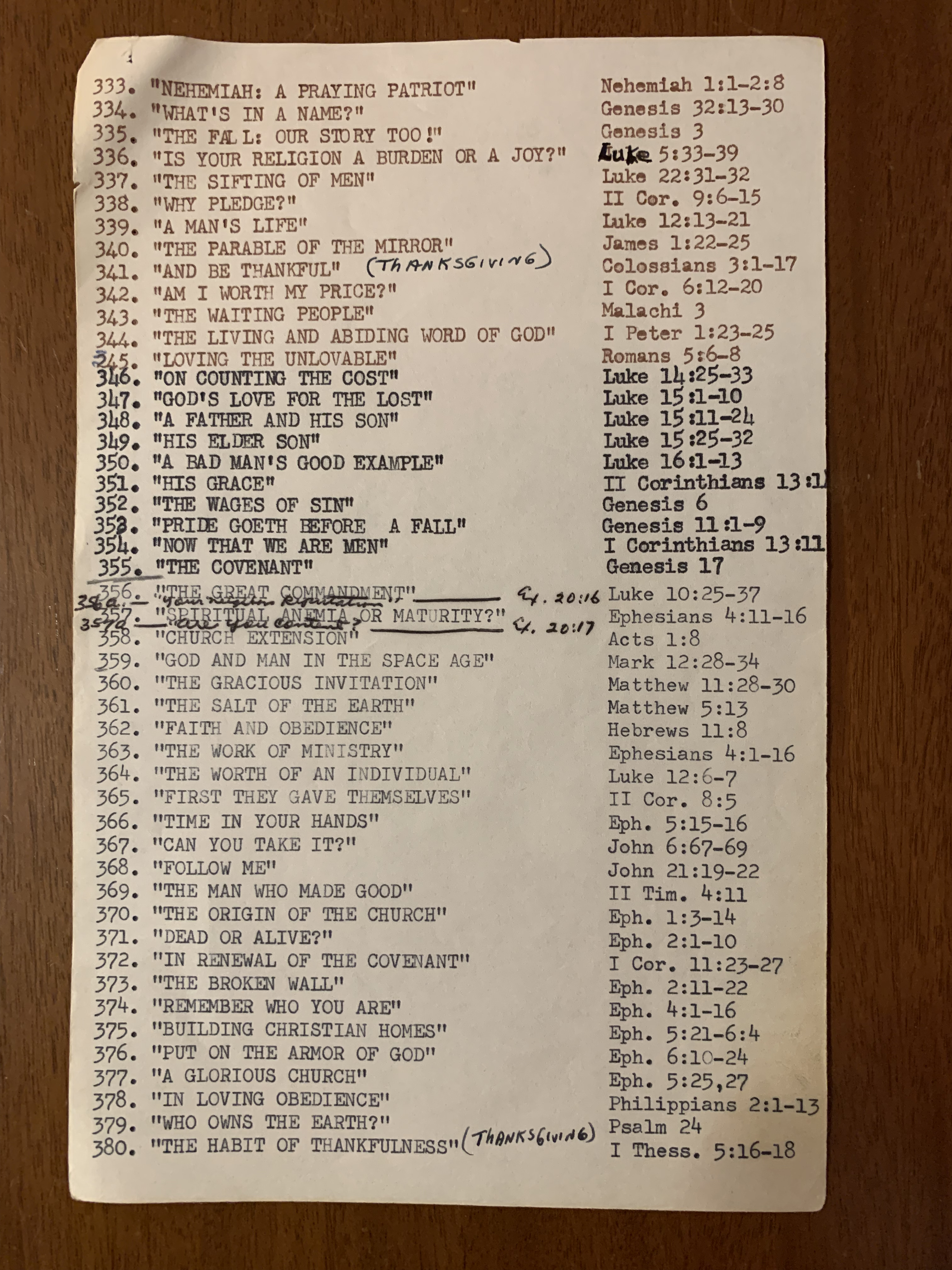 The first clue I had was this typed numerical listing of sermons that I received from my sister when she gave me all of dad’s sermons. This listing included numbered sermons through 706. However, when I organized his sermons into numerical order, I discovered folders going through 710. Looking at the dates of when these last four sermons were first given, I realized he had written them after he retired in December of 1989, thus explaining why he had not added them to his typed list that he kept while an active, full-time minister.