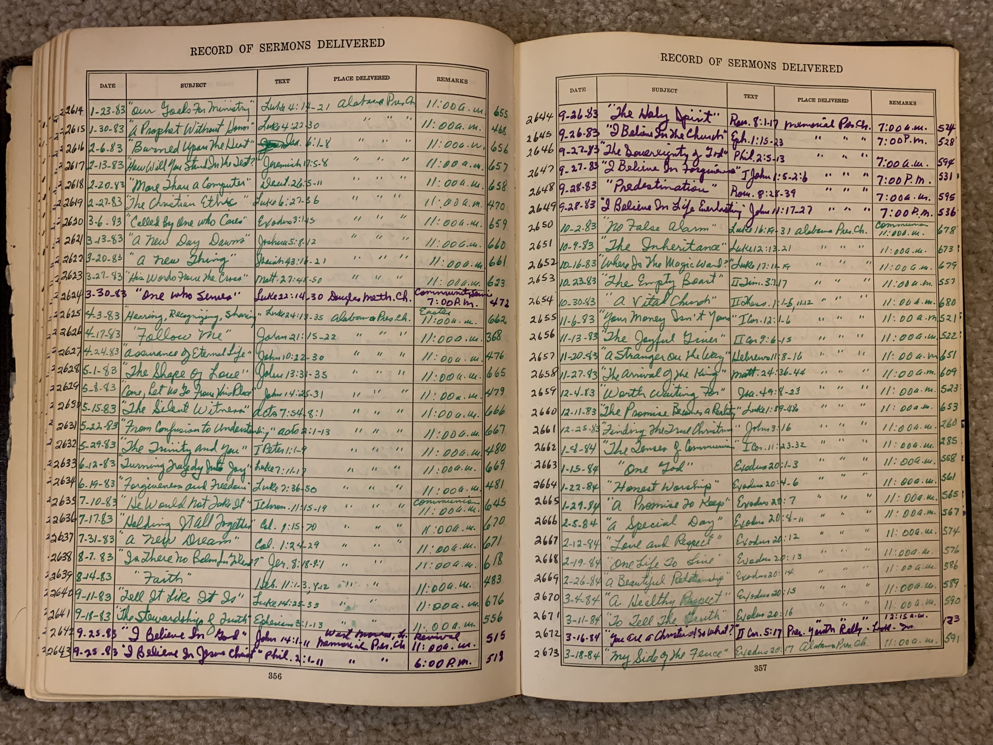 It was several weeks ago I wrote about receiving this book, my dad’s Pastoral Record, when I was over in northwest Arkansas visiting my two sisters. In addition to documenting the churches Dad served over his 40+ year career as a Presbyterian minister, this book chronicled in his own handwriting all the baptisms, weddings, and funerals he performed. The last section of the book held the key to a question that had been on my mind ever since I started my multi-year pilgrimage of reading each and every one of his sermons—just how many sermons did my dad give over his entire ministry? The answer was surprisingly 3,362.