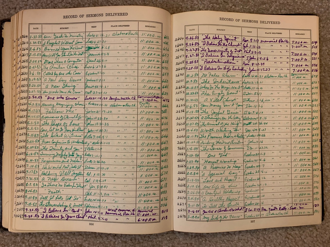 It brings joy to my heart to read of your appreciation for your father’s work. That is the same book that I have used for 43 years. Hand written sermon notes, filed in folders, placed in a file cabinet, then recorded in the book. I am hoping to soon begin working on digitalizing my notes to pdf files, converting old audio sermon cassettes to mp3 and create a database to enter everything in. Big job, I know! I’m turning 70 so I hope God grants my time to complete things.