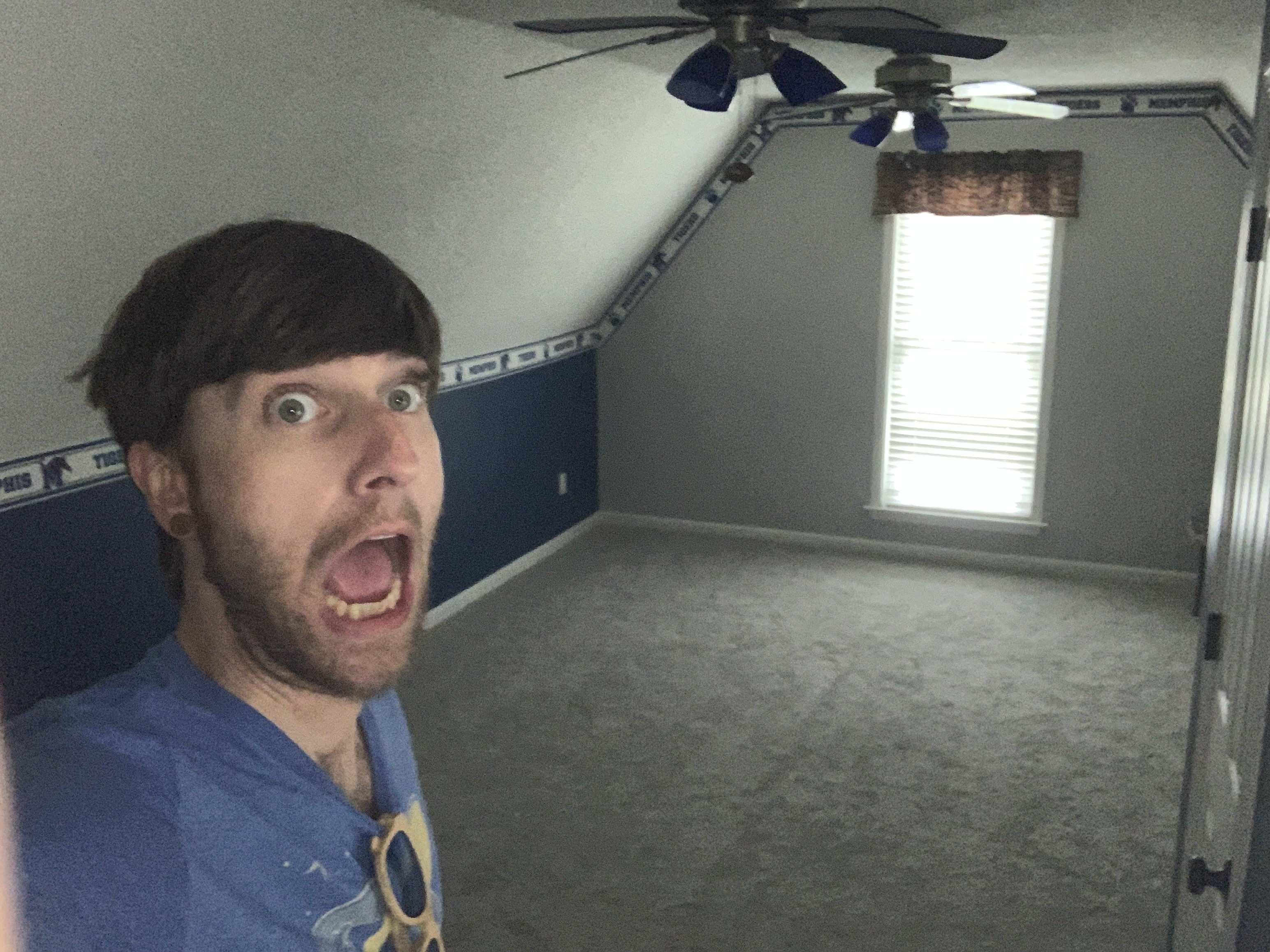Obviously the first step was to pull down the boarder. Unfortunately, using the typical process of removing the border occasionally brought down some of the blue paint as well which required further repair. My typical painting approach is to use lots of painter’s blue tape along baseboards, windows, and door jambs. Along the ceiling, I typically free hand that with as steady a paint stroke as I can. Once I had what I refer to as “two stripes” of brush stroke, I was ready to roll.
