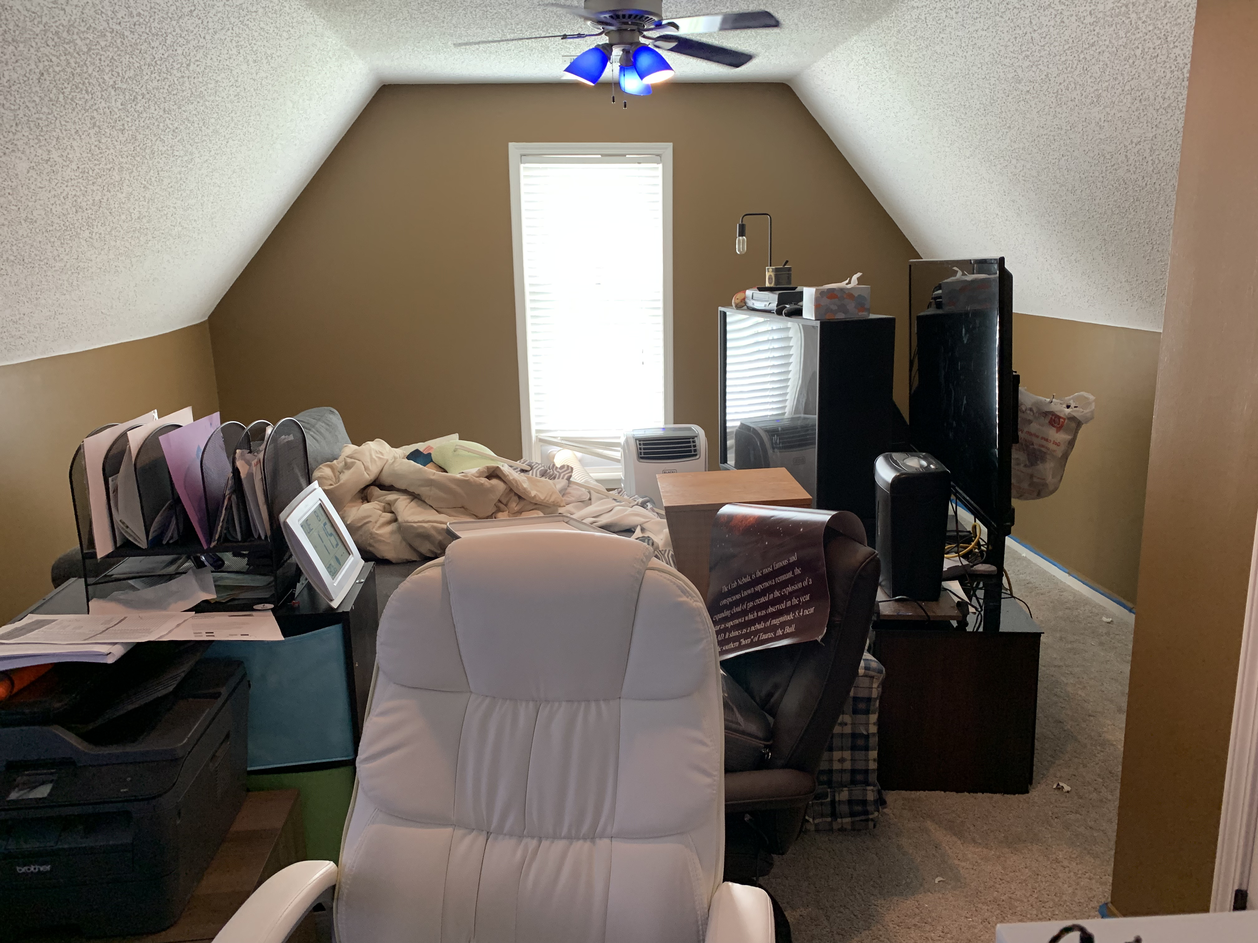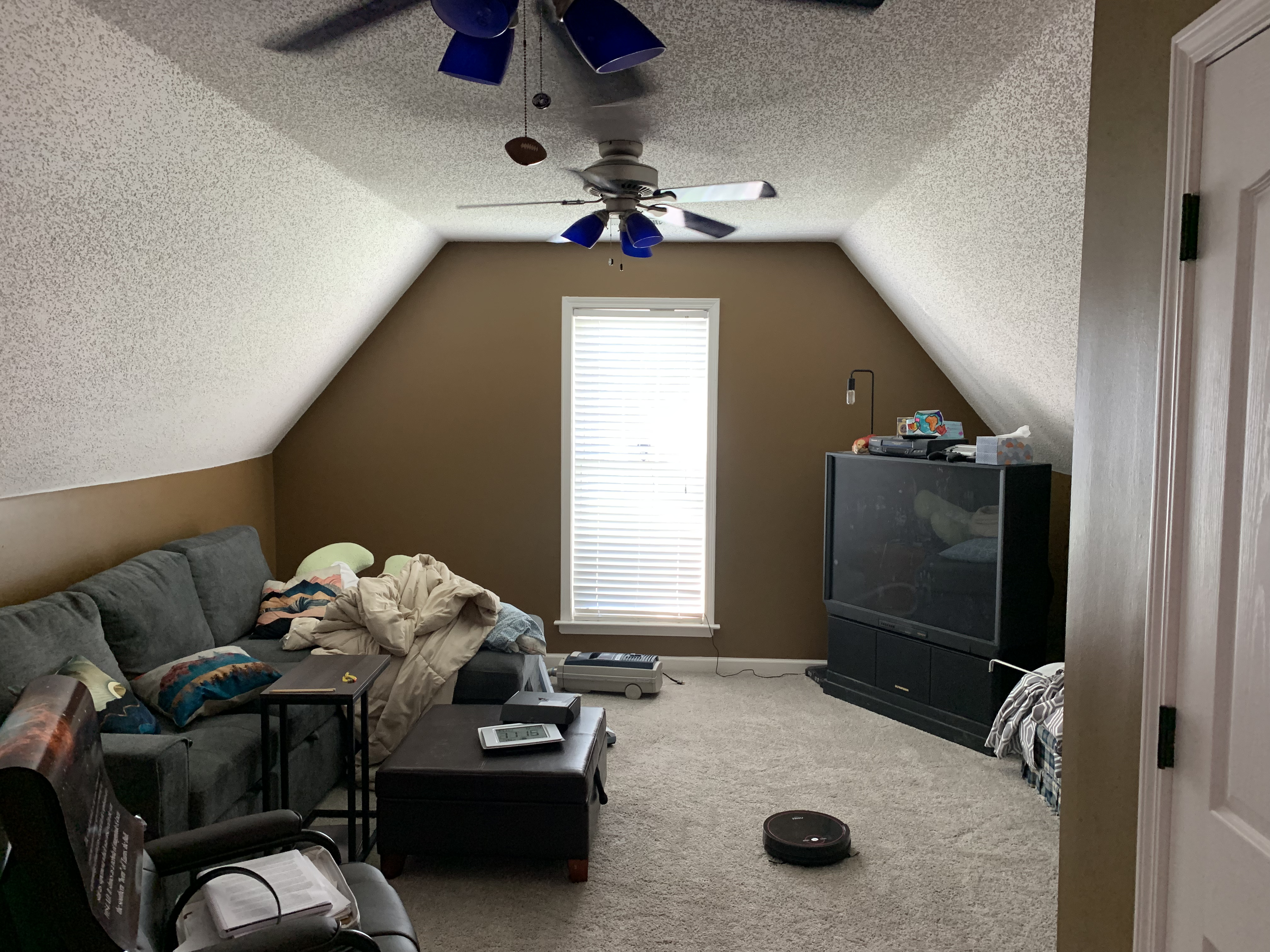 When they bought their house in 2019, this room had been decorated in a local university sports team theme with two walls deep blue, two walls grey (school colors) and a sports team border to boot. Once the pandemic started, this is where my son had set up his home office so in addition to four monitors, two computers, all the appropriate computer paraphernalia, two large screen TVs and chairs and couches, there was a lot of things to move to the middle of the room. Behind his desk, I barely had room to crawl.