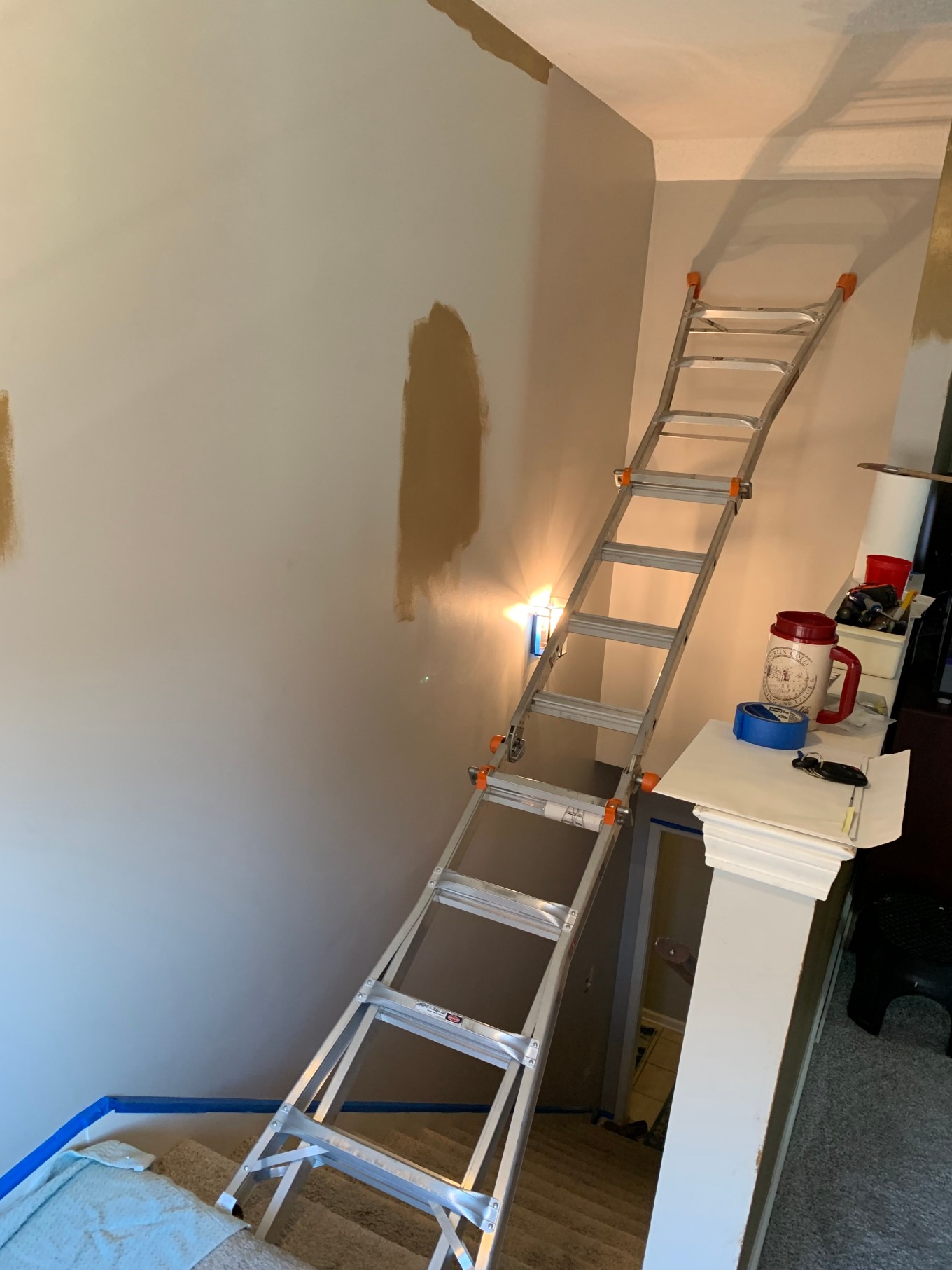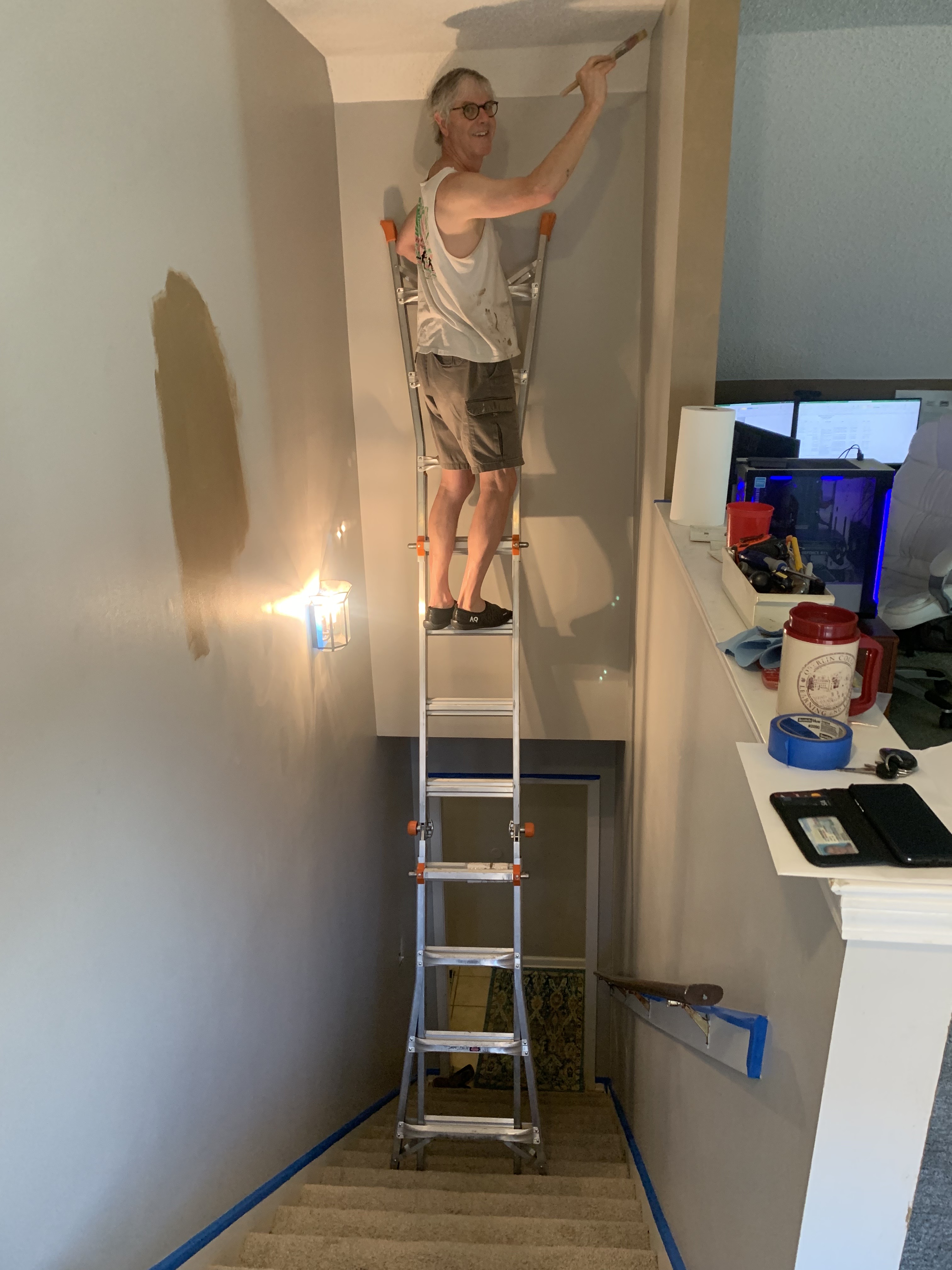 I had previously had a similar very challenging job painting our entry hall which also had a 20-foot ceiling and stairs to contend with. The biggest problem was trying to paint the wall right at the ceiling above the stairs when I needed the ladder against the wall but could not place it there for the stairs. Scaffolding would have solved the problem, but I didn’t want to go to the expense of renting it.