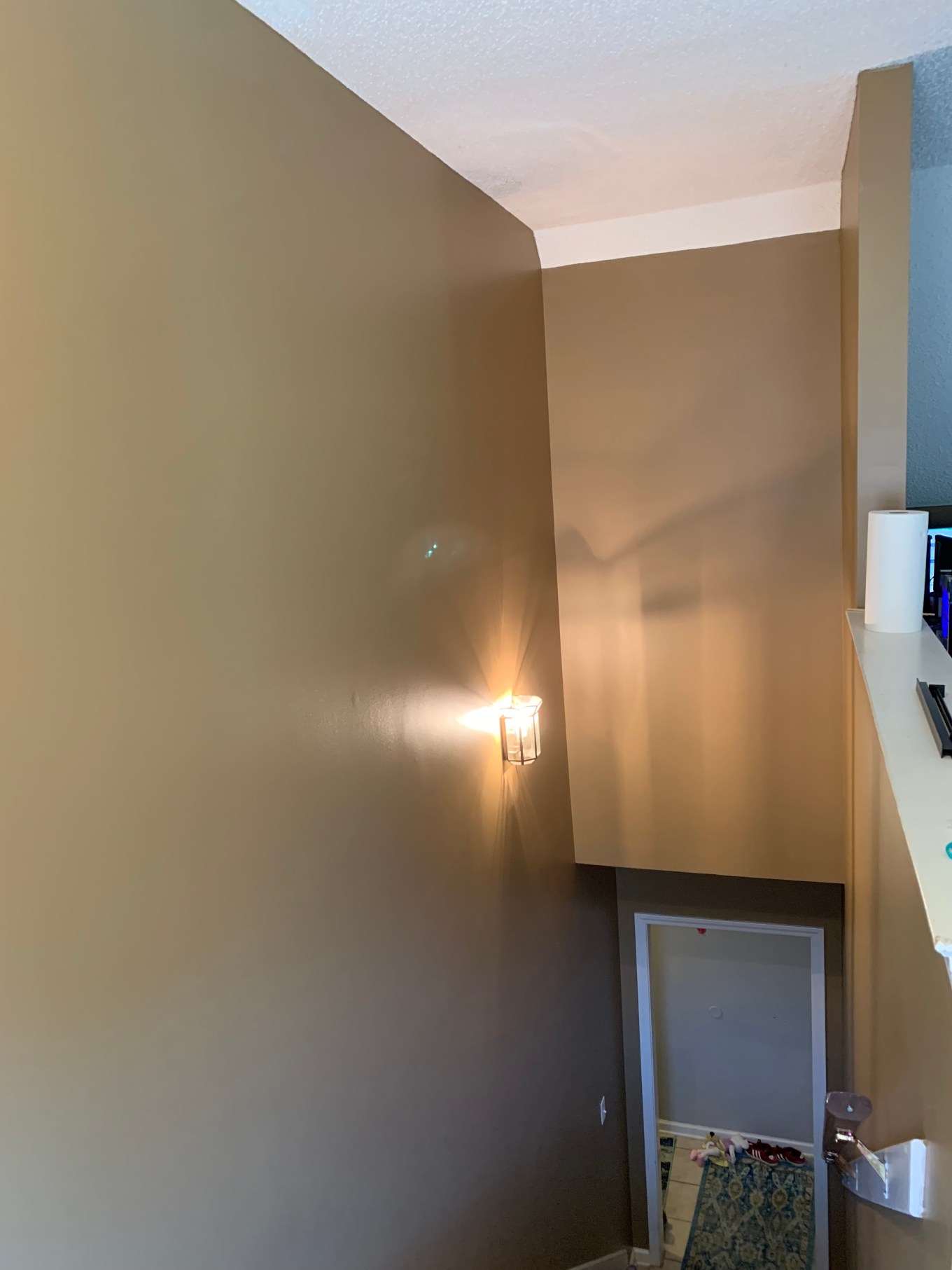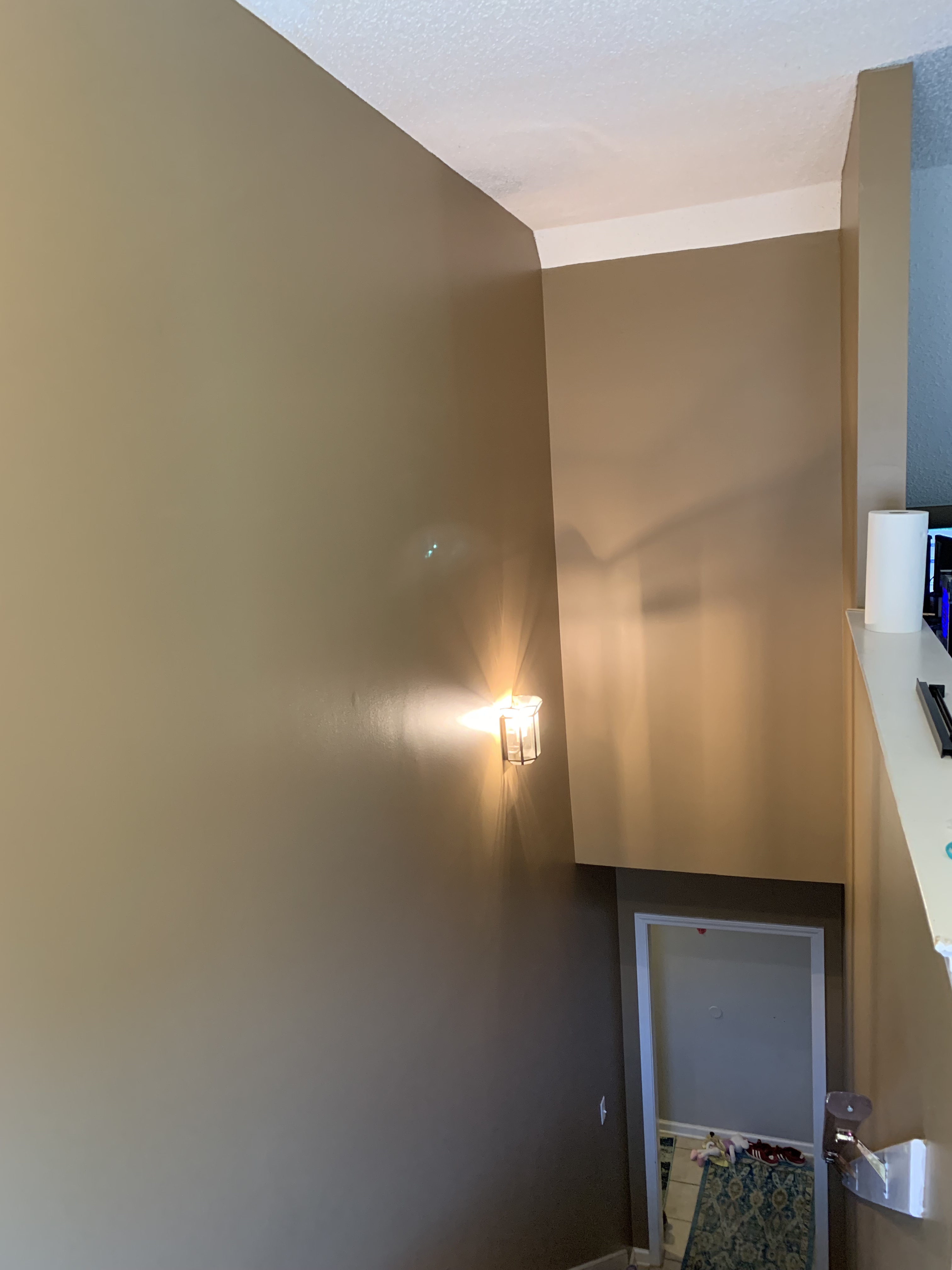 The third painting task was the most challenging and the one I had intentionally saved for last. It was the stairs up to the second floor along with two hallways. After going through the doorway/alcove on the first floor, the stairway opened up to the full height of the second floor, at least 20 feet high.