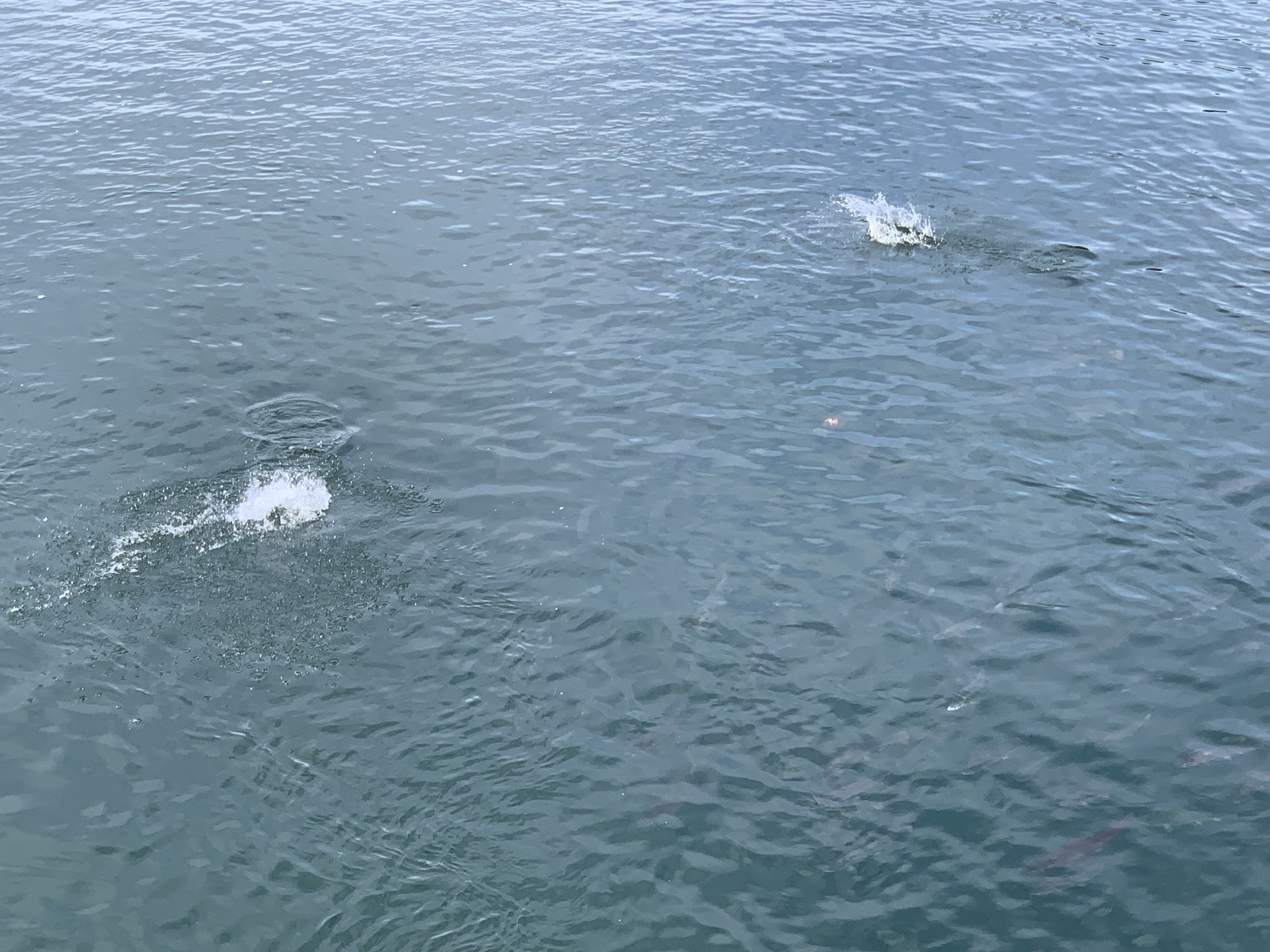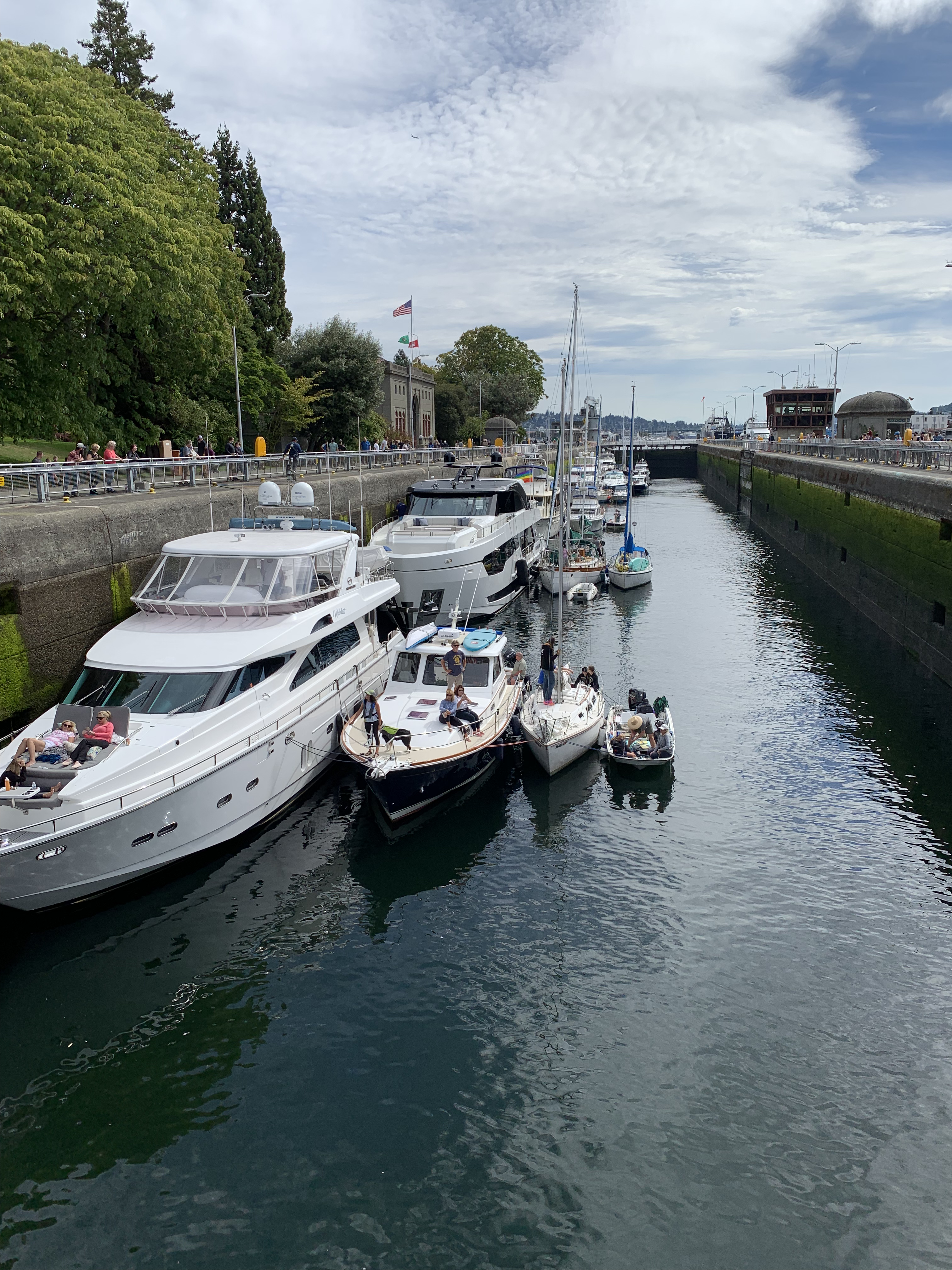 Our next walk took us over to Ballard Locks where on a busy holiday Saturday, we saw many huge yachts and pleasure craft lining up for the drop down to sea-level. Once closed, it was amazing to watch how fast the water drained from the lock lowering the boats down. Then it was over to the fish ladder which is a part of the locks. Walking across the dam, we could see schools of salmon near the entrance in almost a bull pen-like fashion warming up for their multitude of jumps necessary to scale the many stairs.