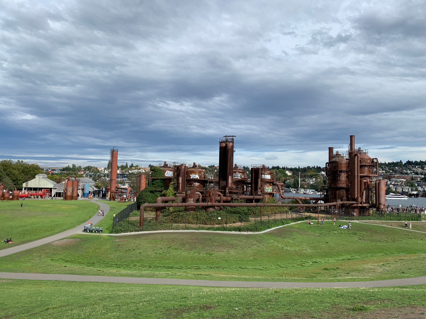 Needing to work off more calories, we took our third walk of the day at the nearby Gas Works Park, so named as the site of the former coal gasification plant from the early 1900s. Interesting remnants of the old plant are still there…