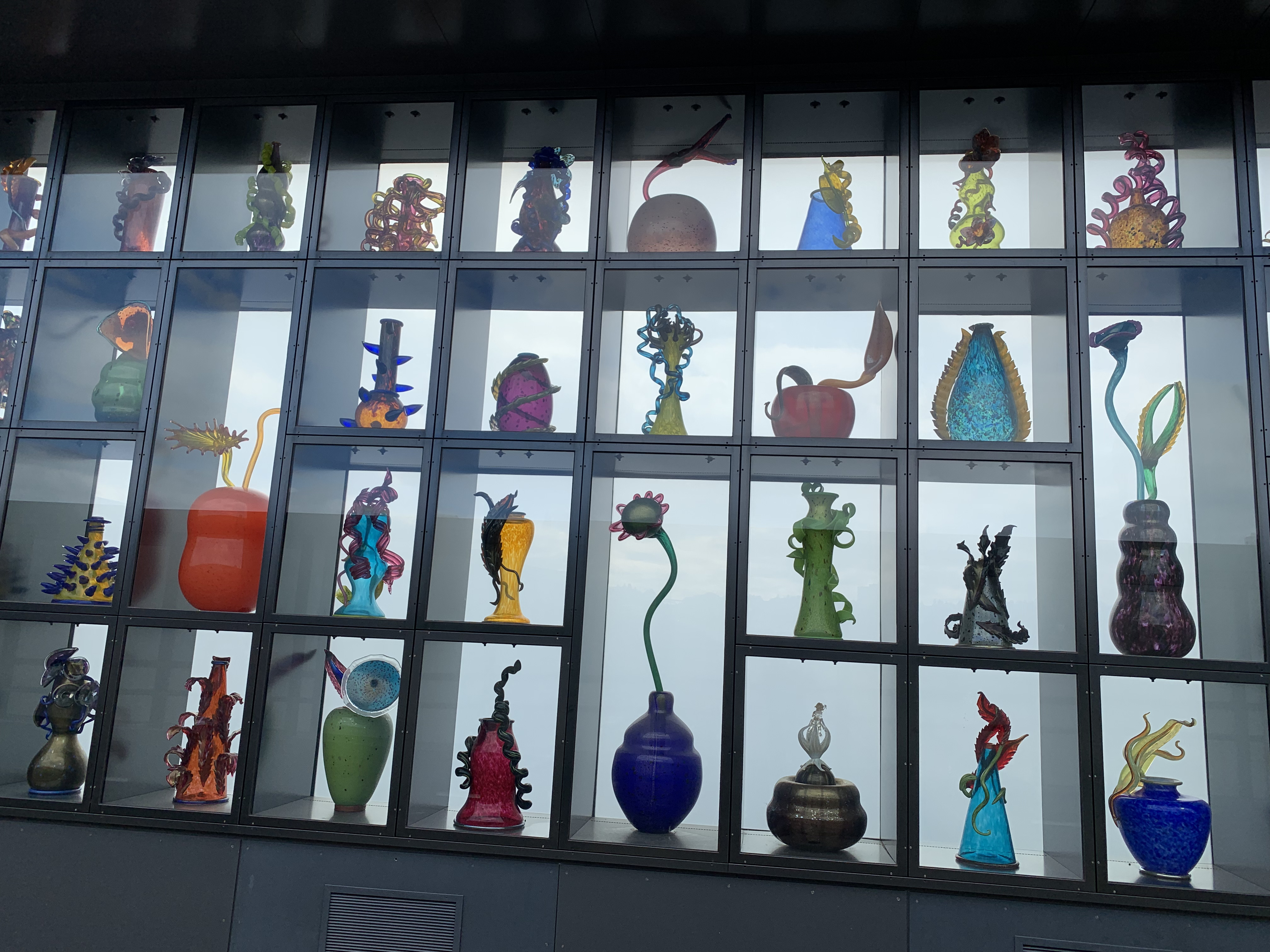 On Sunday, we took a short drive down to Tacoma, birthplace of Dale Chihuly where some of his artwork is on display in public settings. Many of his now familiar shapes grace the old train station—now courthouse, the university across the street and a walking bridge that goes over the highway and connects to the Museum of Glass. Here you can see scores of priceless pieces secured behind glass.