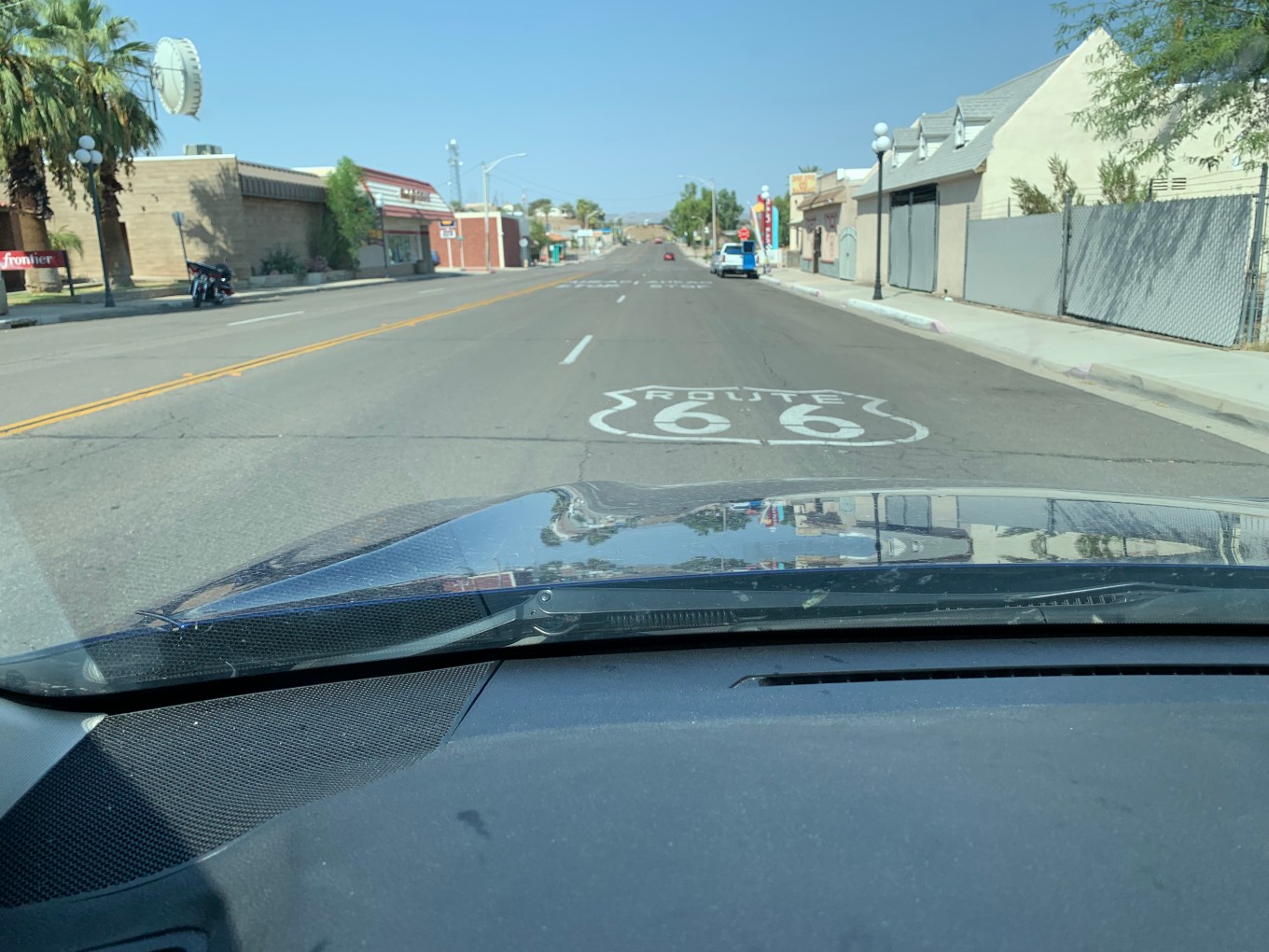 Our only site-seeing stop was in Needles, CA when we hopped off the highway to see one of the historical Harvey Houses, the restaurant/hotel chain that sprung up as the railroads crossed our nation.  To get there, I got to drive on the famous Route 66.