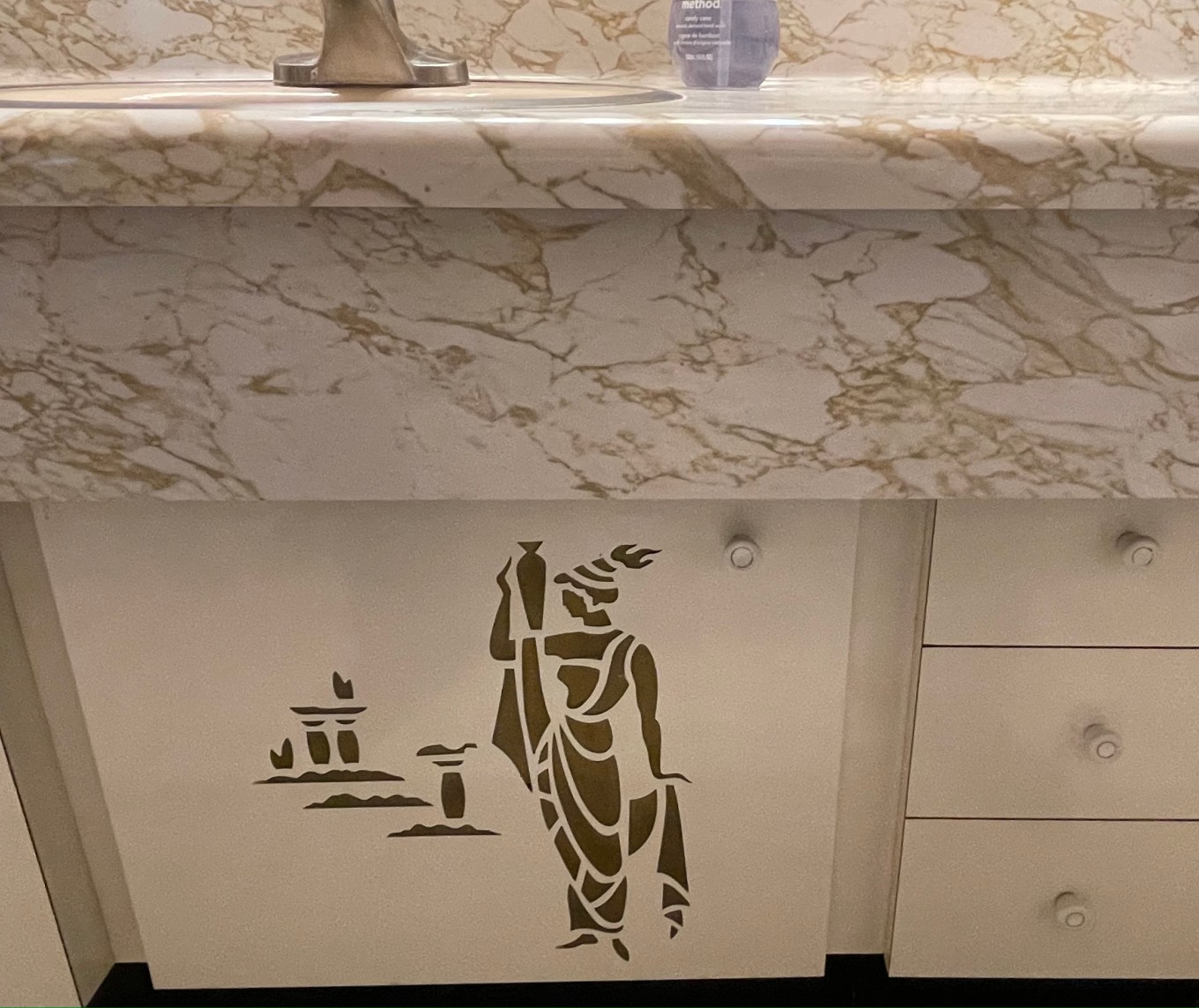 There were a number of renovation projects and improvements we had been considering over the years.  The downstairs half-bath/powder room was one area we felt really needed a refresh.  When we moved in, it had a kind of Greek deity/architecture theme going on, especially the design of the white wood vanity.