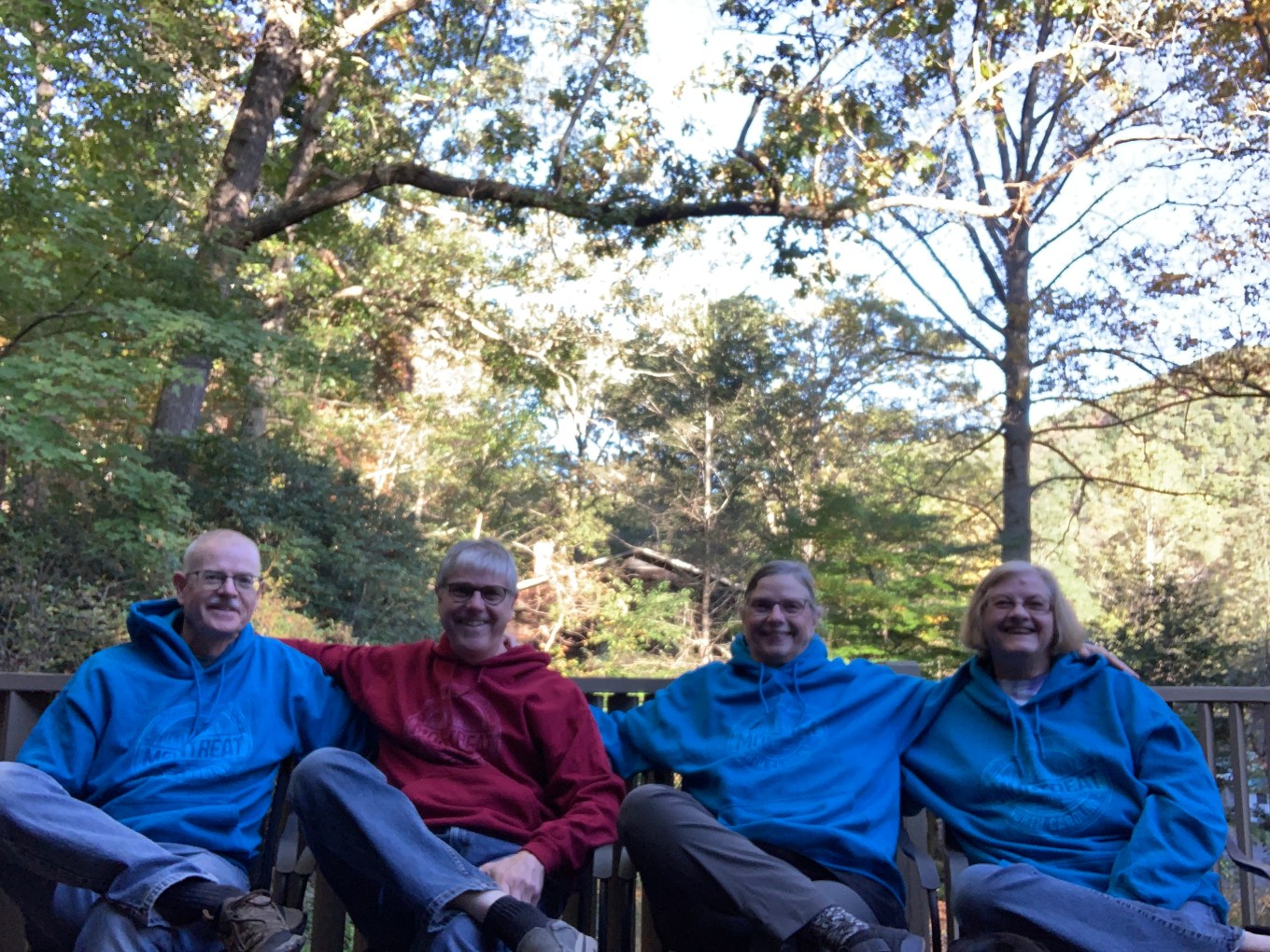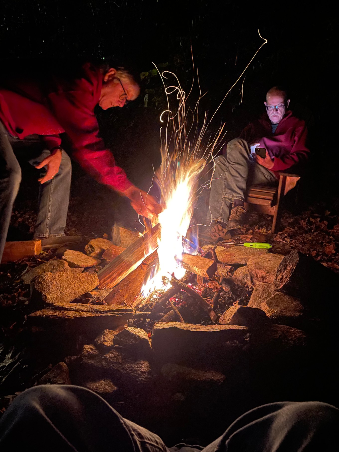 We captured our annual photo together in our new Montreat hoodies, me being the red’man out since they didn’t have my size in blue. That night, our sister, a former girl scout built a big fire in the fire pit (after my brother and I had failed)…