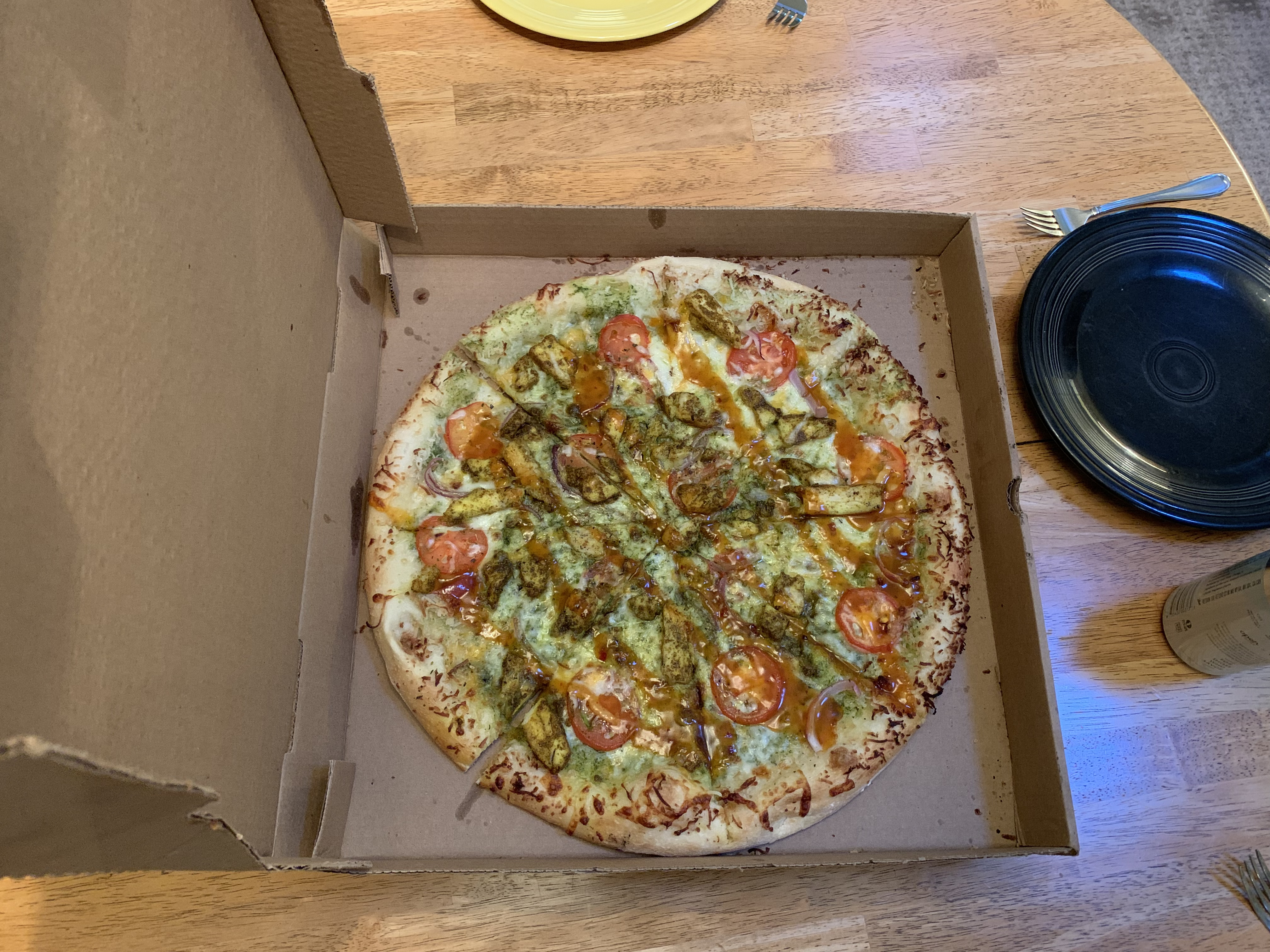 Rather than having dinner at a third craft brewery/brew pub we had planned to visit, we picked up the delicious pizza we had been looking forward to, a pesto base, curry chicken with toasted coconut crust and a crowler (32 oz. can) of their beer and took it back to our house.