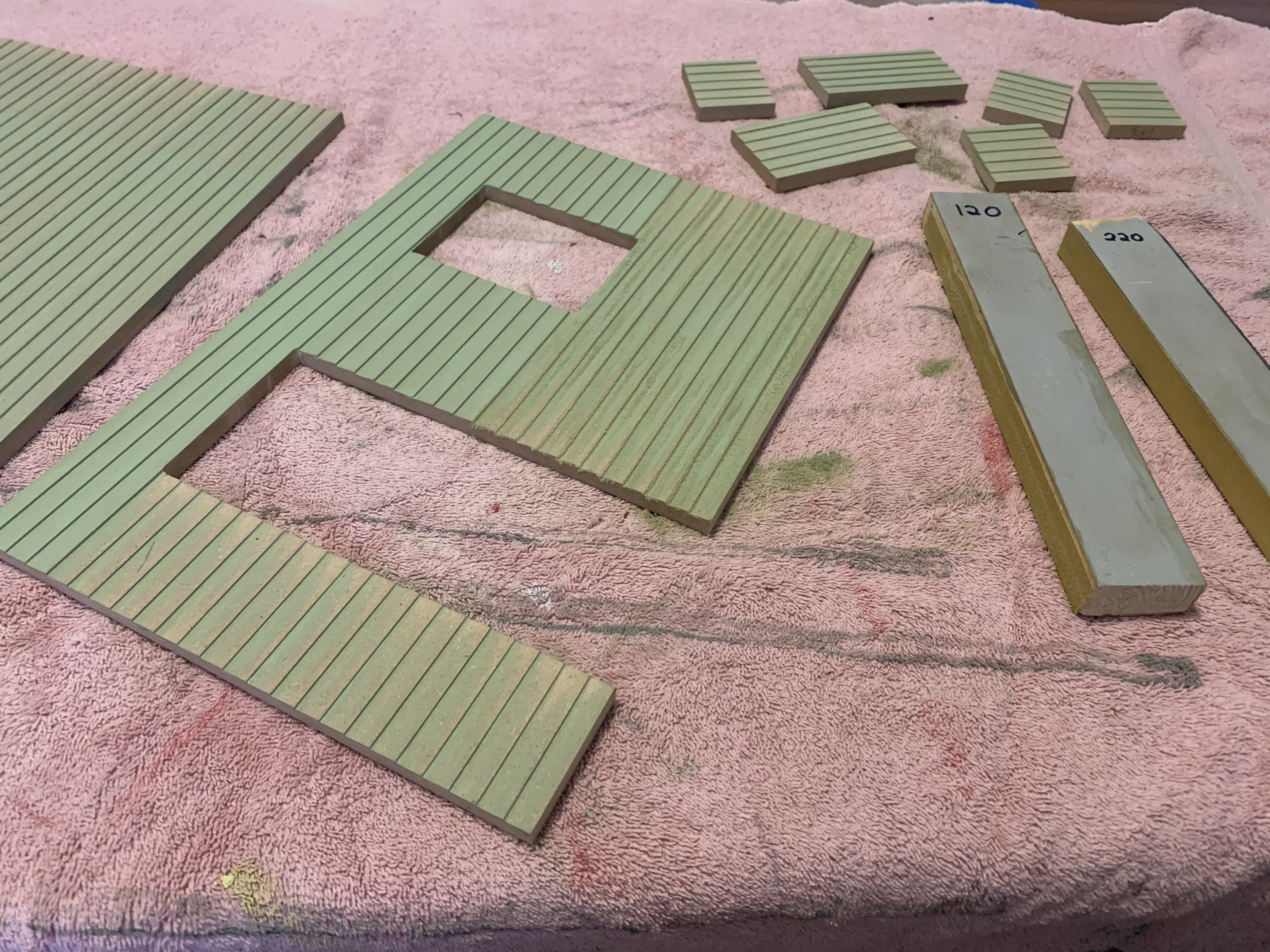 I then started what I have written about before as the most tedious, tiring, and labor-intensive step—painting and sanding the exterior clapboards between coats of paint. As the instructions indicated, I had to be careful not to wear down the bottom edge of the simulated clapboards which had been machined into the smooth medium density fiberboard (MDF). On this my third dollhouse made from this material, I tried a third different approach. After painting the first coat, I used a home-made sanding block to first sand with 120-grit paper and then with 220-grit paper, vacuuming the dust off between sandings.