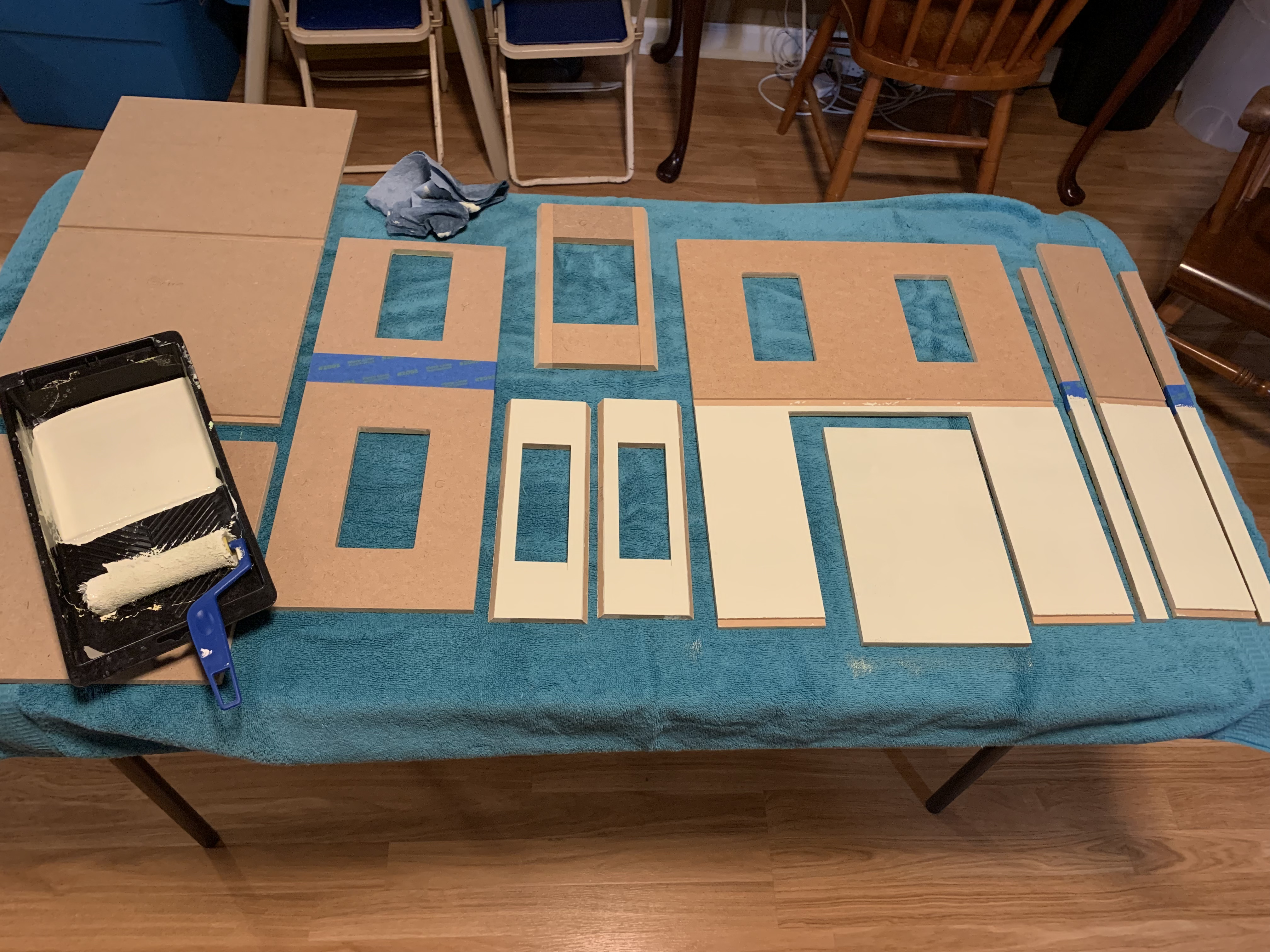 This kept the roller and pan from drying out which was much easier than cleaning everything up. A couple of hours later, I rolled the second coat which was all that was needed to provide a nice finish. This was a much easier approach than the previous brush painting that I had done on the other doll houses which took as many as four coats to adequately hide the brown MDF material.