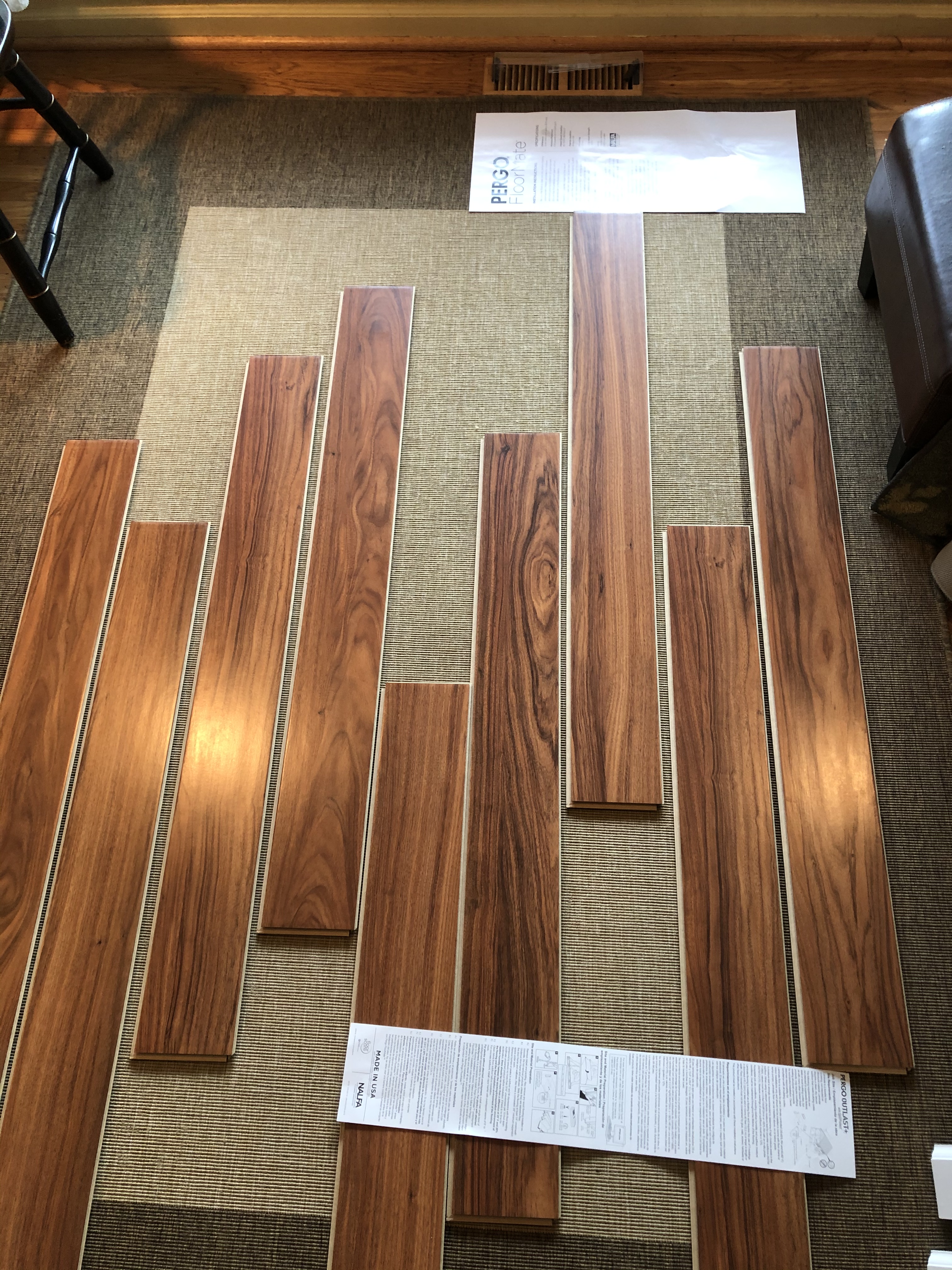 I felt it would be helpful to lay out the planks in another room.  Even with this planning, I could not quite stage the whole project, and discovered later that there were still a few surprises in store.  When I sent the plank layout photo to my brother, he replied with a reassuring: