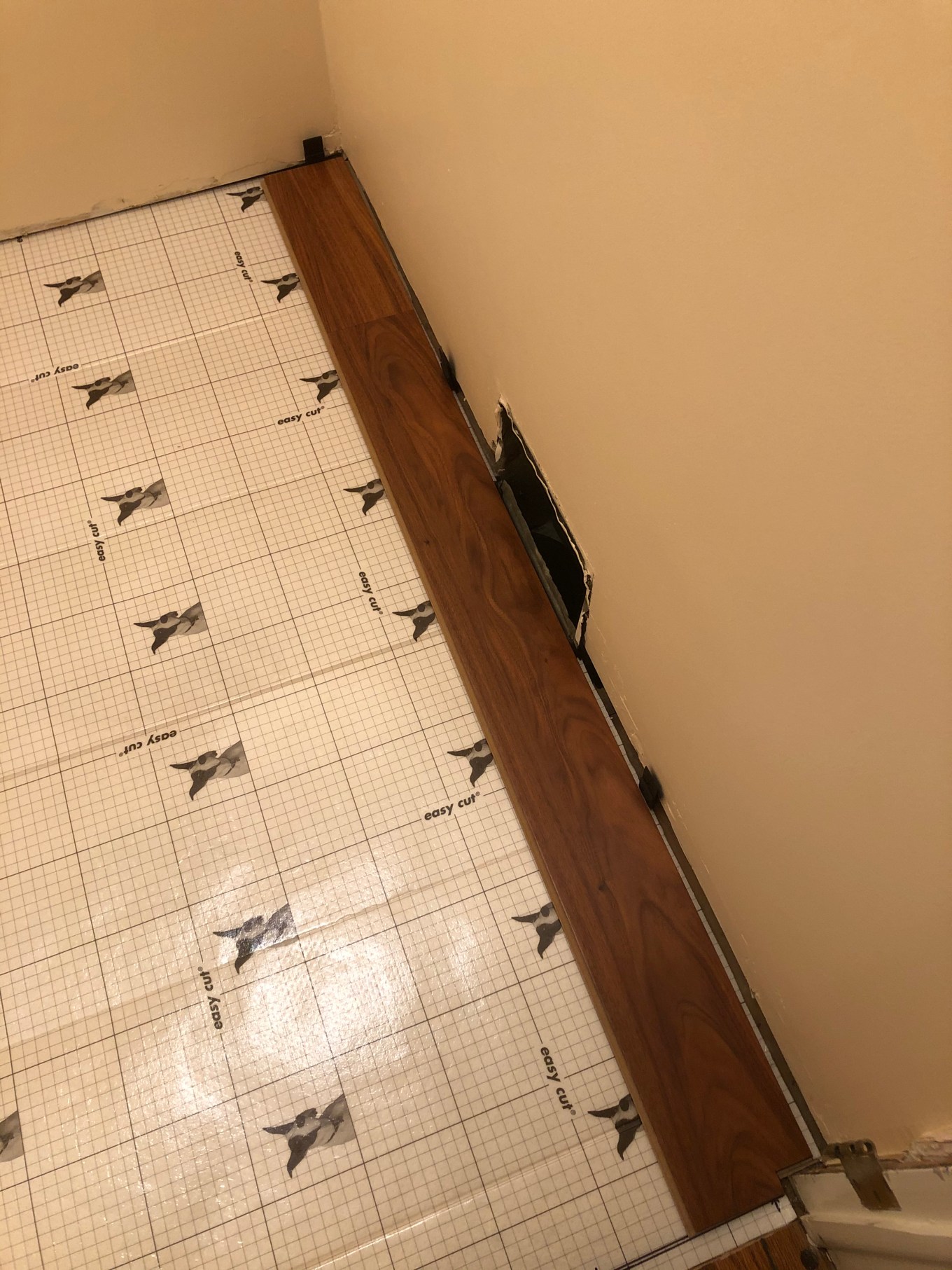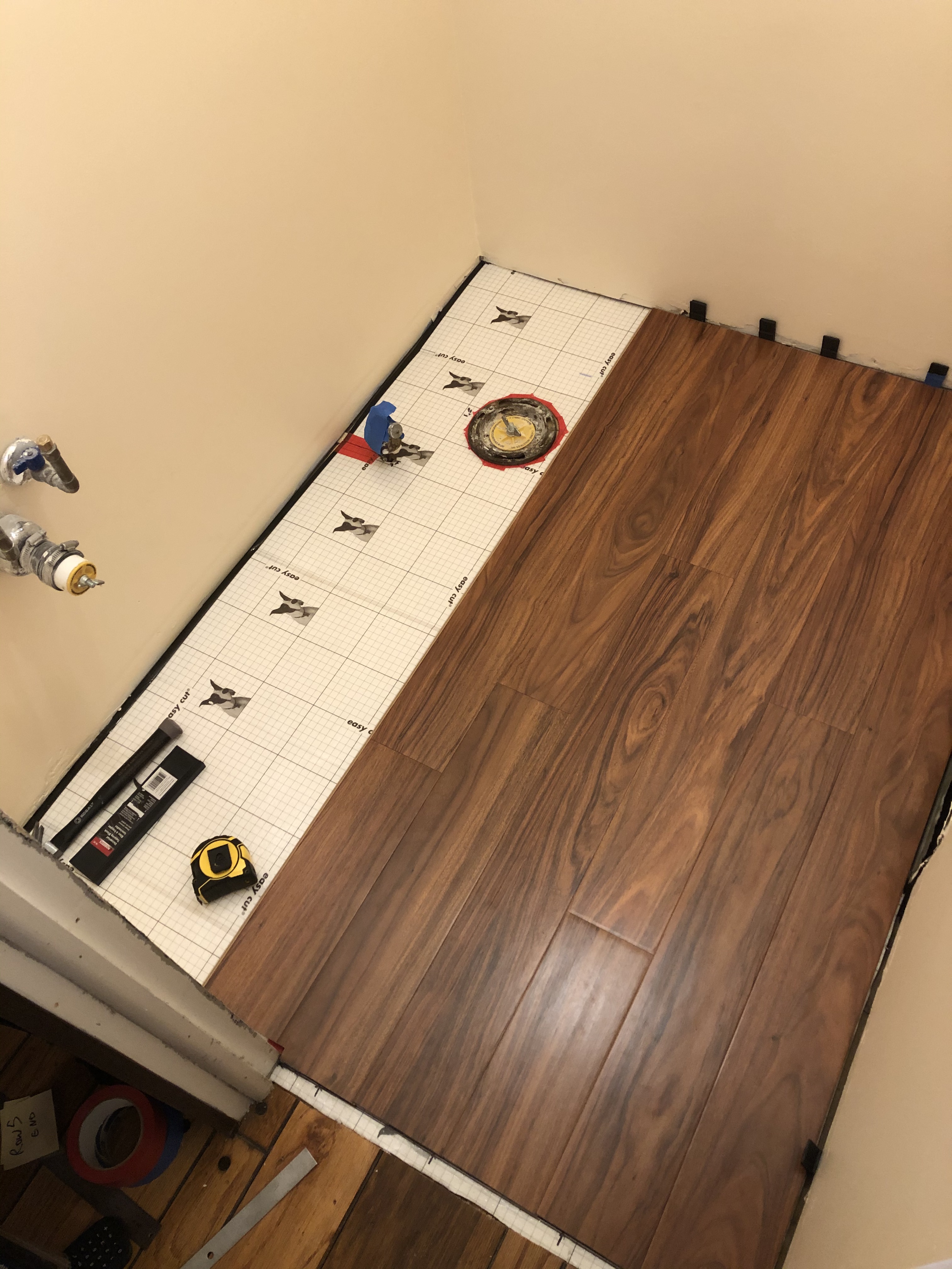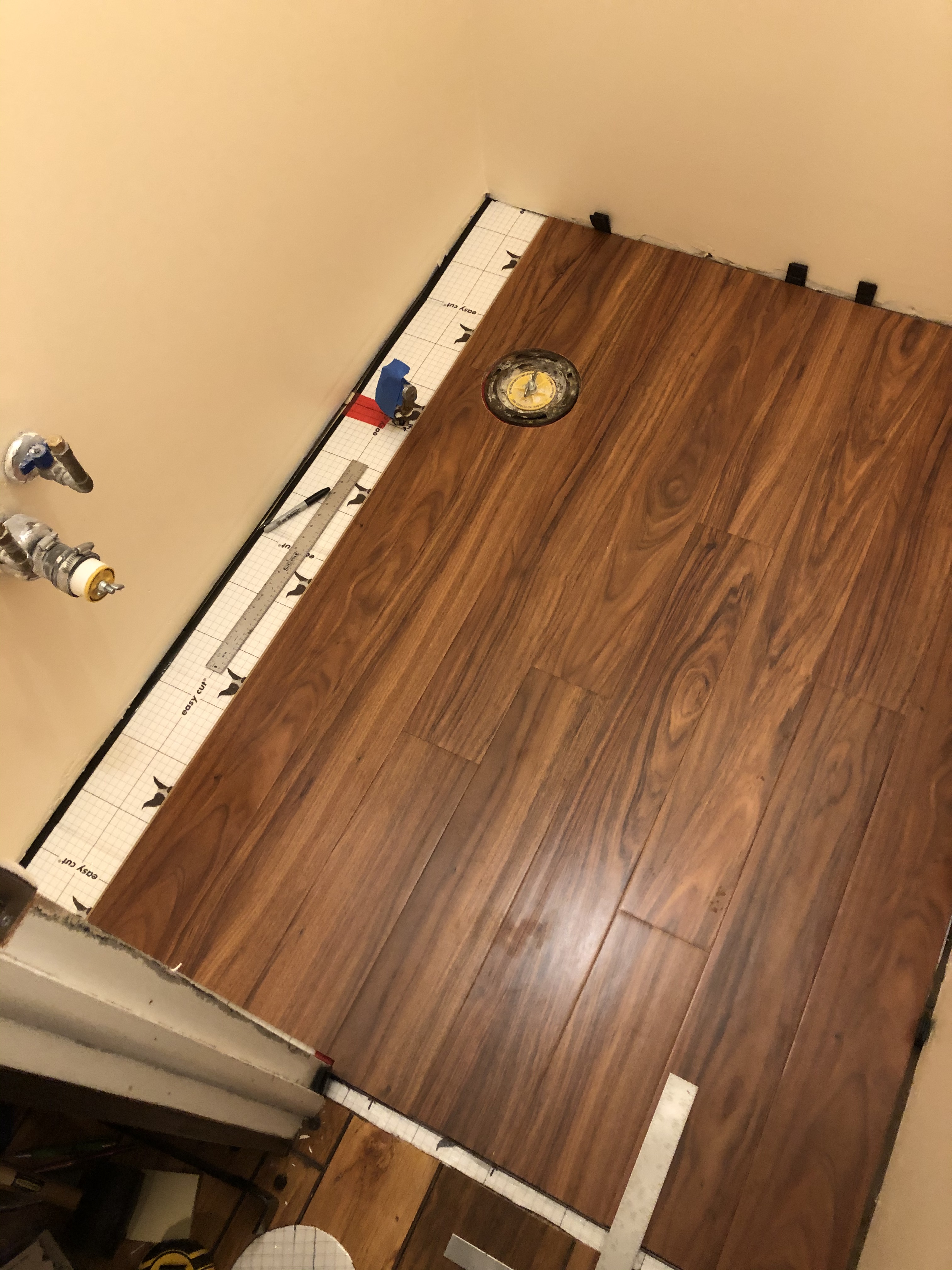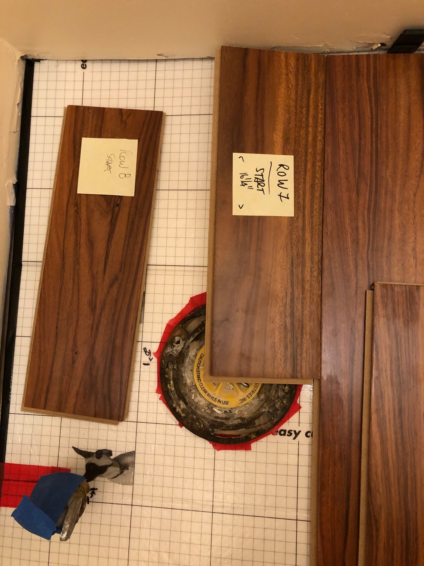 Before cutting and laying the actual floorboards, I needed to put down the underlayment that would serve as a base beneath the flooring planks.  This required cutting the underlayment to size, including a hole for the toilet drain, and fitting it all together.  Another photo and text thread to discuss progress:
