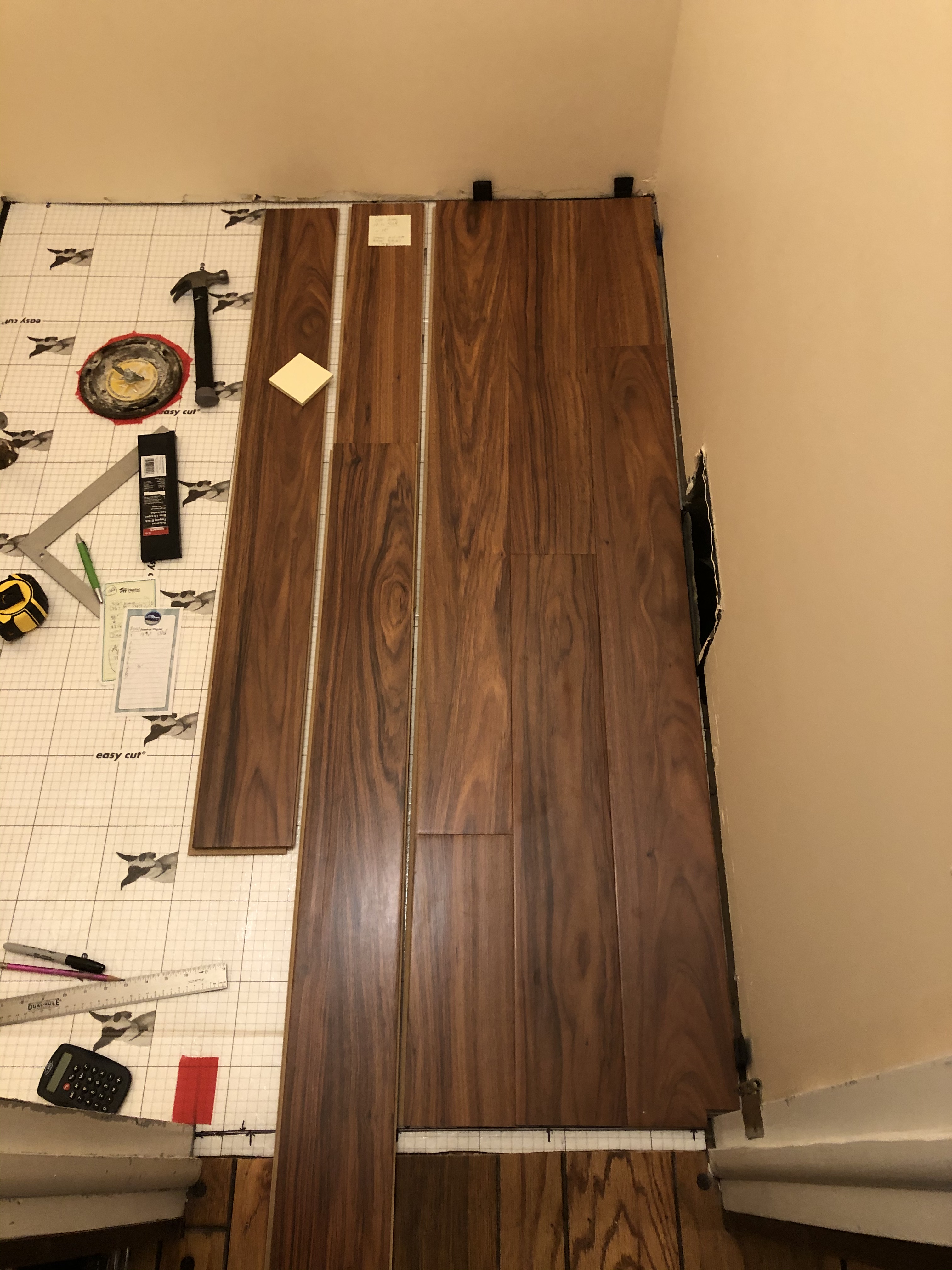 Then, I was ready to start with the floor itself.  There is an age-old adage that is familiar to any DIY-er: Measure twice. Cut once.  I can add the following important addendum when one is working with tongue-and-groove laminate flooring: make sure you know which end of the plank to cut off.  It is not possible to piece the floor together if you cut the wrong end of the board.