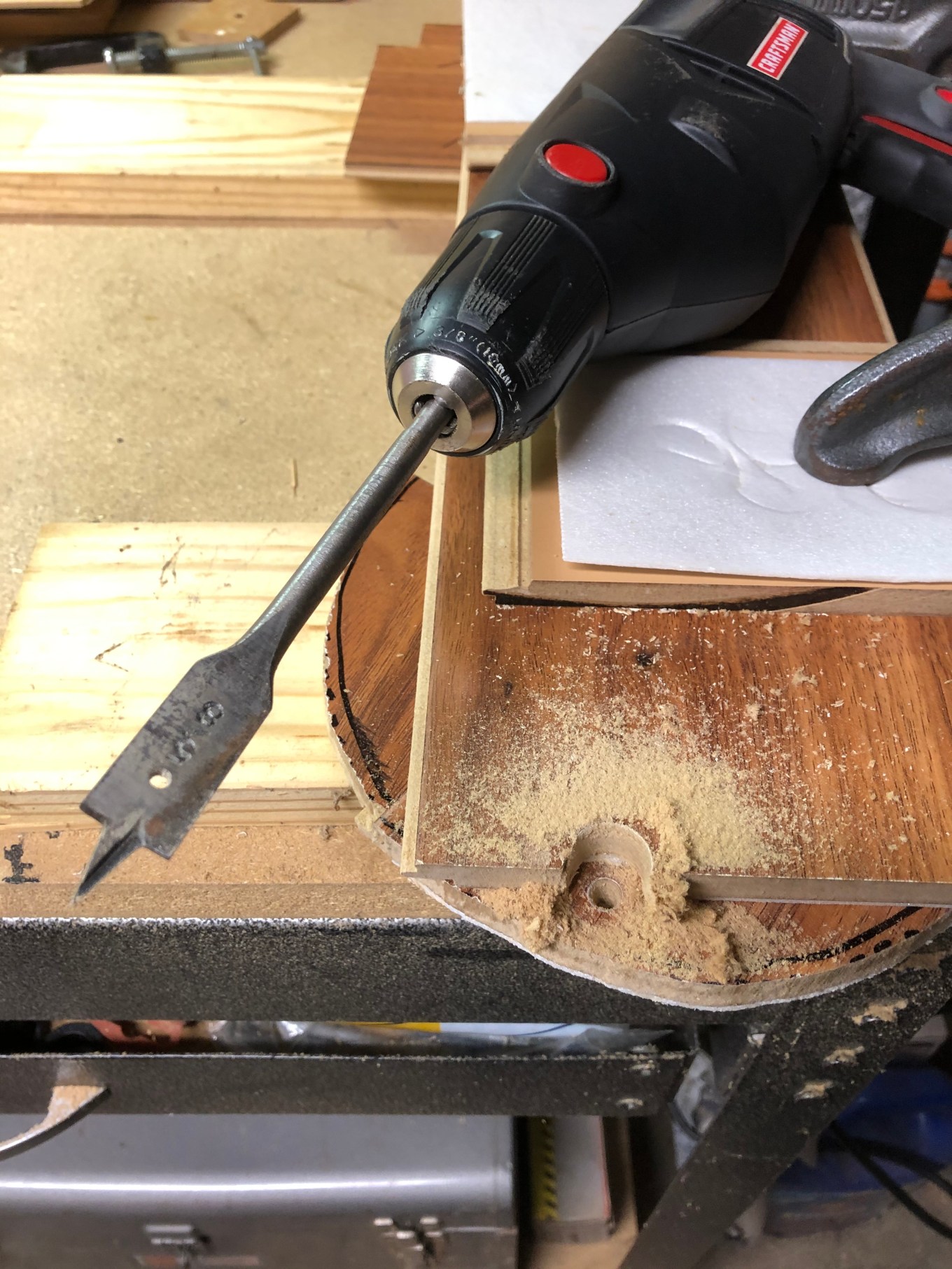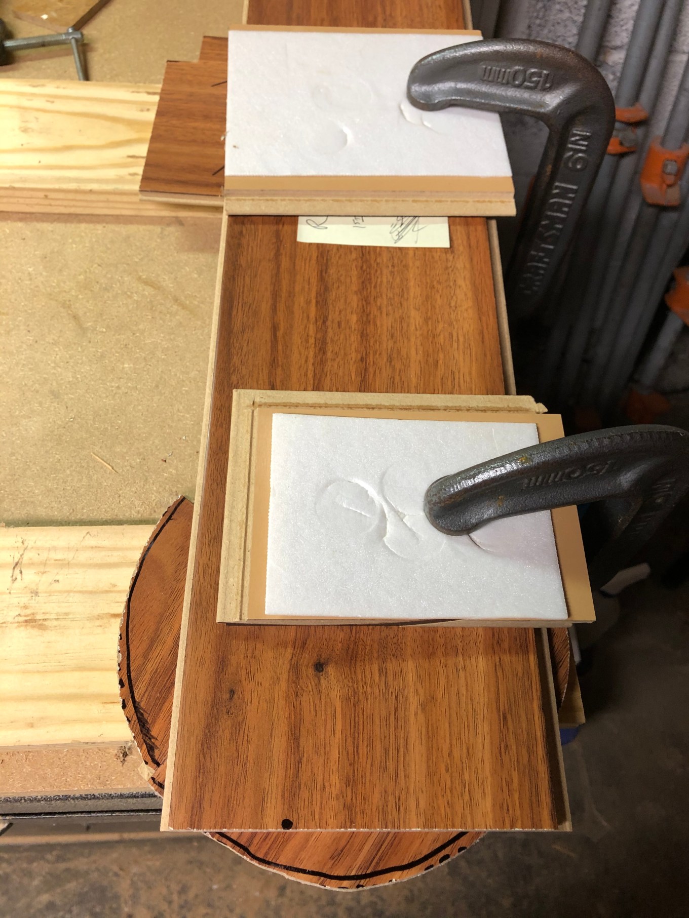 To drill the hole, I put together a “contraption” consisting of C-clamps, with the foam-backed leftovers from previously cut floorboards, to secure the plank that I intended to use while avoiding clamp marks on it. Underneath one end of the plank, I used another board (the leftover material from the toilet flange hole) to cut into with an electric drill. The plan was to make two half-circle holes at the ends of two boards and fit these together around the water supply pipe. The first text that day to my brother was: