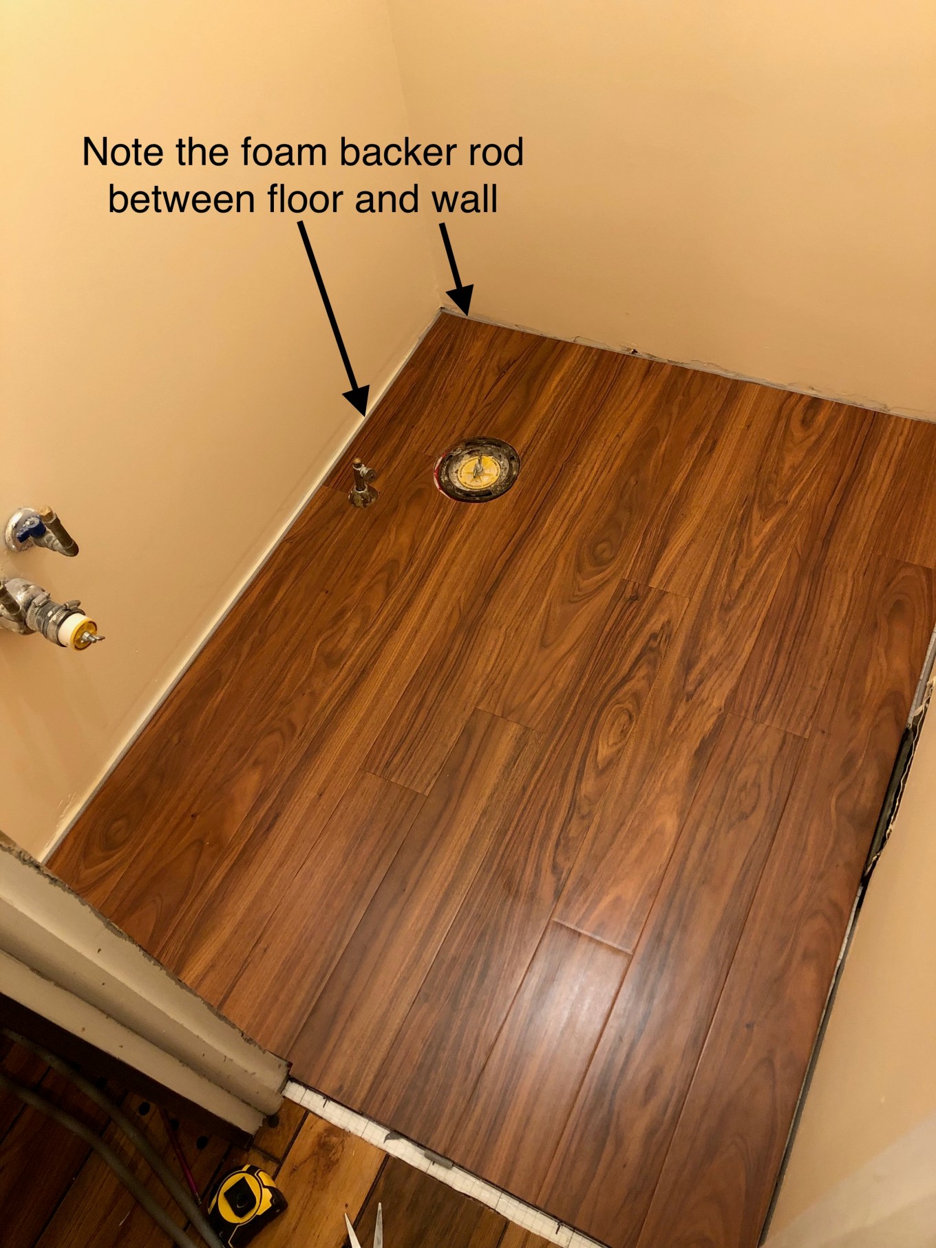 As I progressed with this work, squeezing the foam backer rod between the edge of the floor and the wall, I noticed it made the first row of planks buckle up. Try as I might, I could not get that section of the floor to lay flat again. Frustrated, I finally looked under the planks and saw that a short piece of the foam backer rod had rolled under the plank. Yikes! Trouble with one of the simplest steps! The floor looked ok once I removed the stray piece of foam.