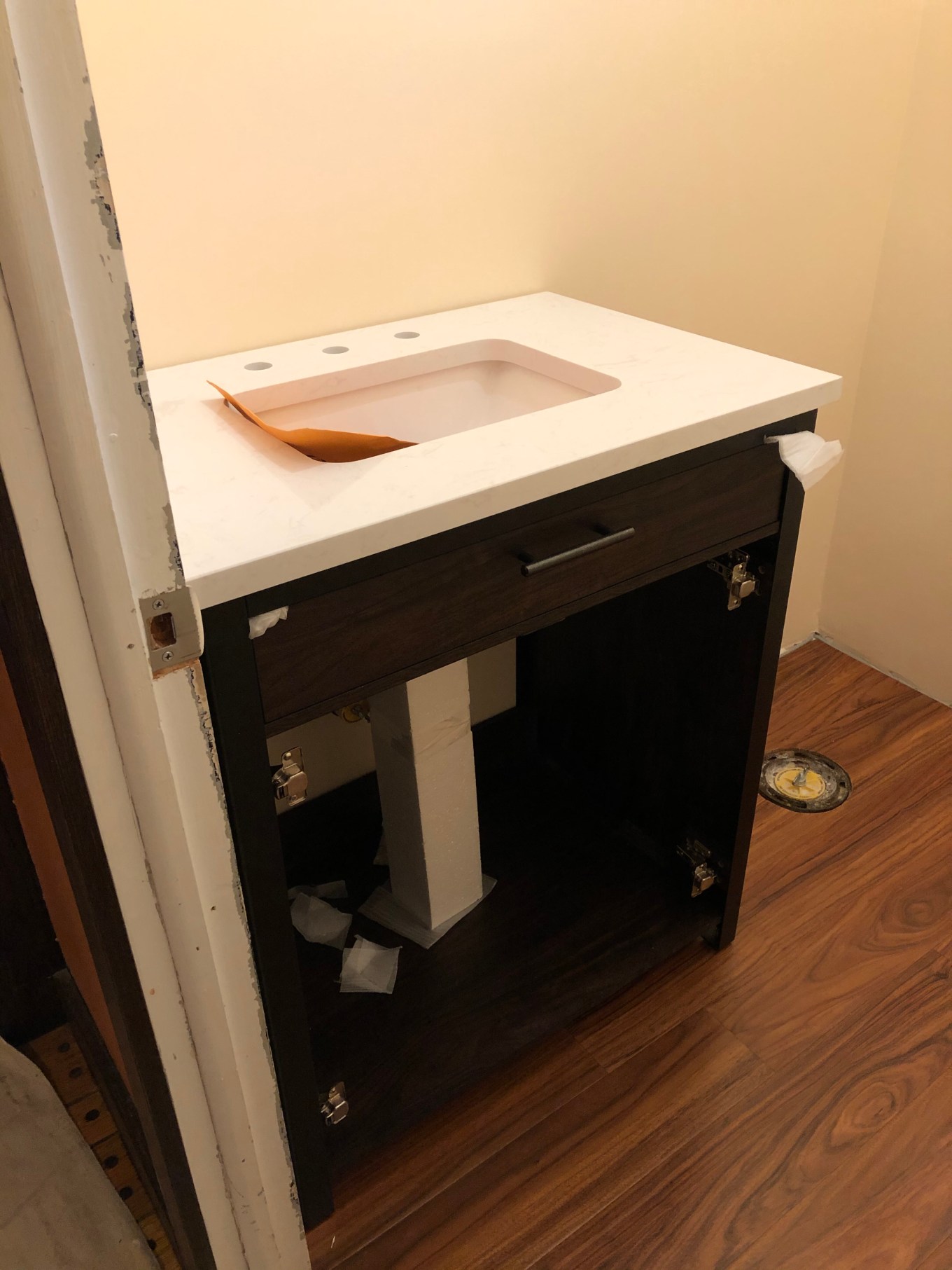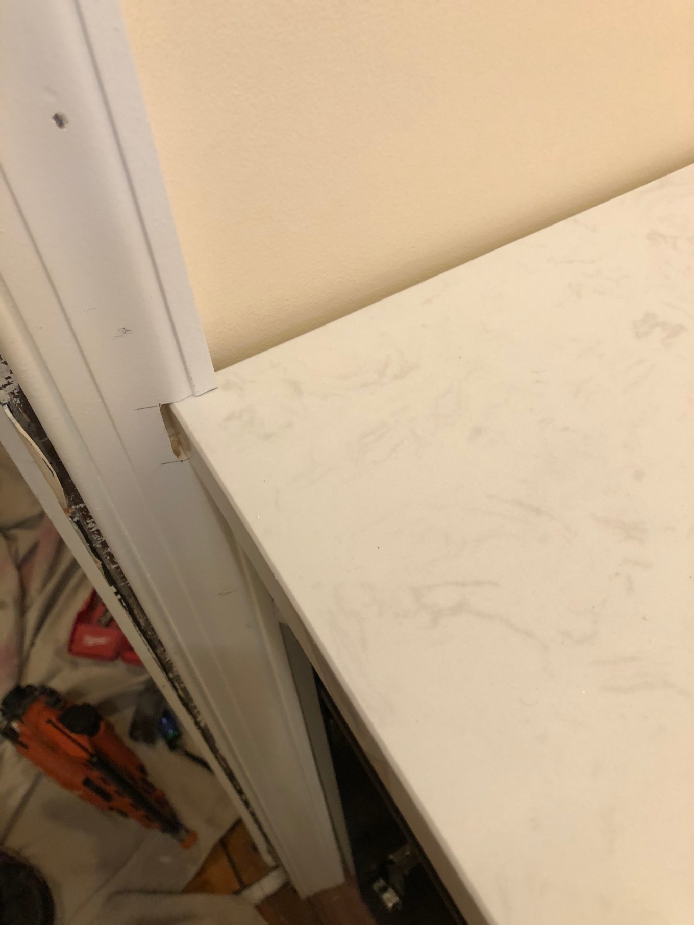 (A minor point in the photo above: the carpenter did not attach the baseboard and quarter-round trimalong the right-side wall, the one where the yet-to-be-received air vent would be placed. I will come back to this later in the story.) As he moved on to the door-frame molding, he discovered the vanity top was just a bit too deep for the available space, which forced him to cut a notch in the molding.