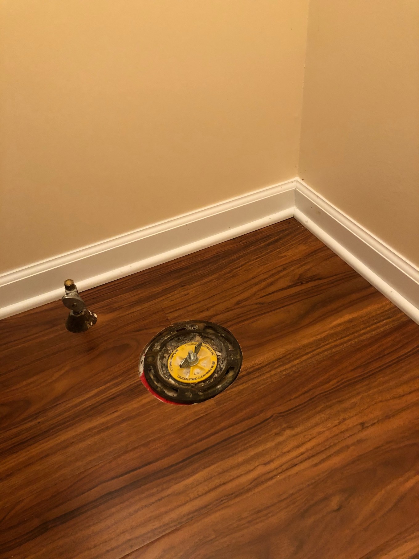 The next step in the waterproofing was to apply permanent silicone sealant, smoothing it carefully. As I considered this, I knew that putting down an even bead of silicone might look nice, but it would be difficult for me. I had tried such a task several years ago, and admit I was not good at it. I then realized that trying to make the powder room floor waterproof would probably be futile anyway. I remembered there was already a hole cut into the floor: the one that was necessary for the toilet water supply pipe coming up from the basement below. So, I sent the following message to my brother: