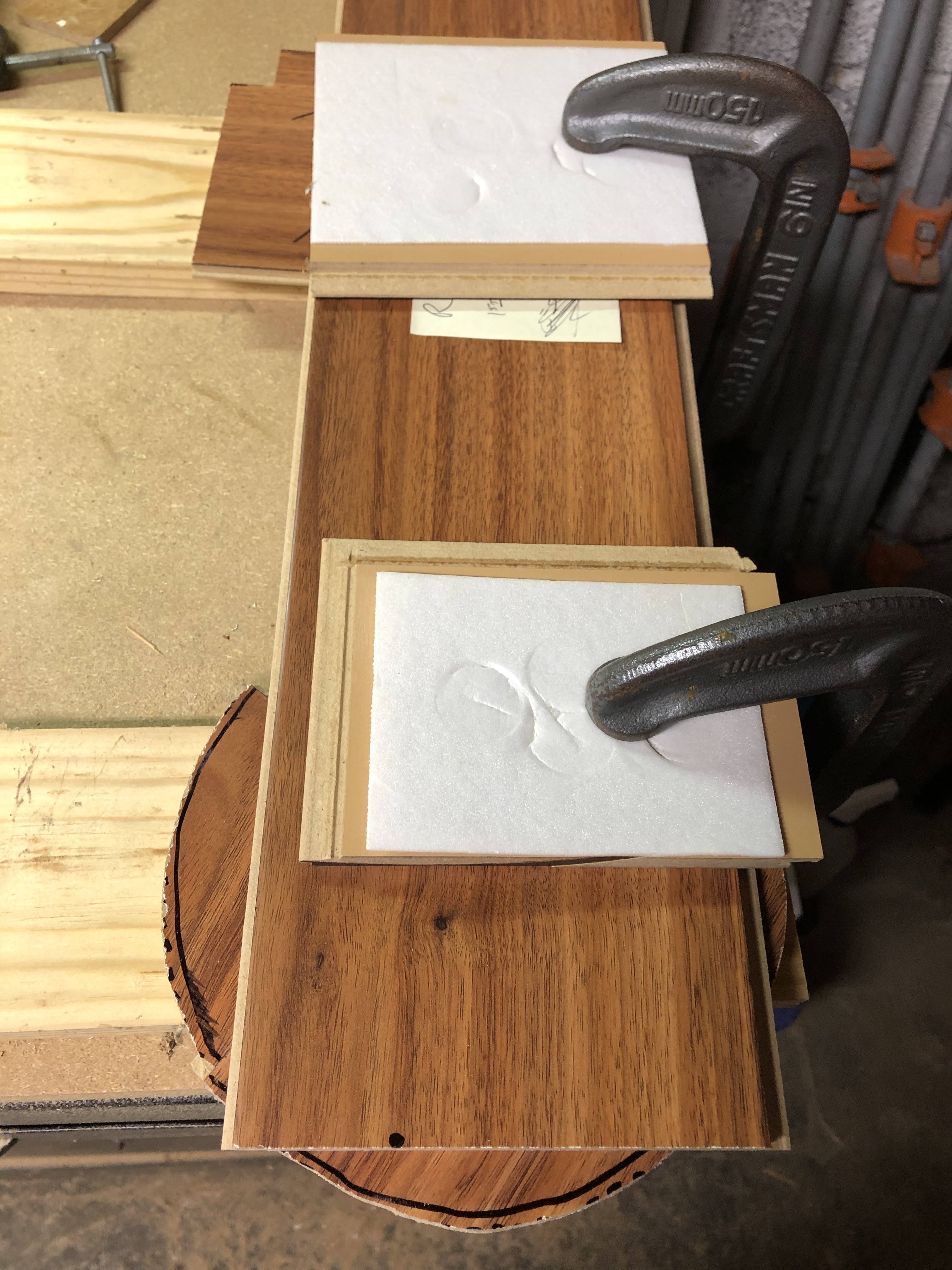 To drill the hole, I put together a “contraption” consisting of C-clamps, with the foam-backed leftovers from previously cut floorboards, to secure the plank that I intended to use while avoiding clamp marks on it. Underneath one end of the plank, I used another board (the leftover material from the toilet flange hole) to cut into with an electric drill. The plan was to make two half-circle holes at the ends of two boards and fit these together around the water supply pipe. The first text that day to my brother was: