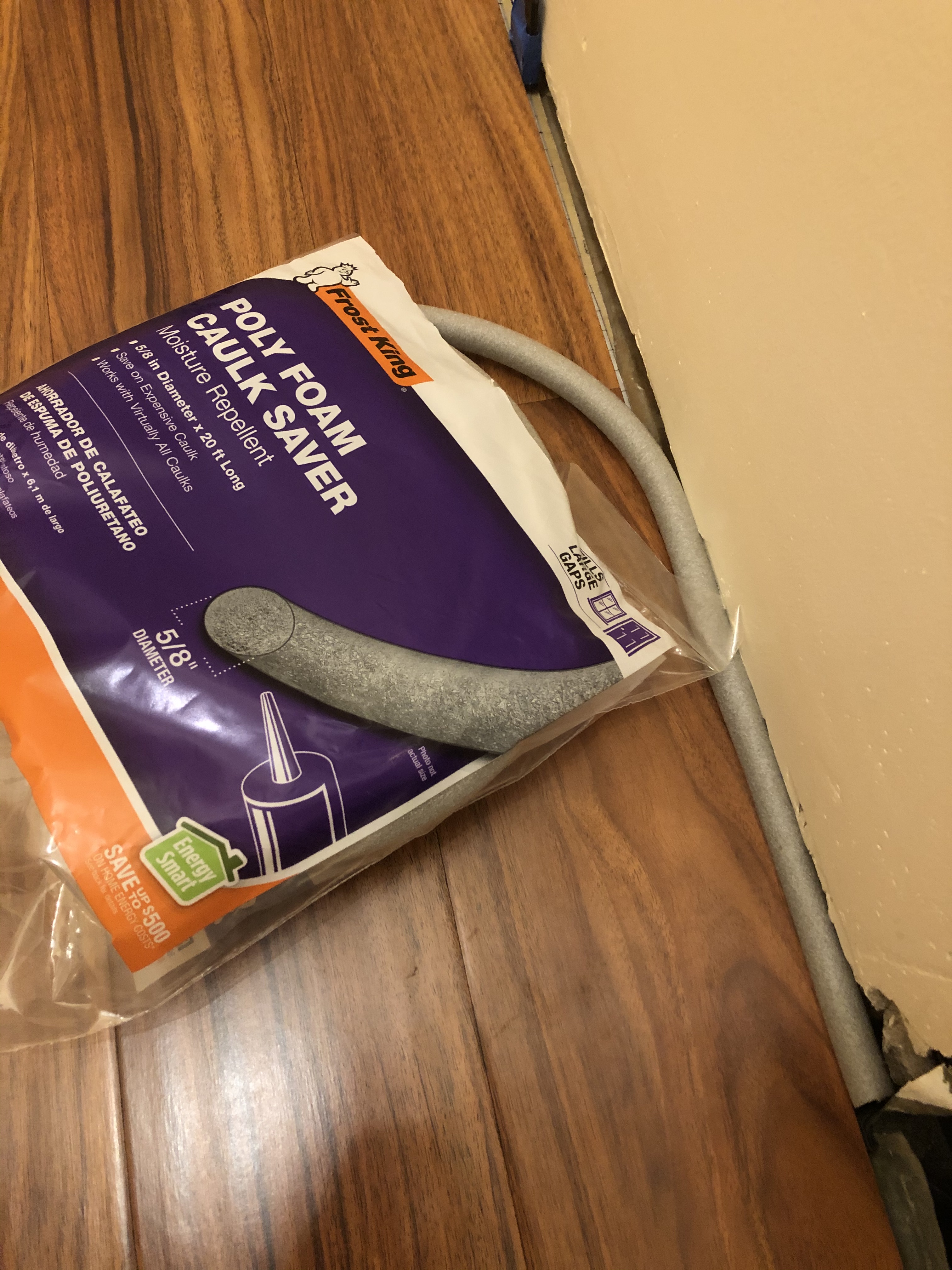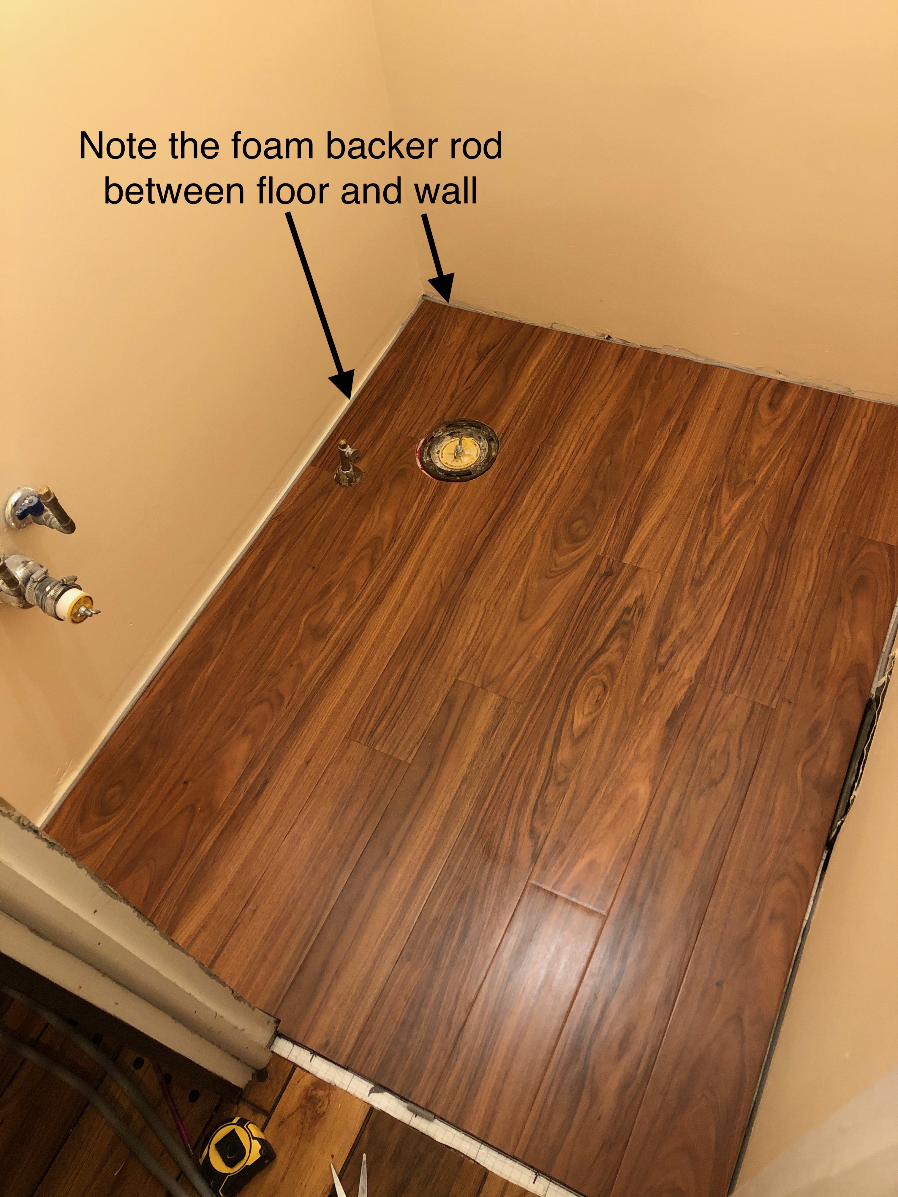 As I progressed with this work, squeezing the foam backer rod between the edge of the floor and the wall, I noticed it made the first row of planks buckle up. Try as I might, I could not get that section of the floor to lay flat again. Frustrated, I finally looked under the planks and saw that a short piece of the foam backer rod had rolled under the plank. Yikes! Trouble with one of the simplest steps! The floor looked ok once I removed the stray piece of foam.