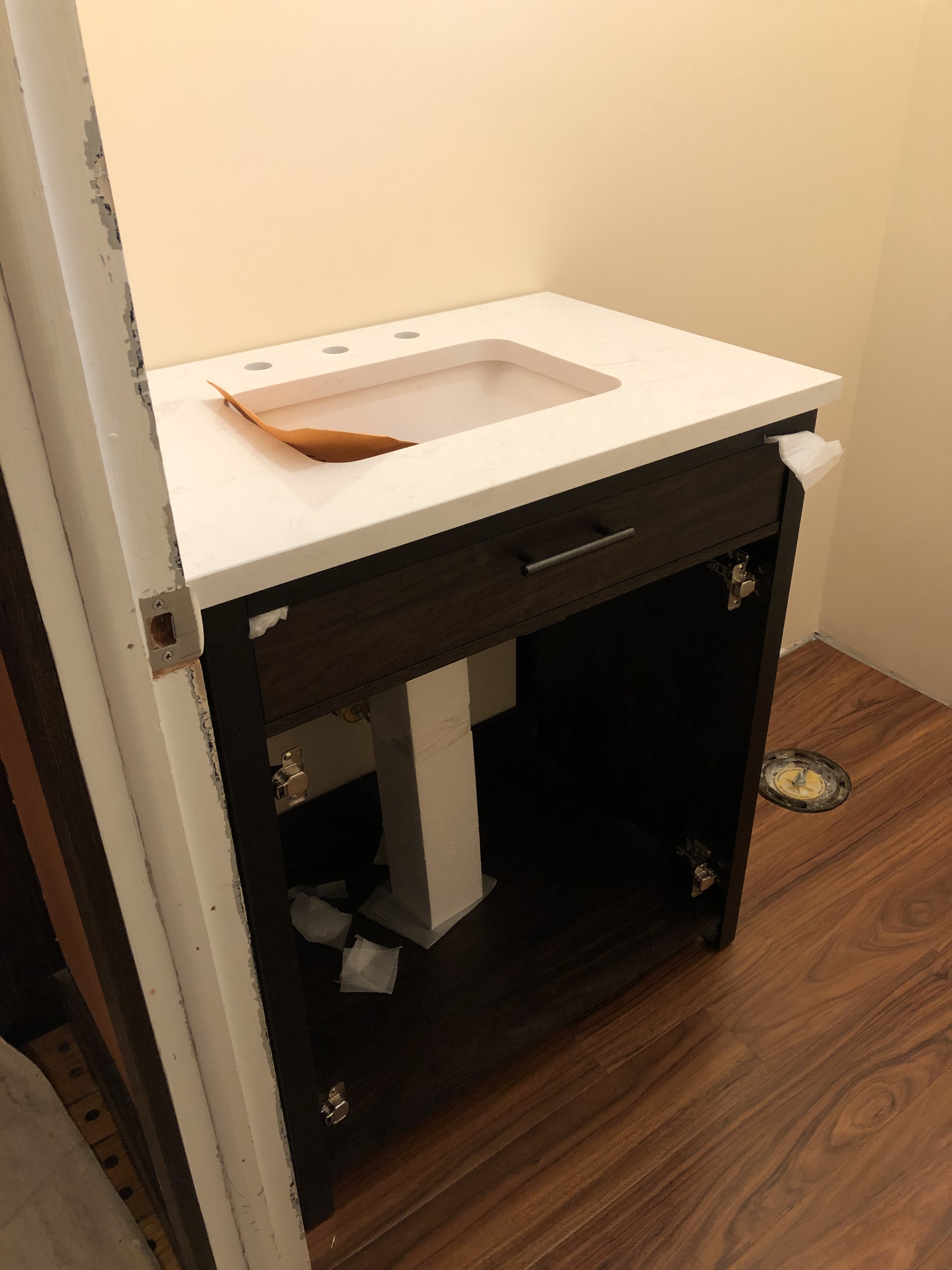 He also discovered, again not surprisingly with this house, that the corner of the wall was not square, resulting in a gap between the vanity top and the side wall – the very place that had prompted us to start our renovation project, and where we were trying to prevent any more water damage! (This problem was to be addressed in the last phase of the project.)