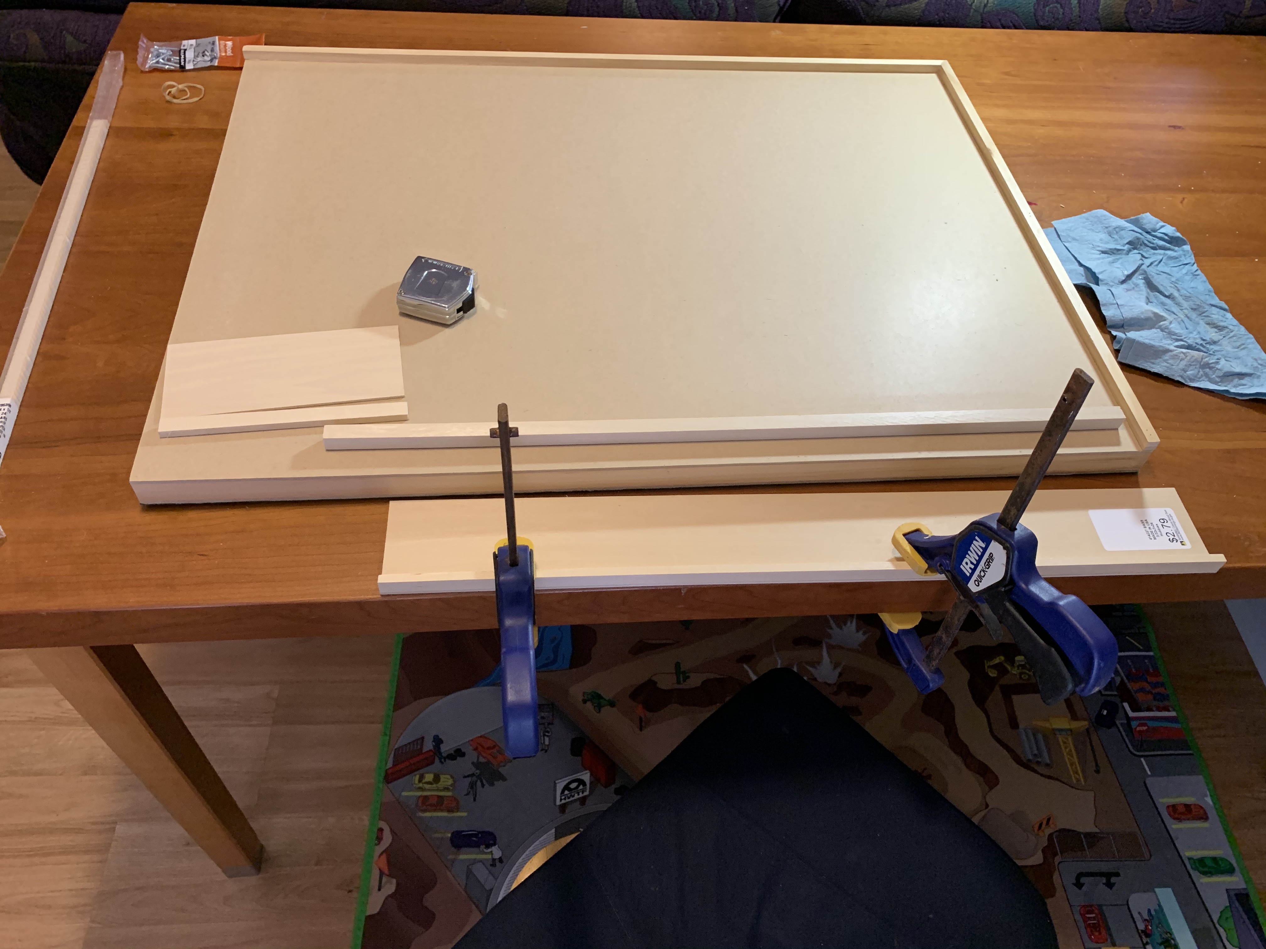 I then glued 1” strips to the bottom to brace the 3” sheet. Since it only came in 24” lengths, I had to piece together an additional 6” to get the 30” I needed. Once the glue had set, I drilled holes through the ½” bracing strips into the puzzle table and screwed the extension on. For the right side, just a ½” strip was all that was needed, secured with 1” blocks.