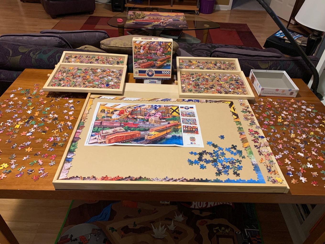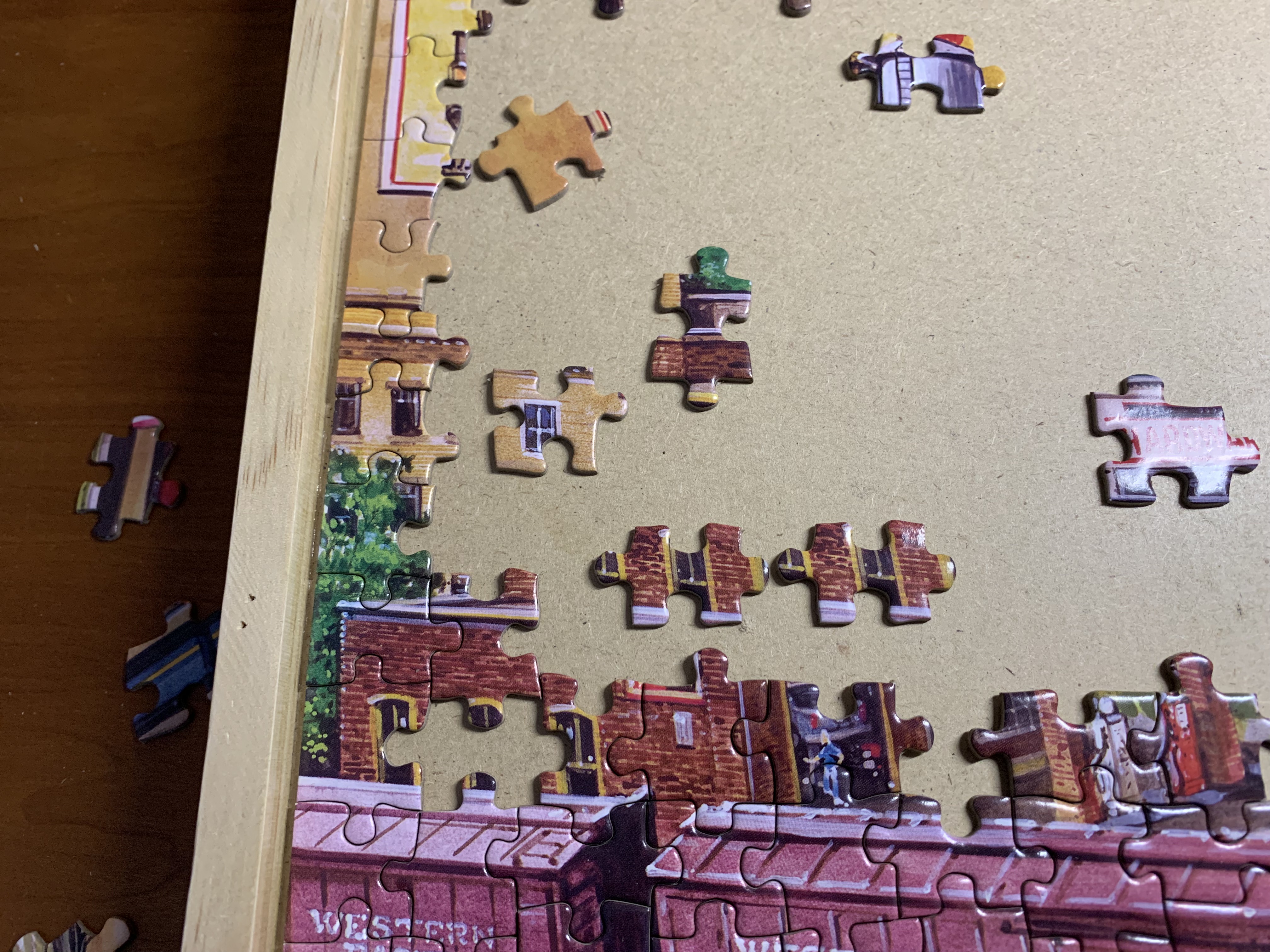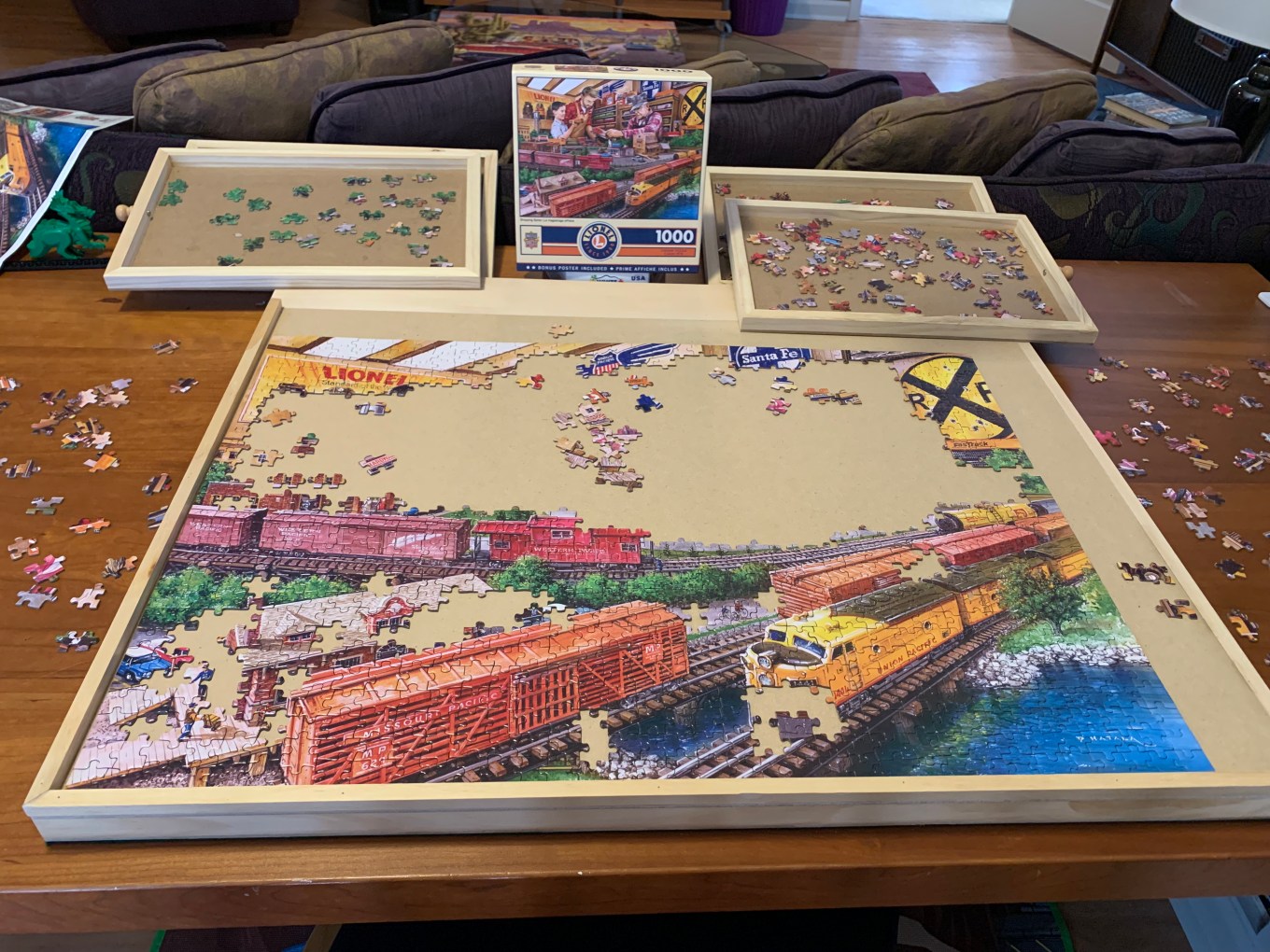 For my second puzzle, I decided to shift from cars to trains, in this case the model train layout. Unlike the previous puzzle, this one did not have a few main color schemes into which the pieces could be sorted so I just randomly set them out on the work surface. As I did so, I managed to find and assemble all but one of the edge pieces.