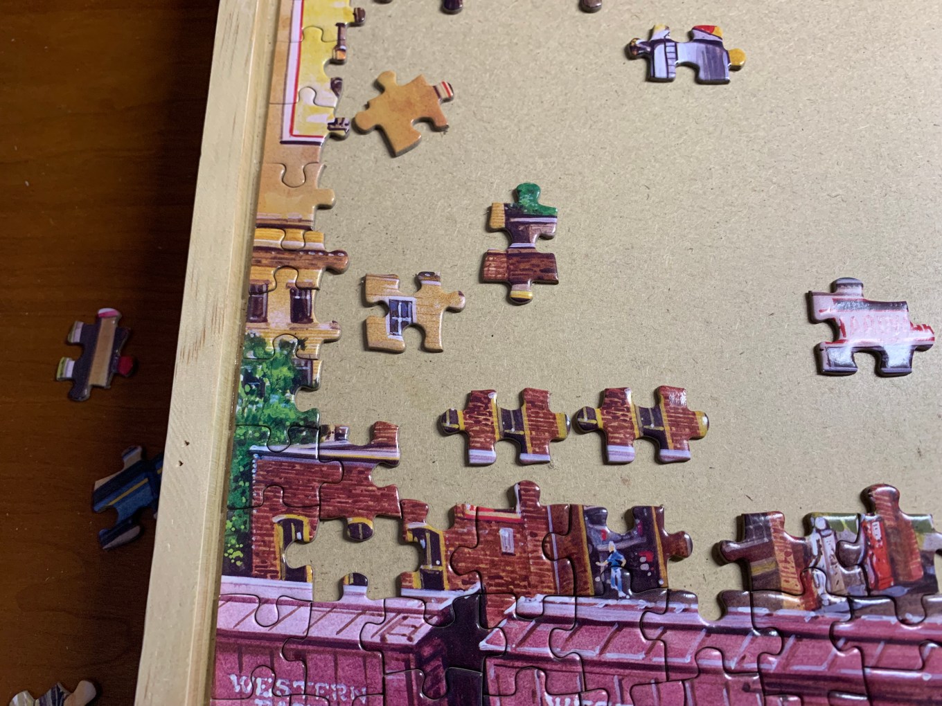 On this puzzle, my wife and on occasion, my almost seven-year-old granddaughter helped work it. Without a major feature like the red car in the previous puzzle to focus on, we worked from the edges to the center on several different sides at the same time.