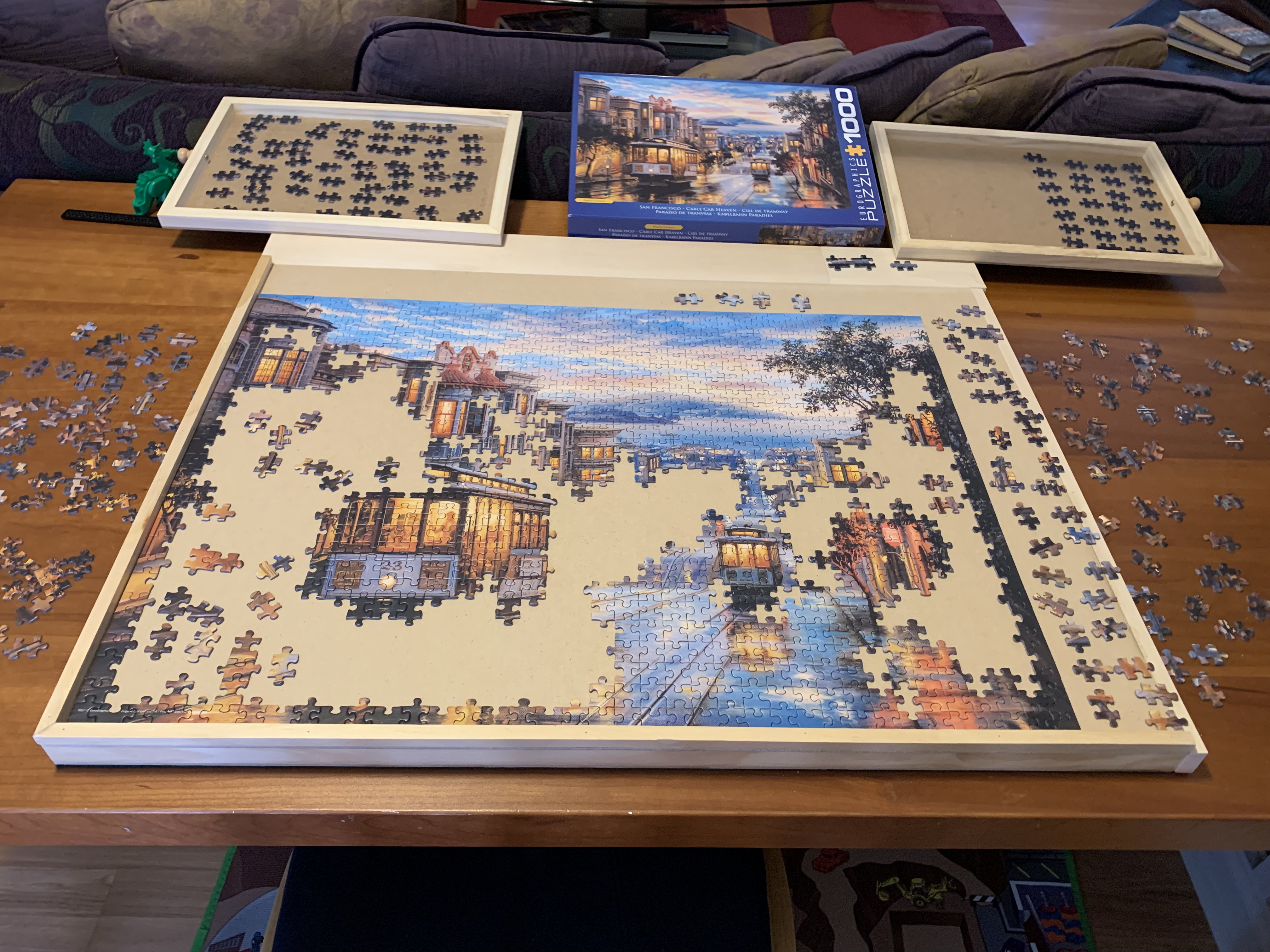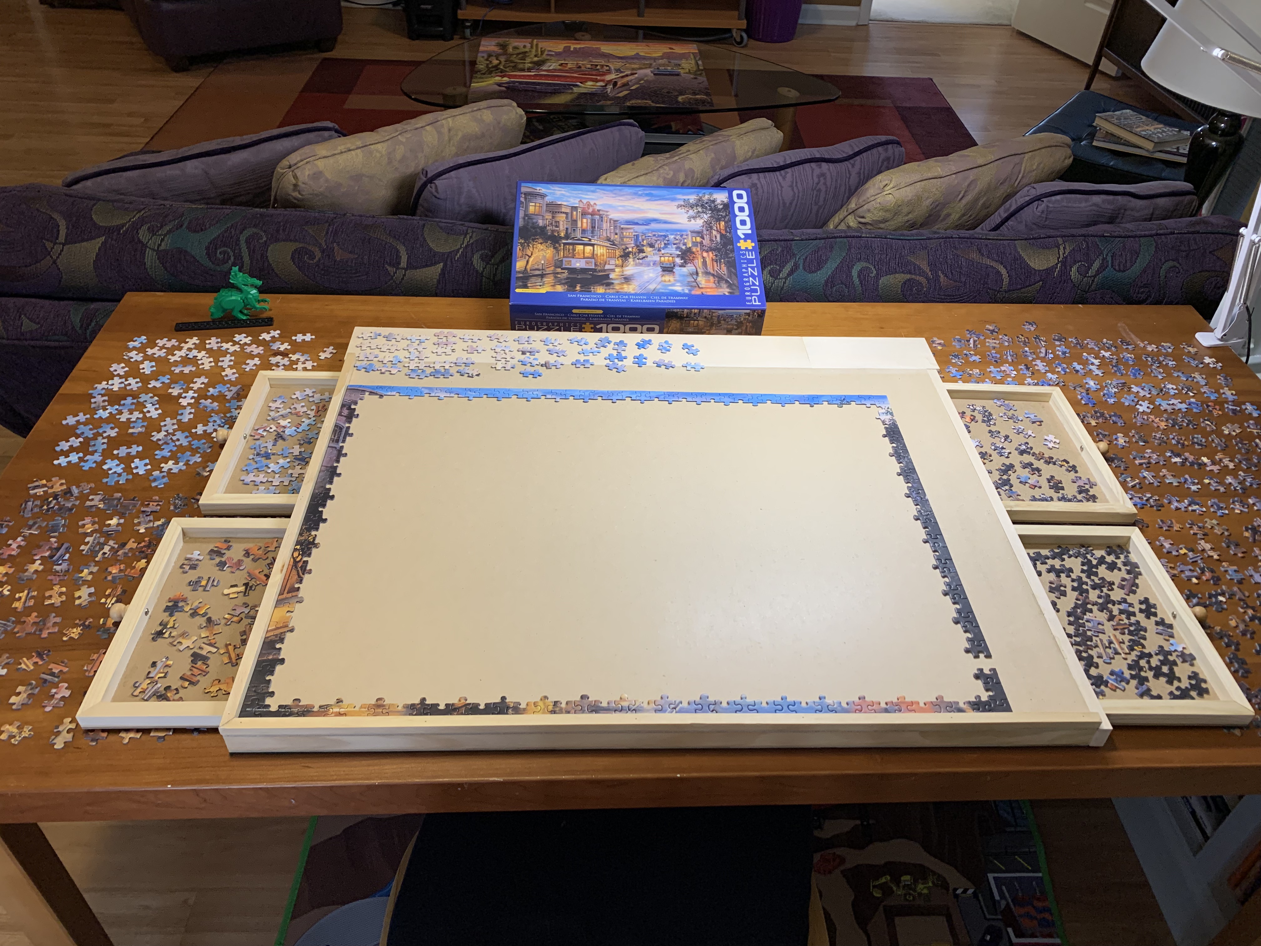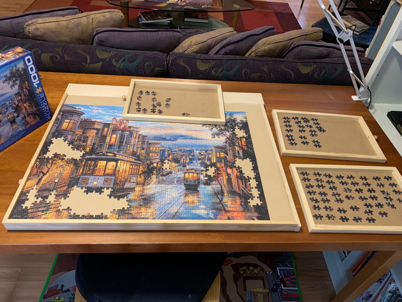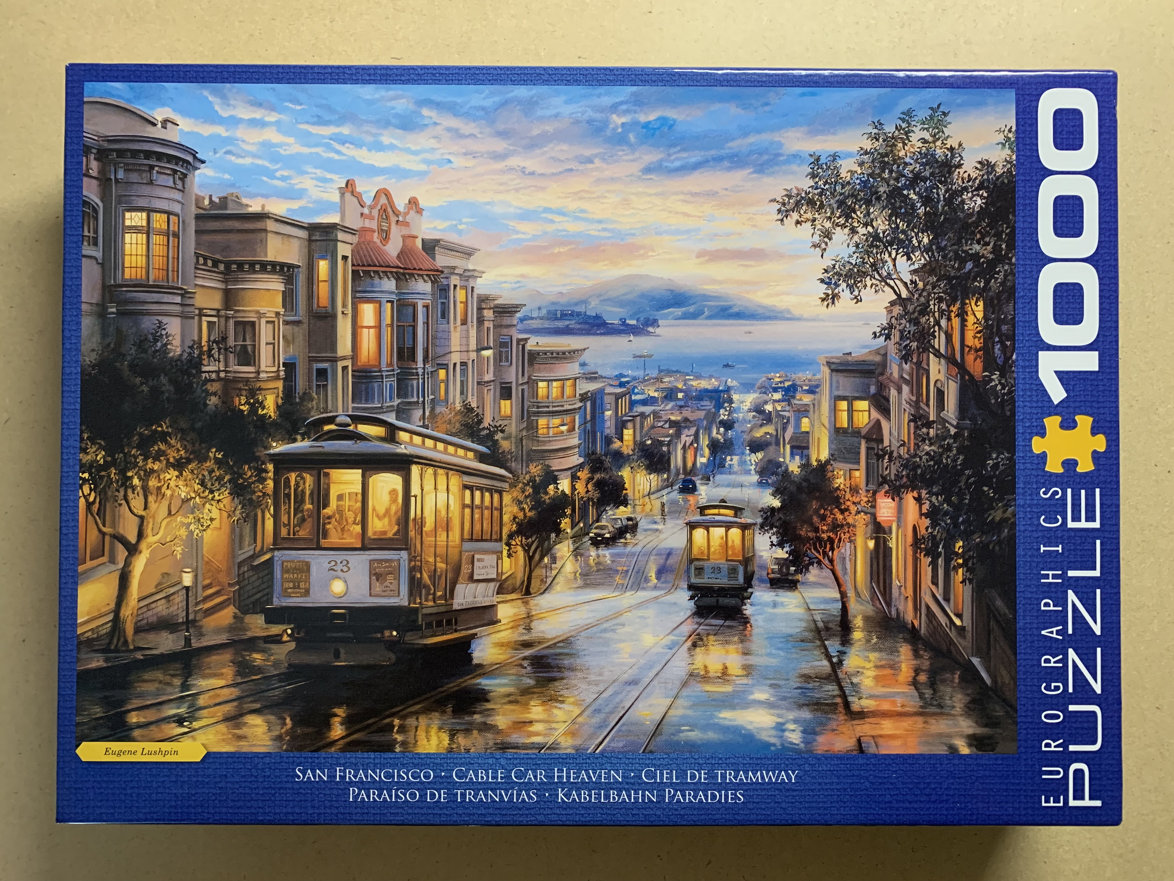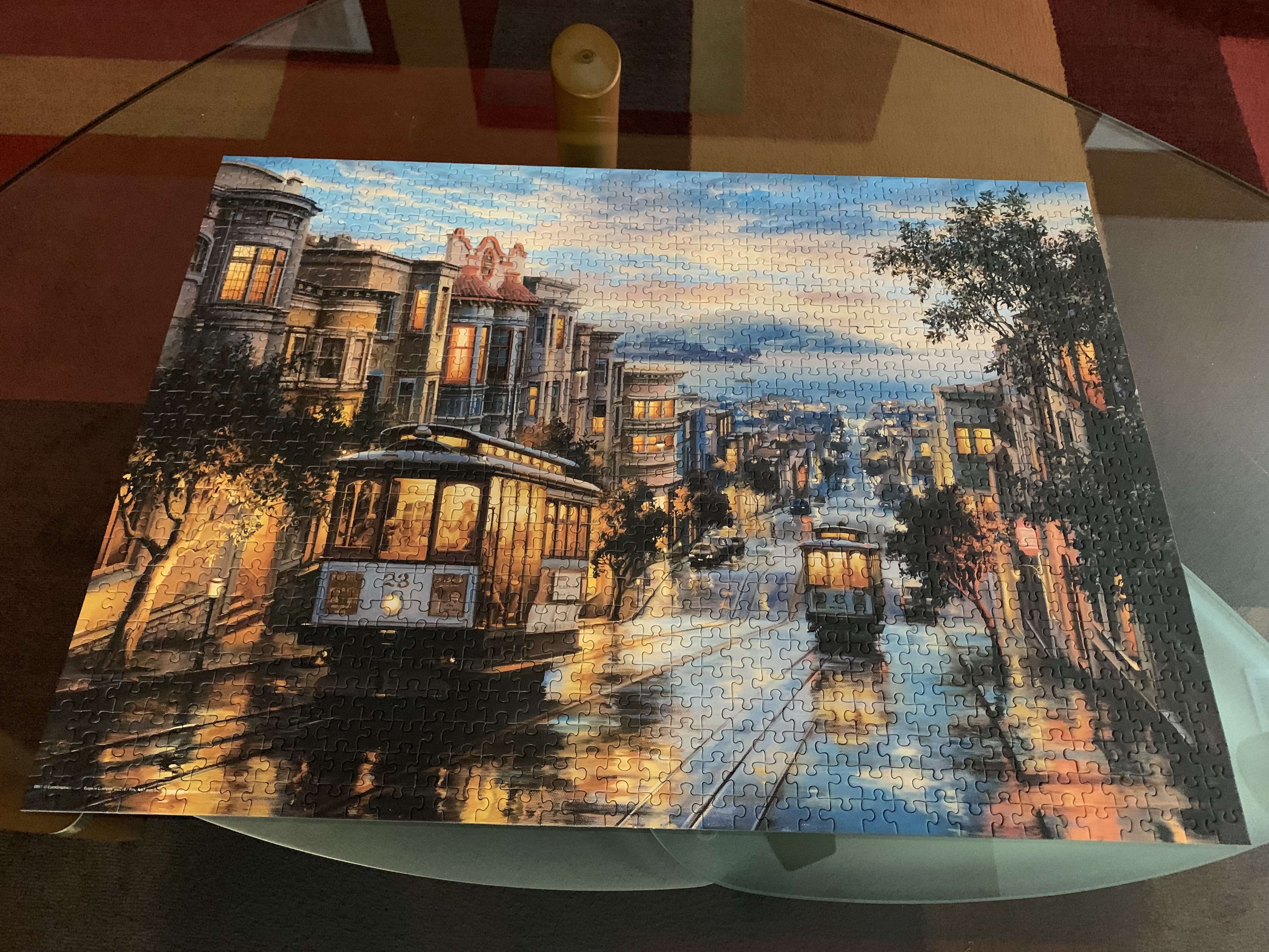 For my last puzzle, since the third one I had—also a Route 66 theme—was from the same manufacturer with the missing/extra piece, I chose to work on the puzzle my wife gave me for Christmas, one with a San Francisco theme.