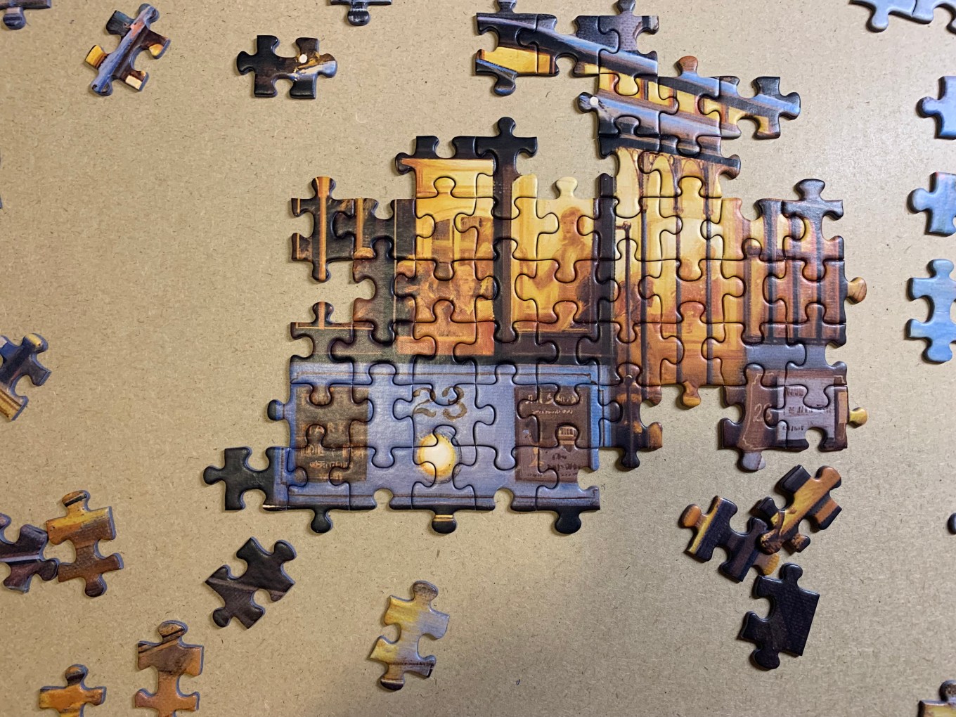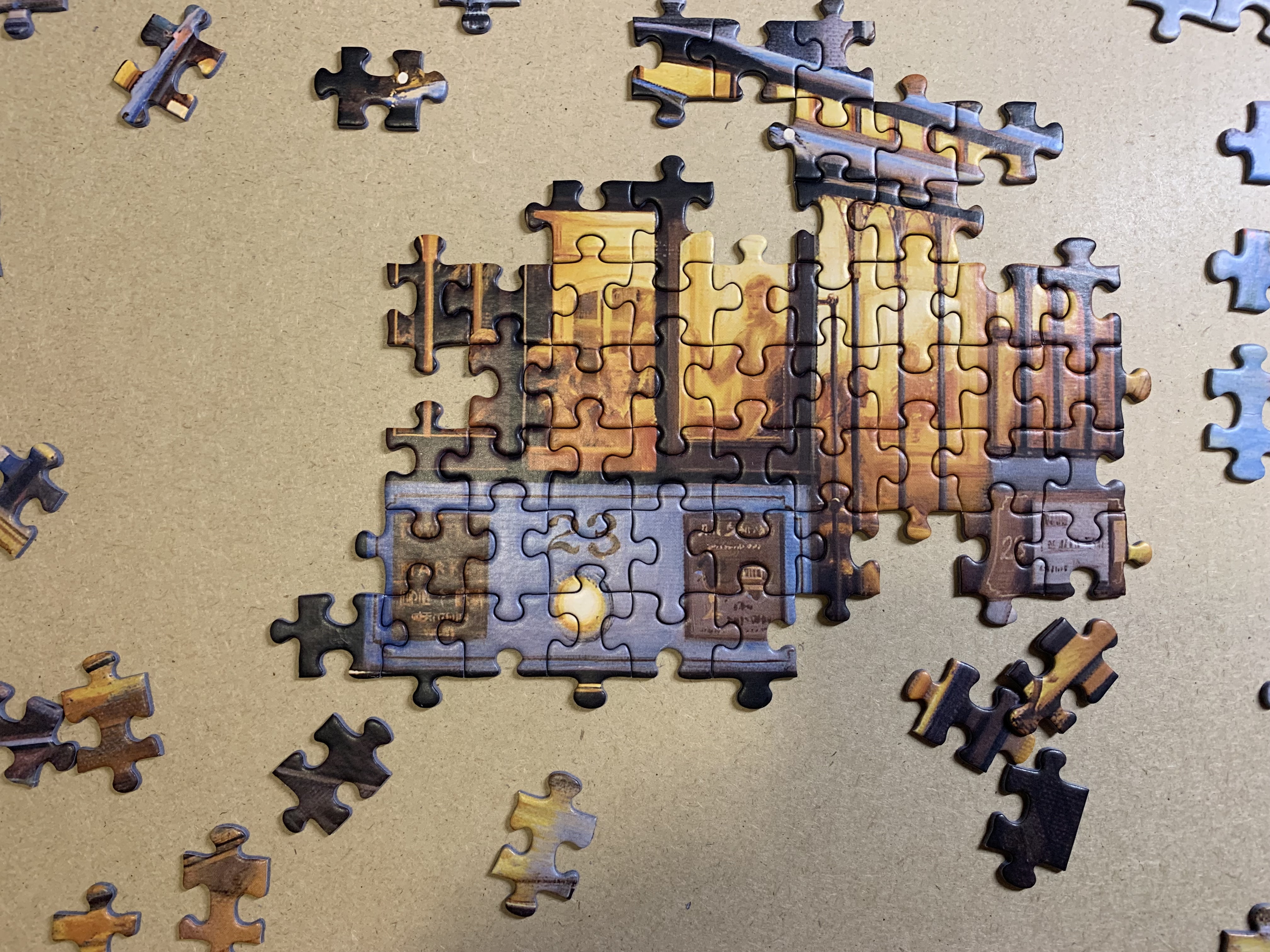 Surely, I couldn’t be so unlucky as to work on two puzzles in a row both with a missing piece. But since there were a lot of dark pieces where I hoped it could be hiding, I forged ahead.