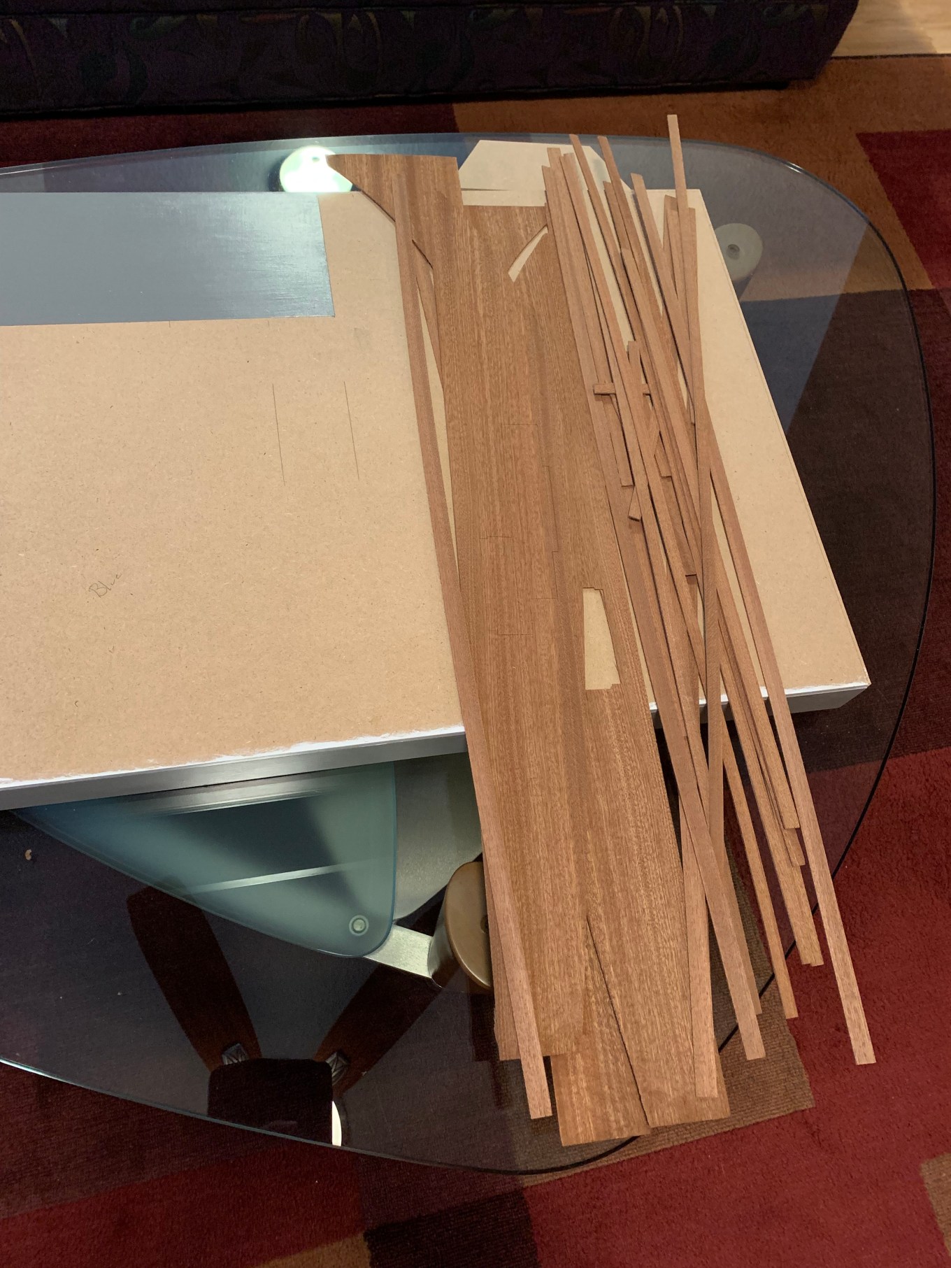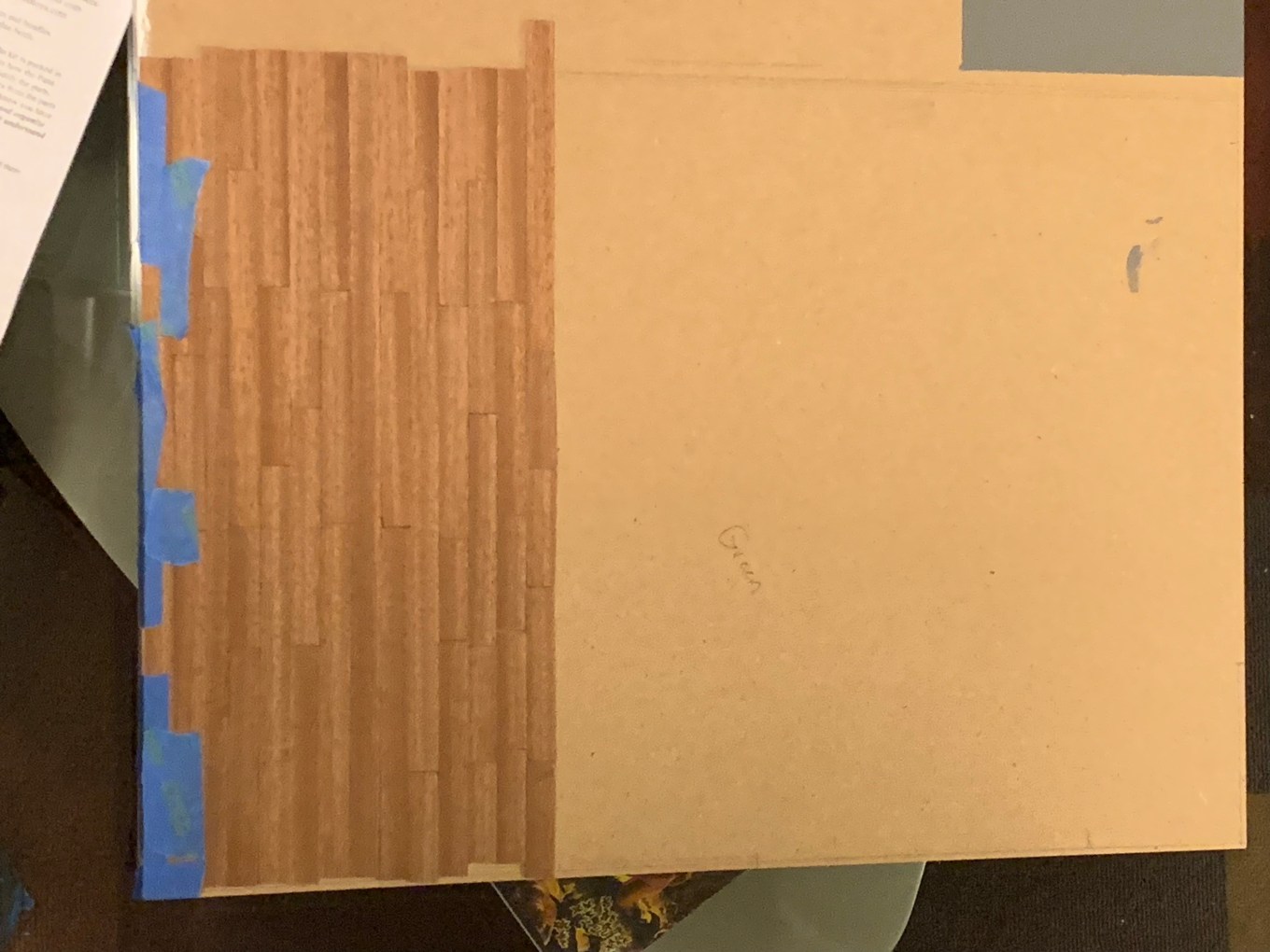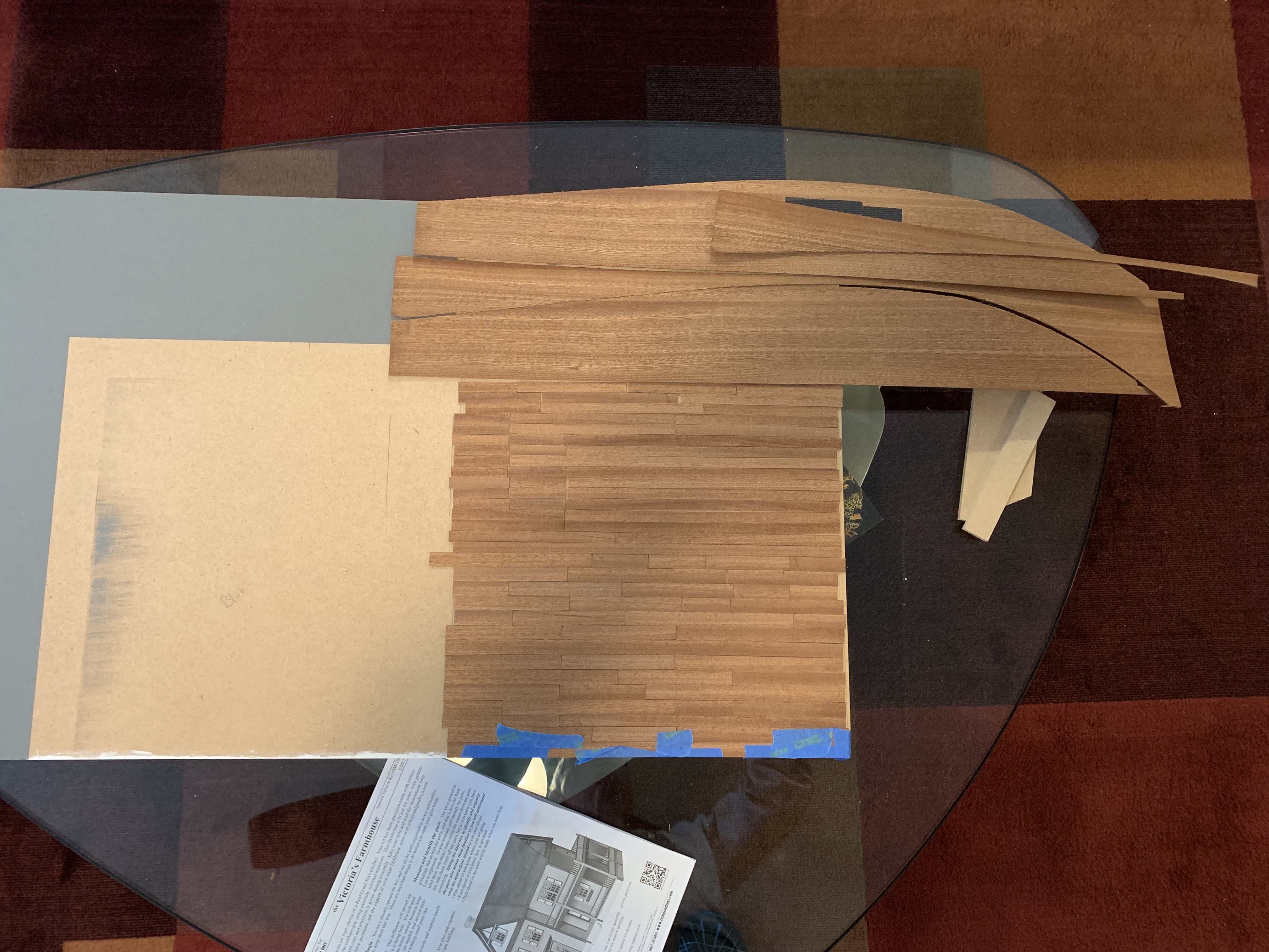 As I put all the left-over boat kit materials back in the box, I wondered what I should do with the left-over strips of real mahogany as they seemed too nice to just throw away. The kit had come with quite an excess to ensure that there would be plenty in case some strips were damaged or warped (as some were). When my sister said she wanted wooden floors to lay the rugs on, I realized here was a perfect use of that left over wood. I told her I had an idea that would provide real mahogany flooring in at least part of the house.