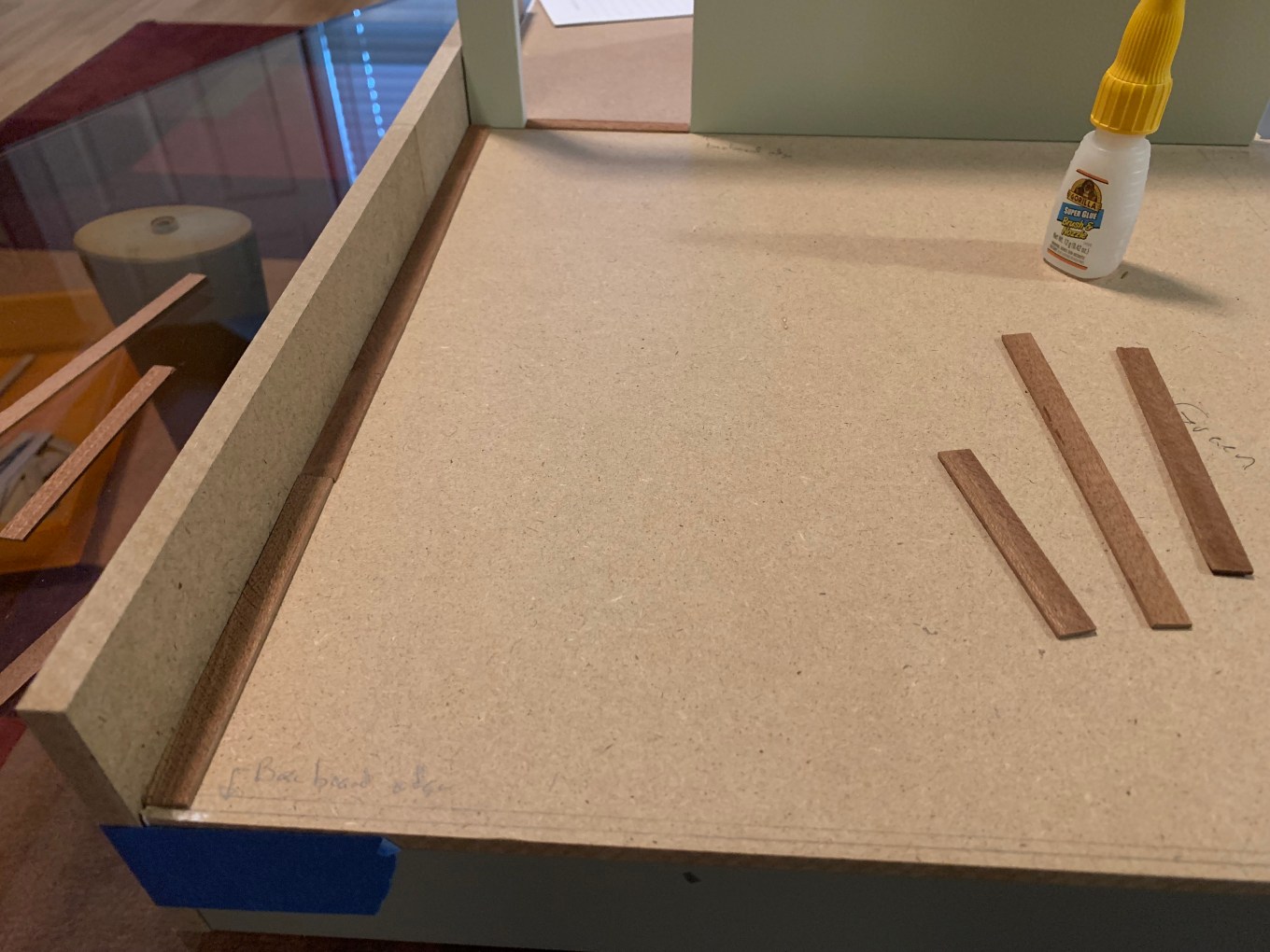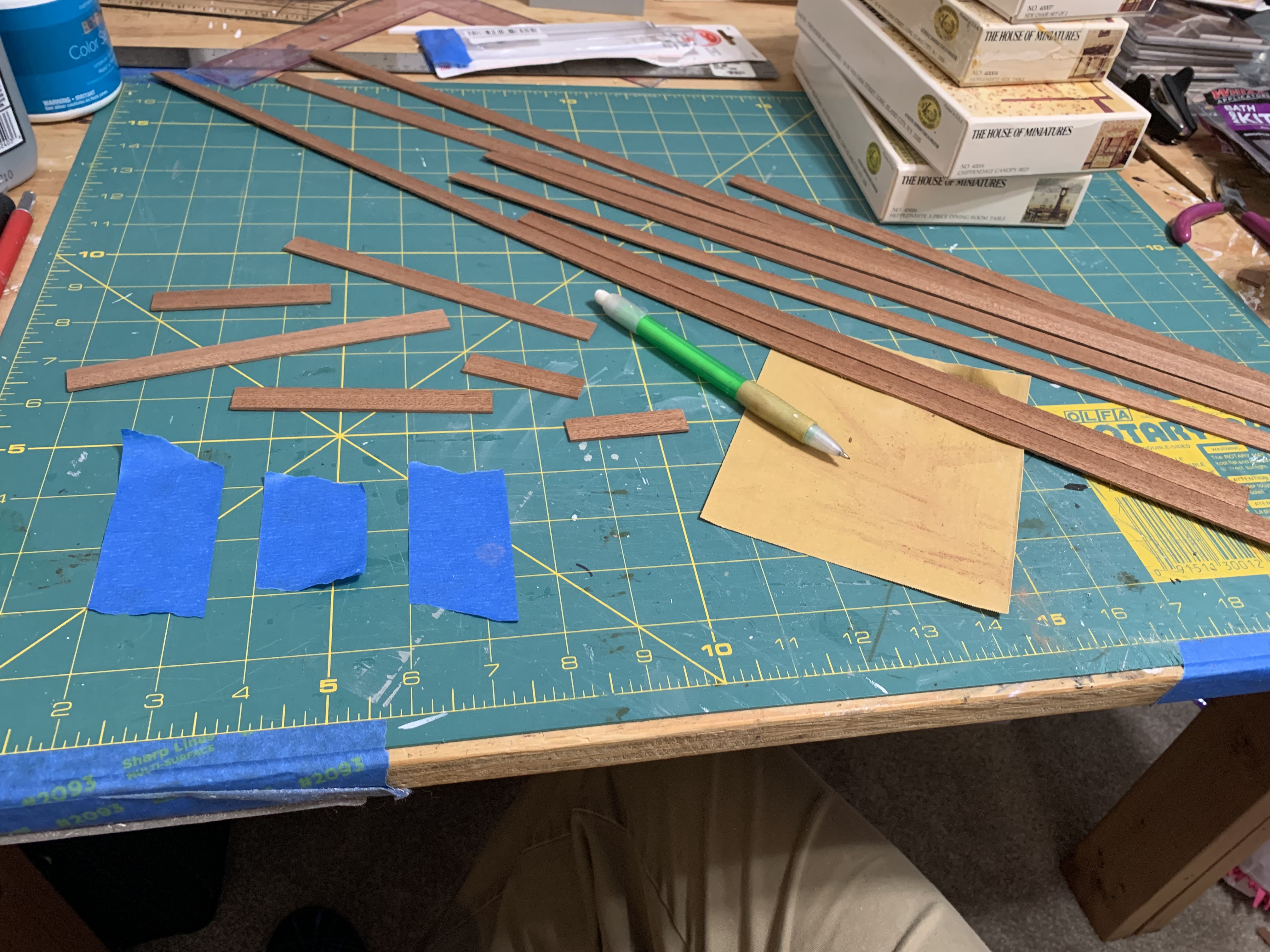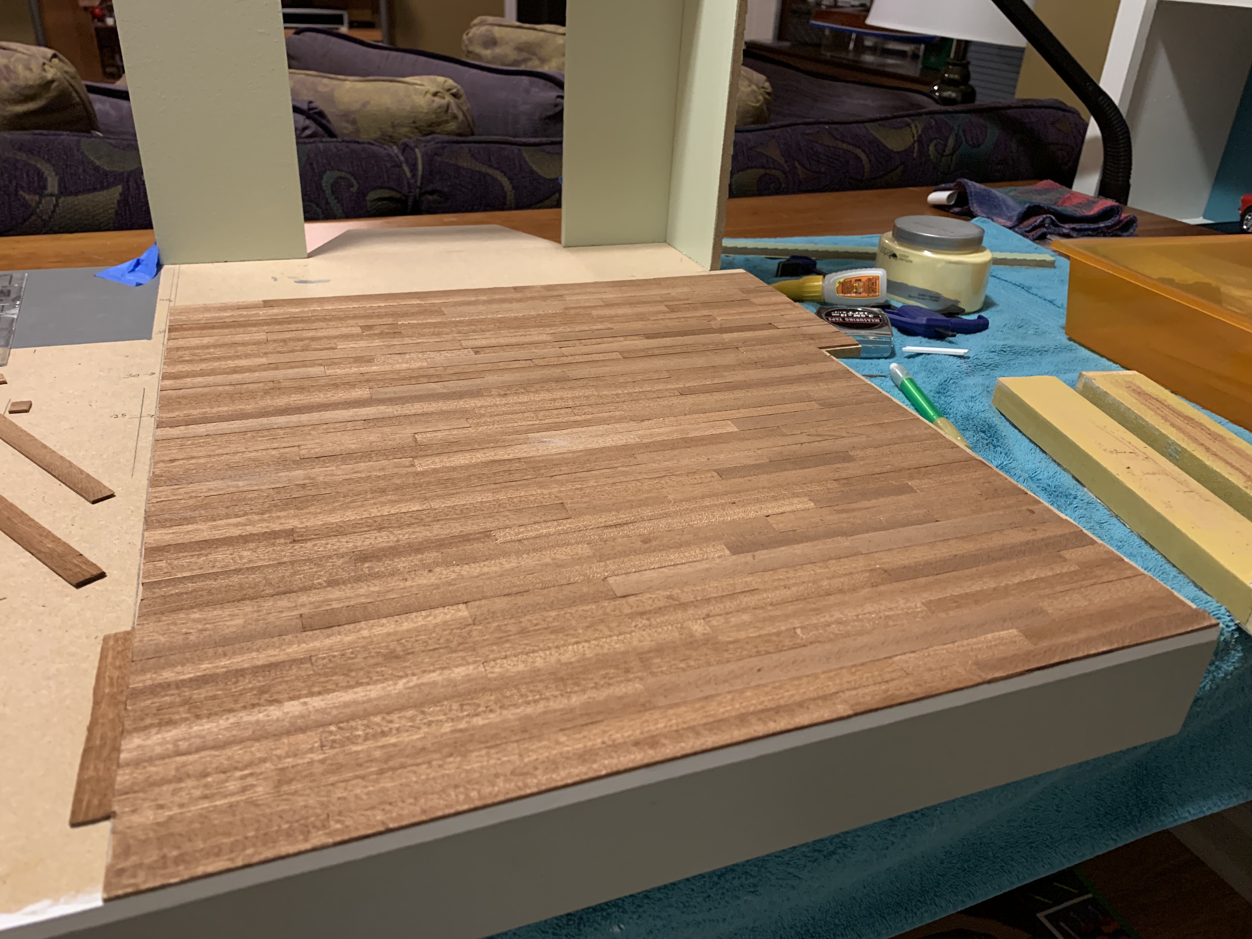 The boat kit had come with two different widths of mahogany strips, 1/2-inch and 3/8-inch and I needed to use both to have enough for this room (hereafter referred to as wide for the 1/2-inch and narrow for the 3/8-inch).